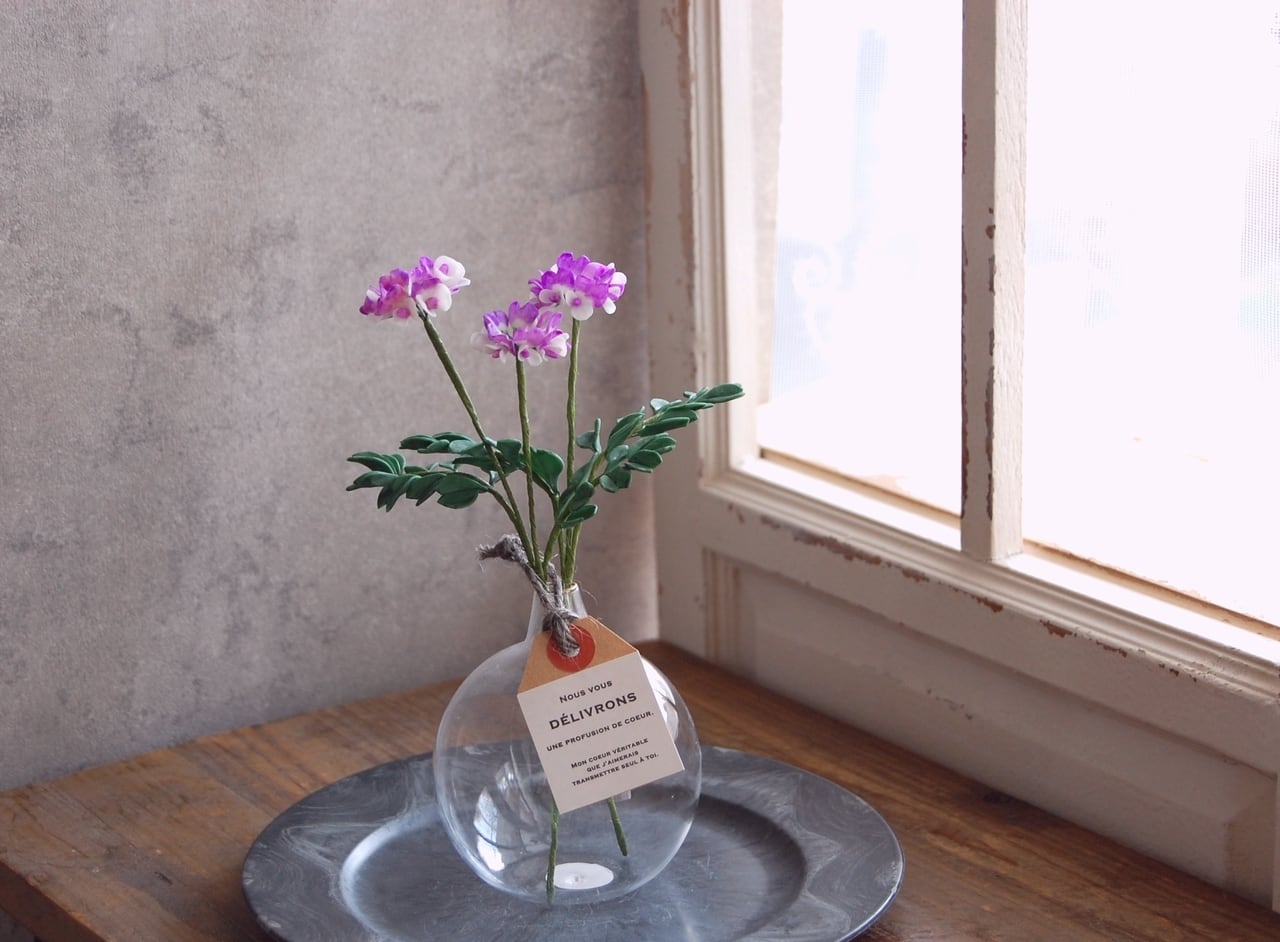 粘土でれんげを作り、エレガントでシンプルなホルムのベースに飾りました。