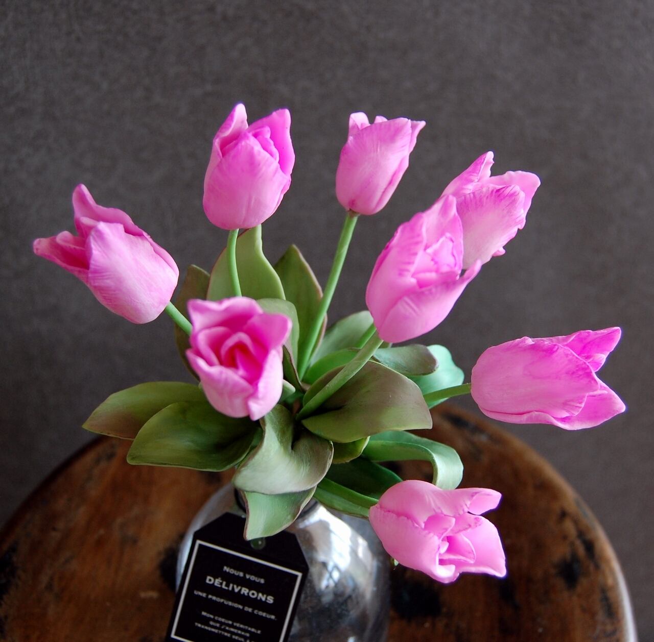 粘土でチューリップを作り、ぽってりとしたシンプルなガラスボトルに飾りました。
