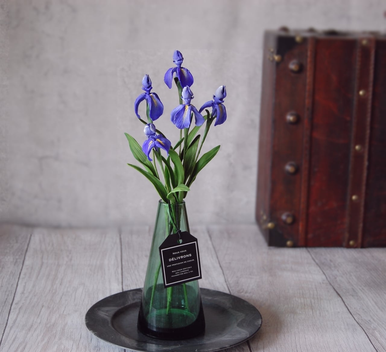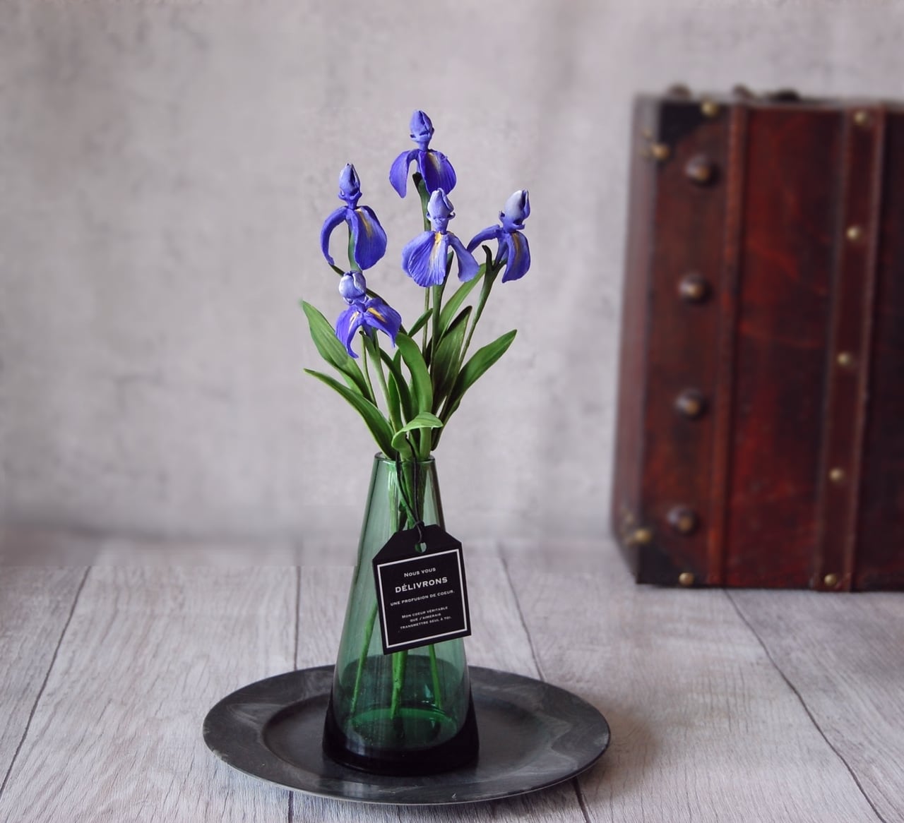 ◆粘土のお花◆ 菖蒲(あやめ) グリーンガラスボトル A660
