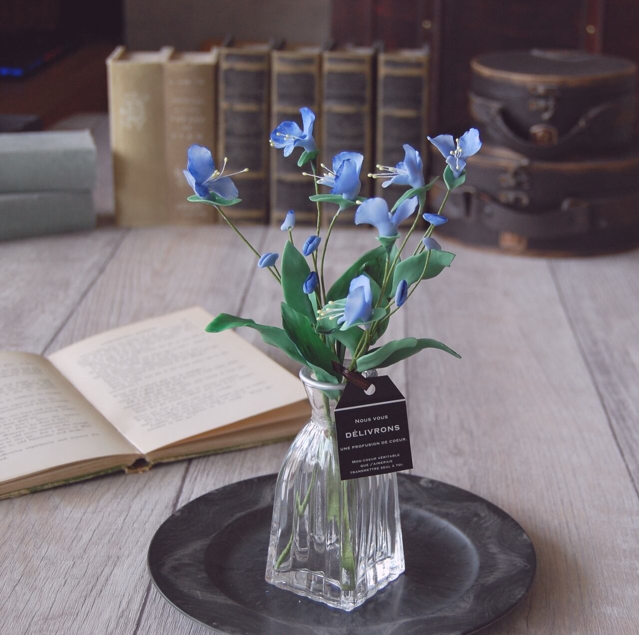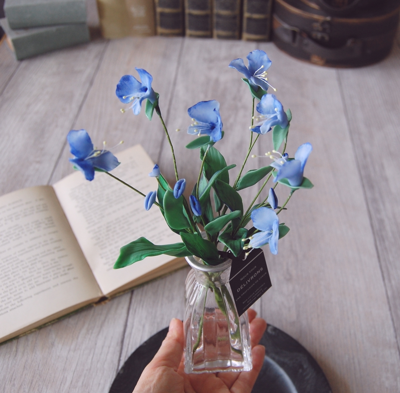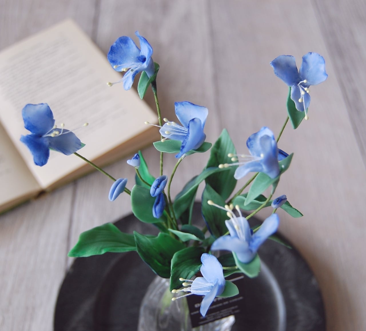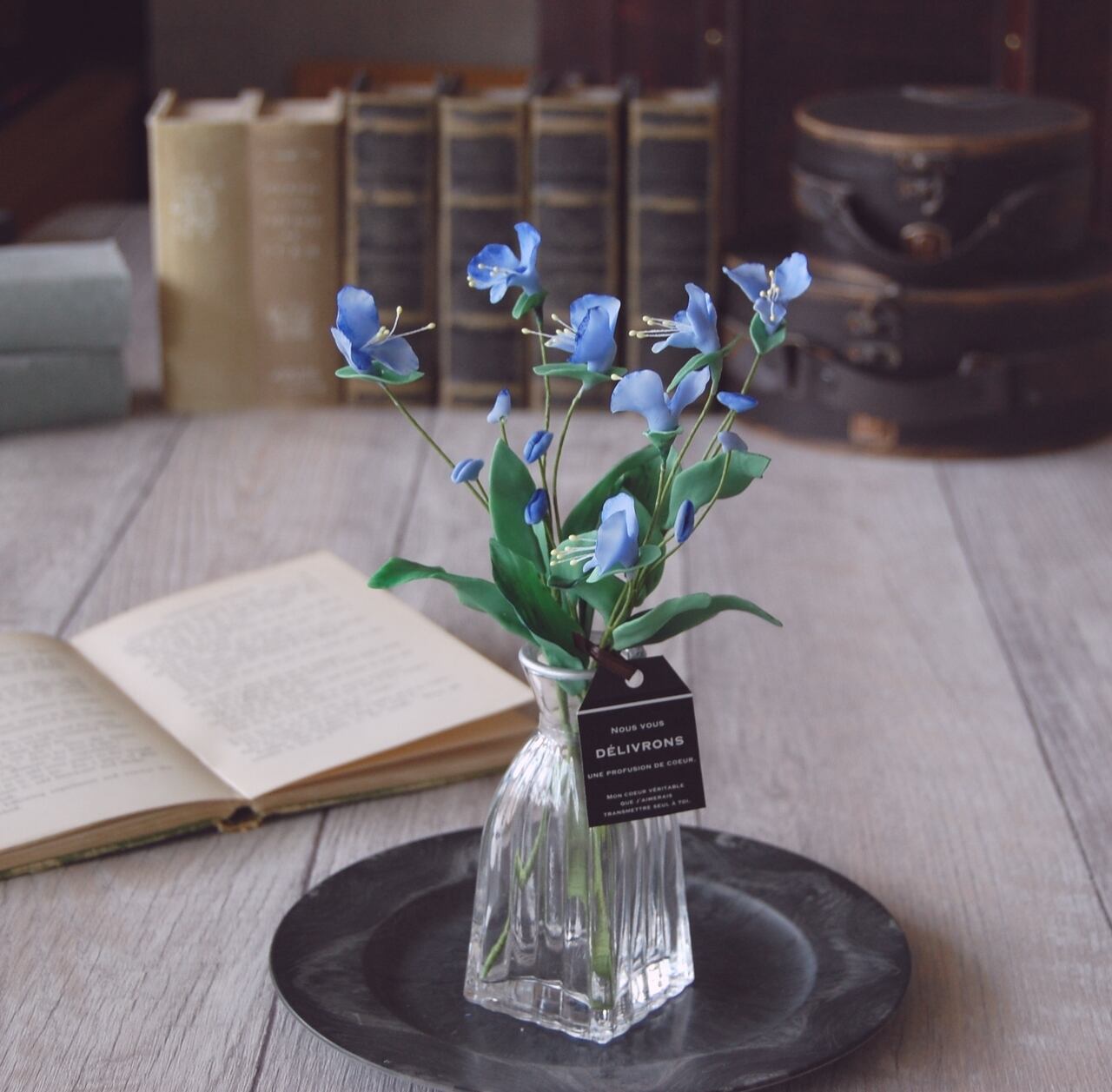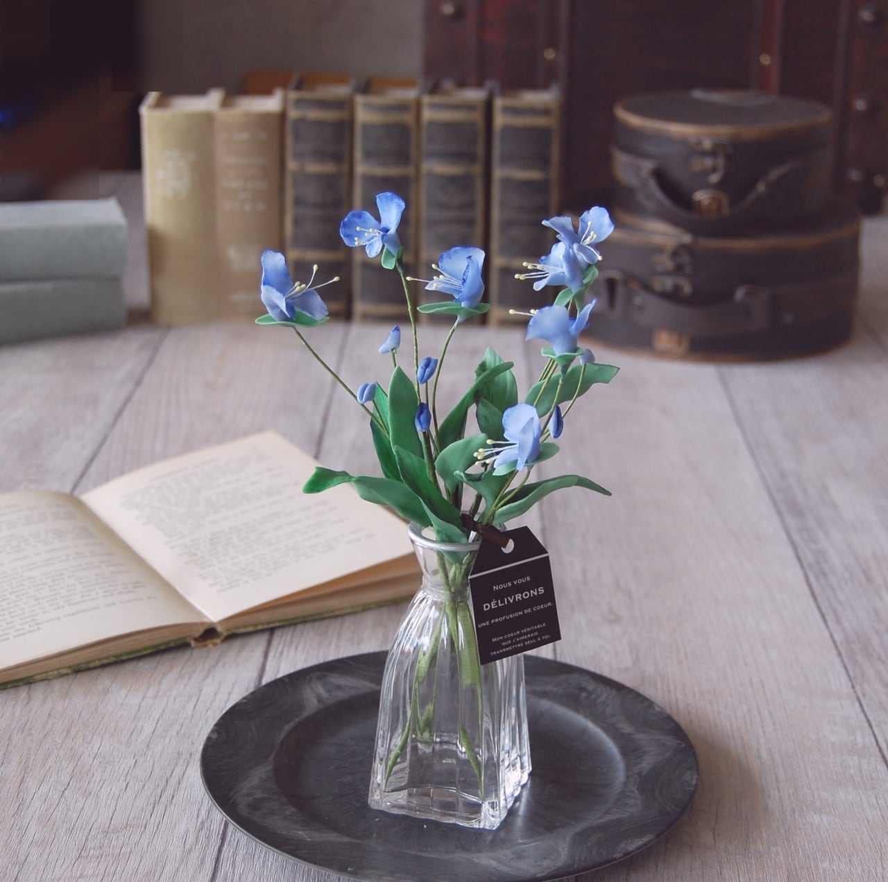 粘土でツユクサを制作し、おしゃれなシルバーリム・スリムシングルベース に飾りました。クリアーカラーの可愛いベースです。