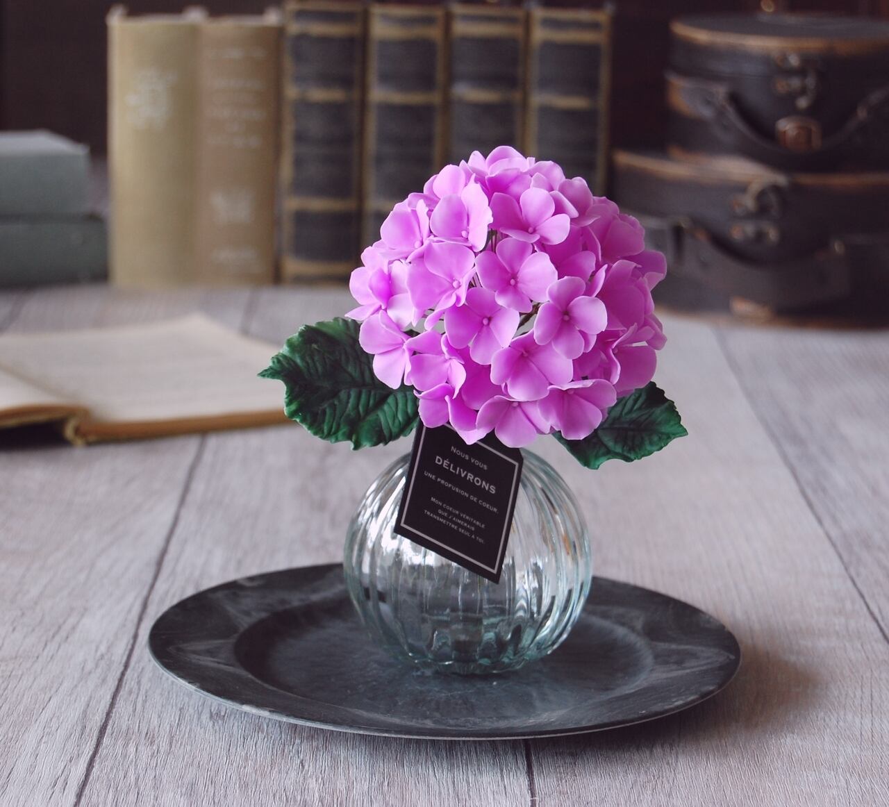 粘土で紫陽花を作り、ぽってりとした可愛いガラスボトルに飾りました。