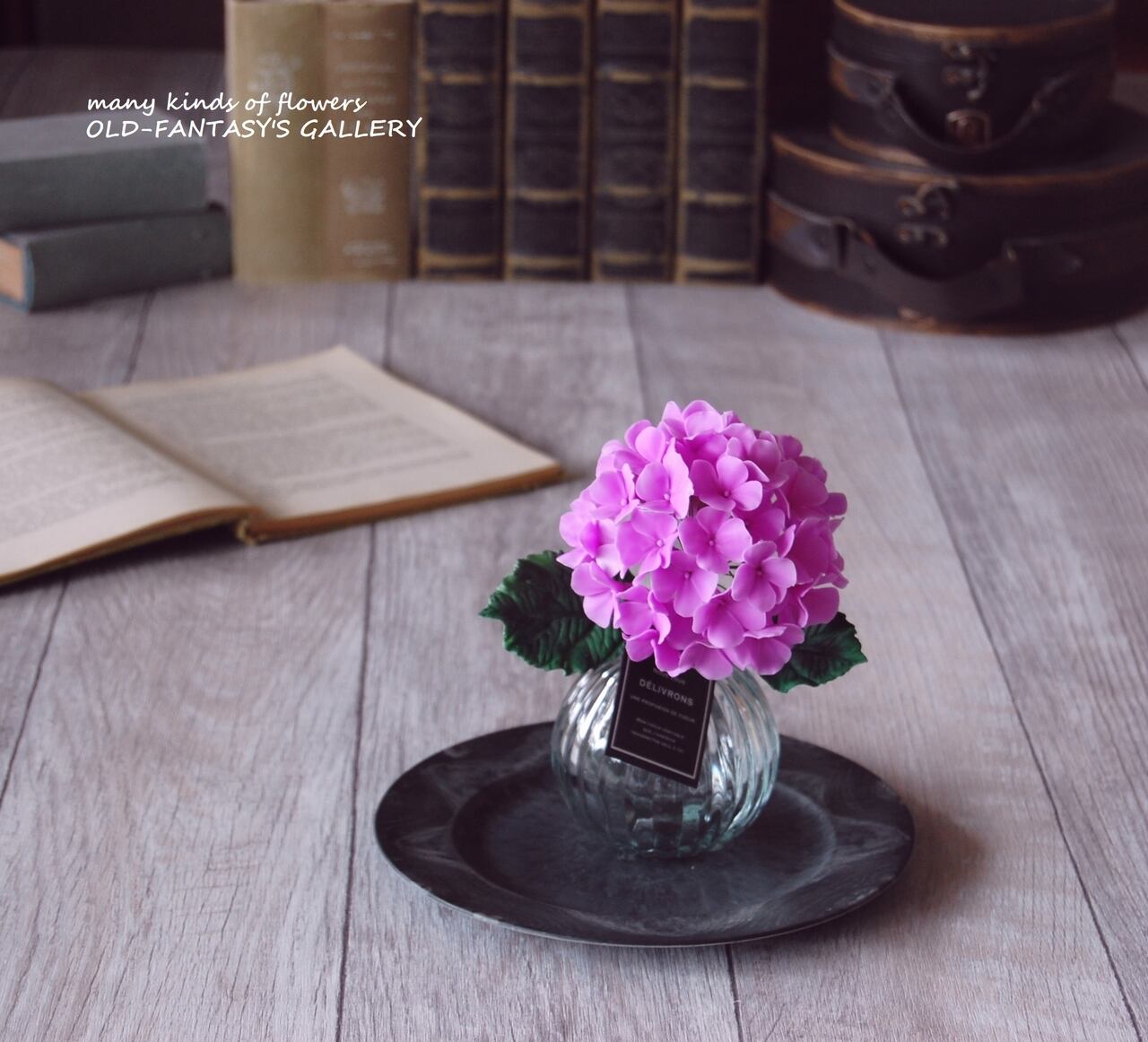 ◆粘土のお花◆ 紫陽花をぽってりガラスボトルに飾って・・・赤紫 高さ約16センチ A679