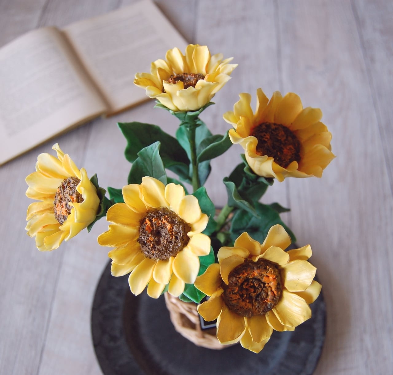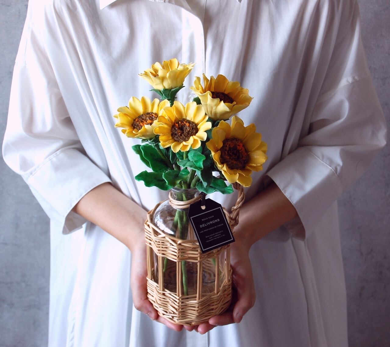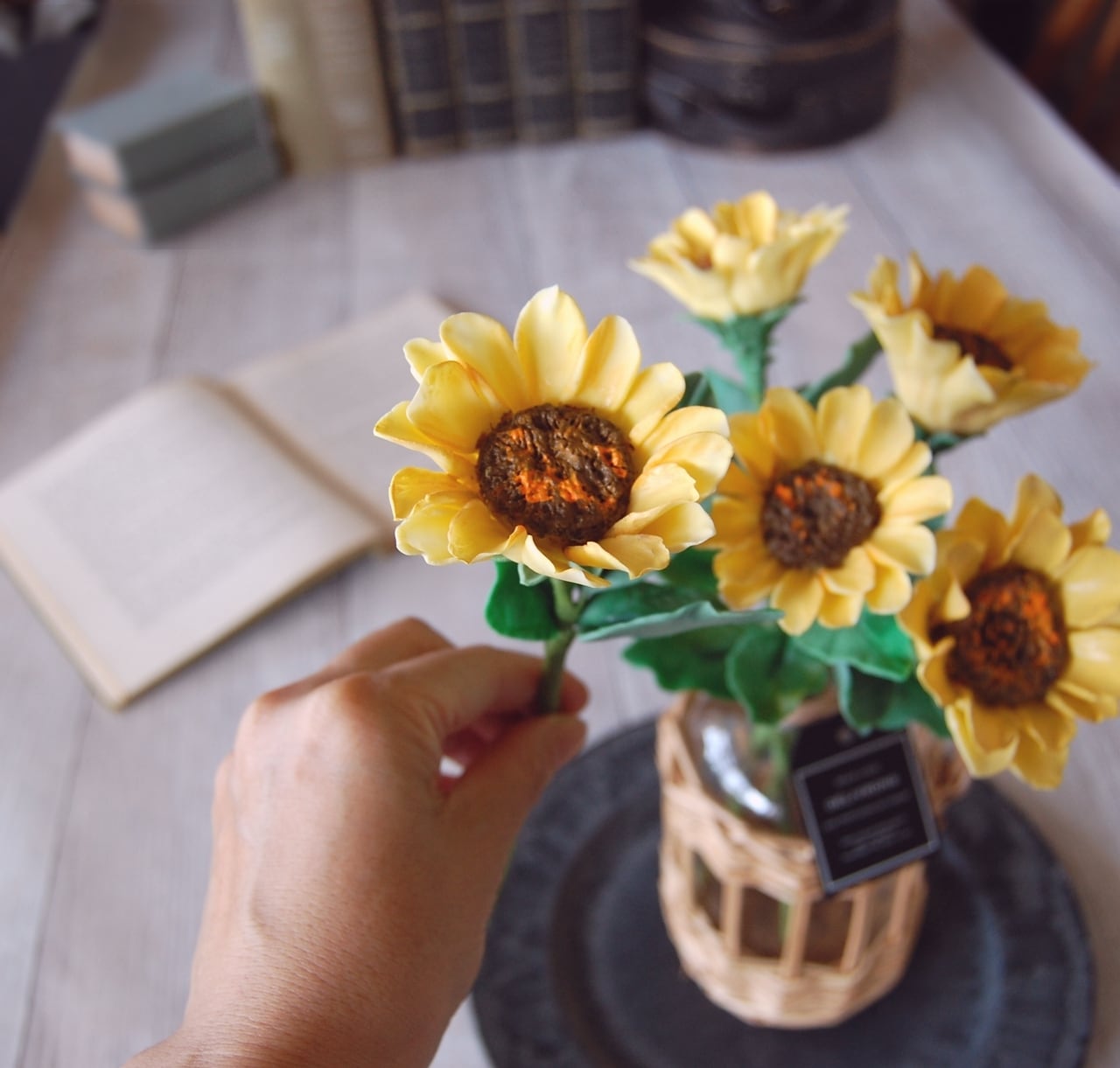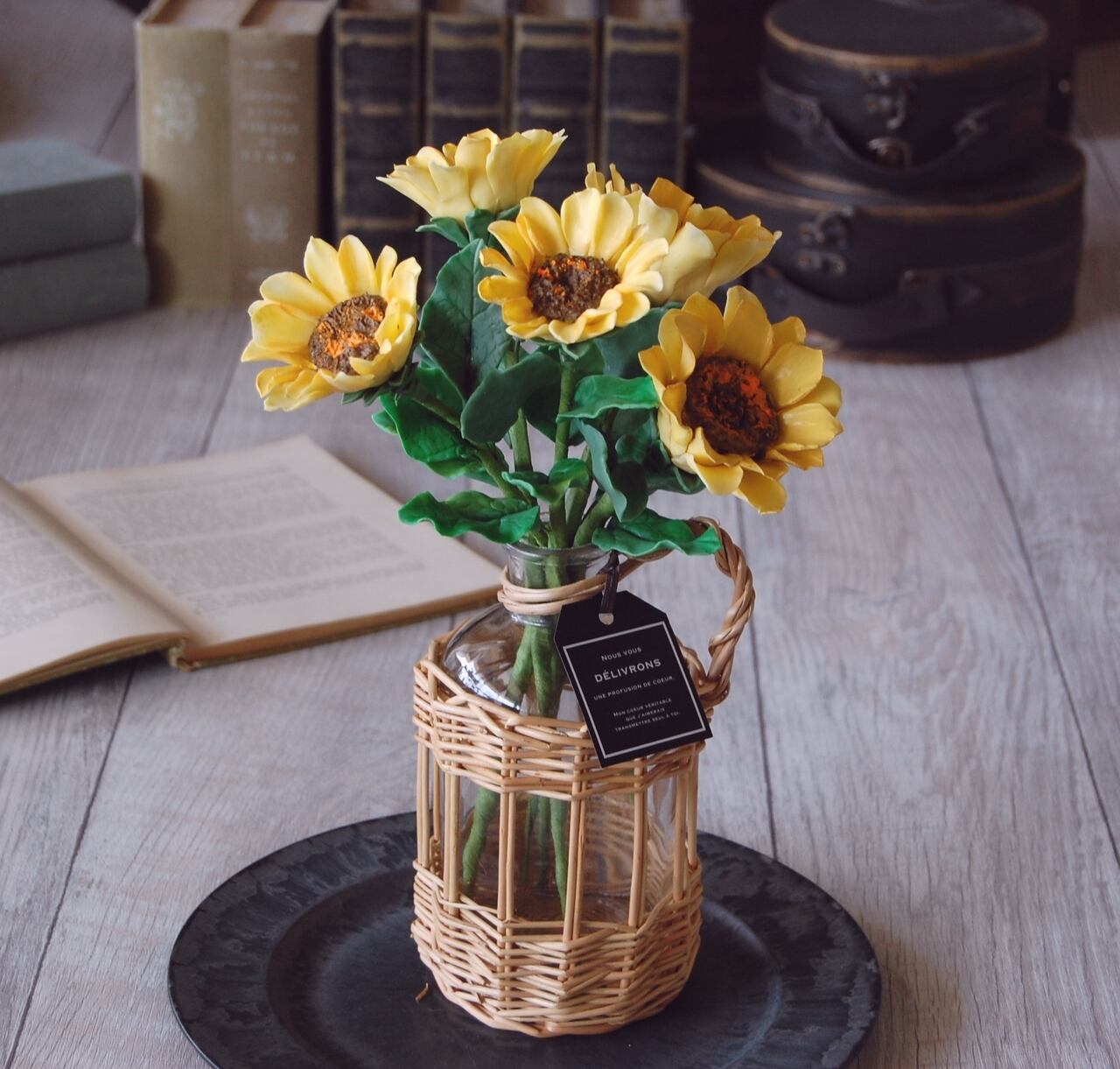 粘土で花びら一枚一枚を伸ばしてミニサイズのひまわりを作り、ラタン(籐)ガラスボトルに生けました。