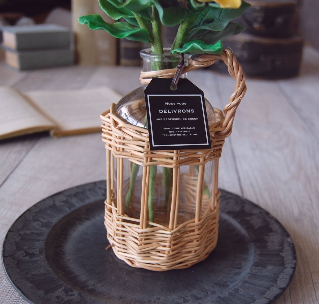 ガラスボトルの上にラタンをハンドメイドで編み込んだフラワーベースです。