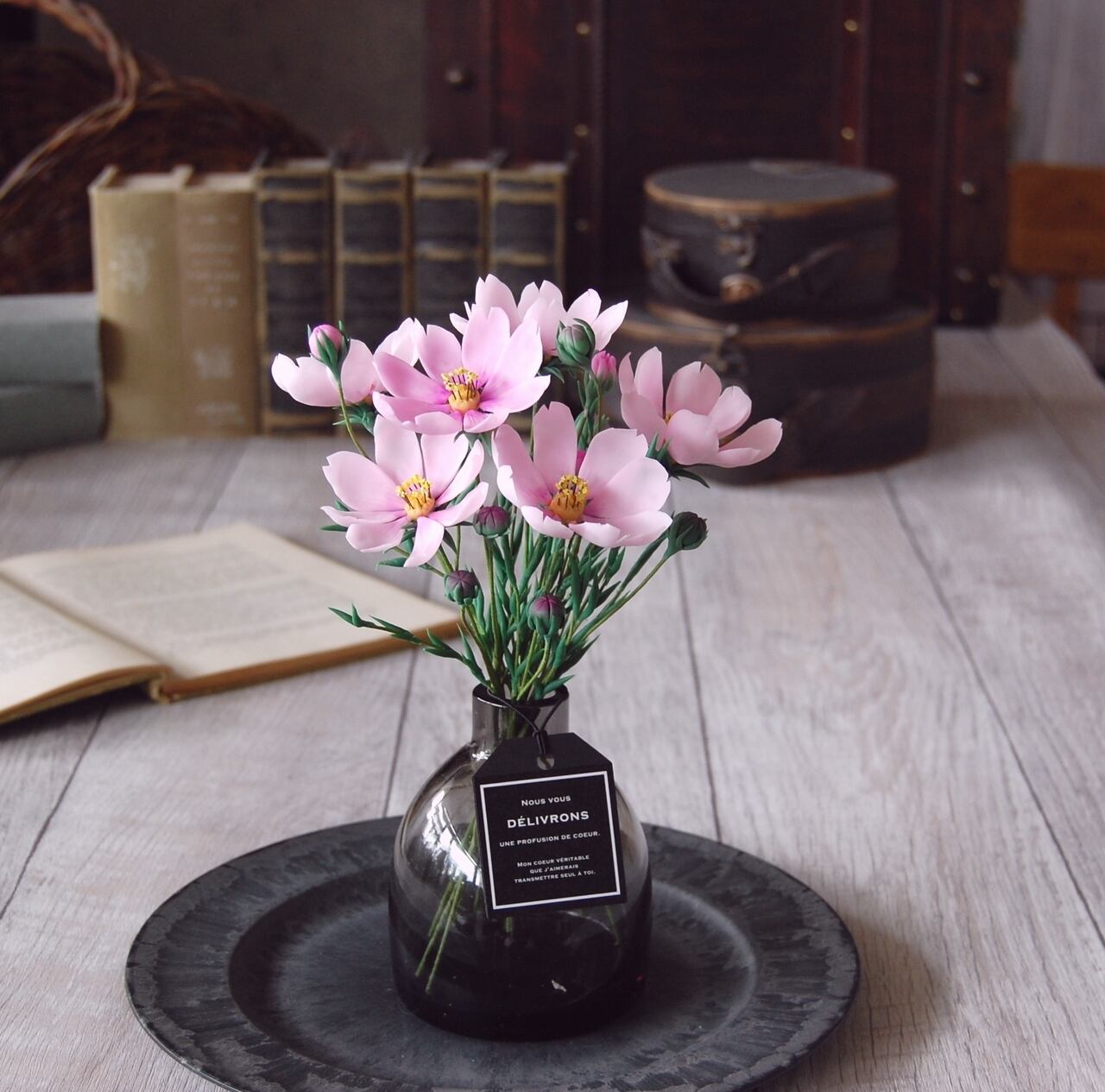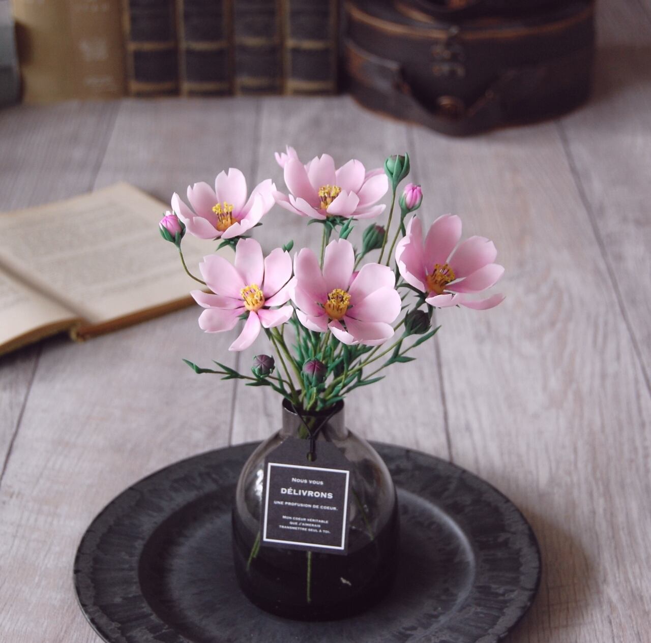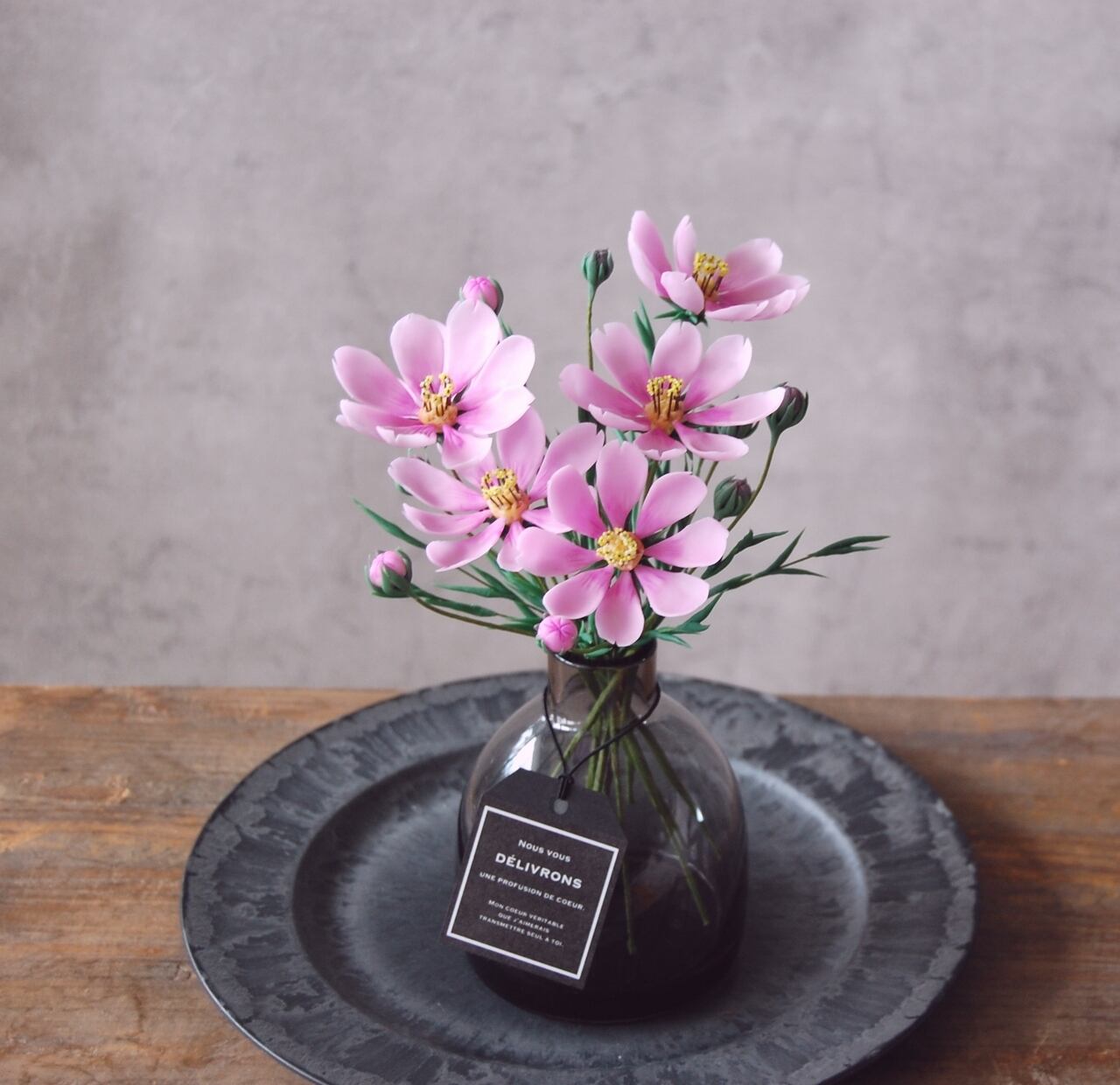◆粘土のお花◆ コスモス・・・ライトピンク 高さ約23センチ ブラックボトル K692