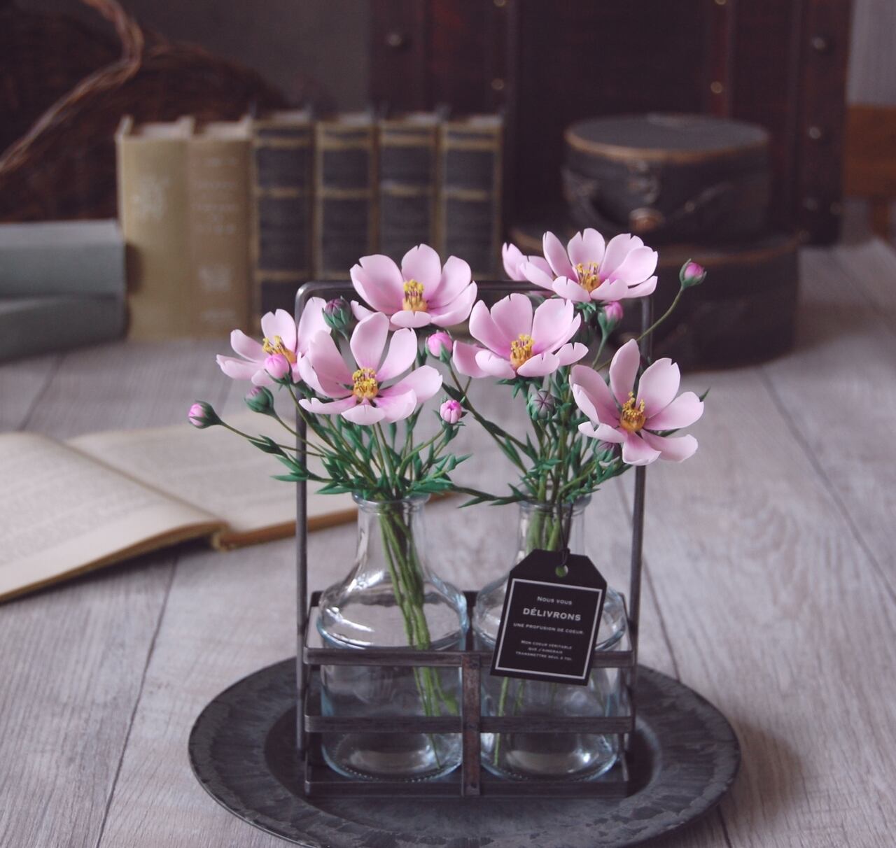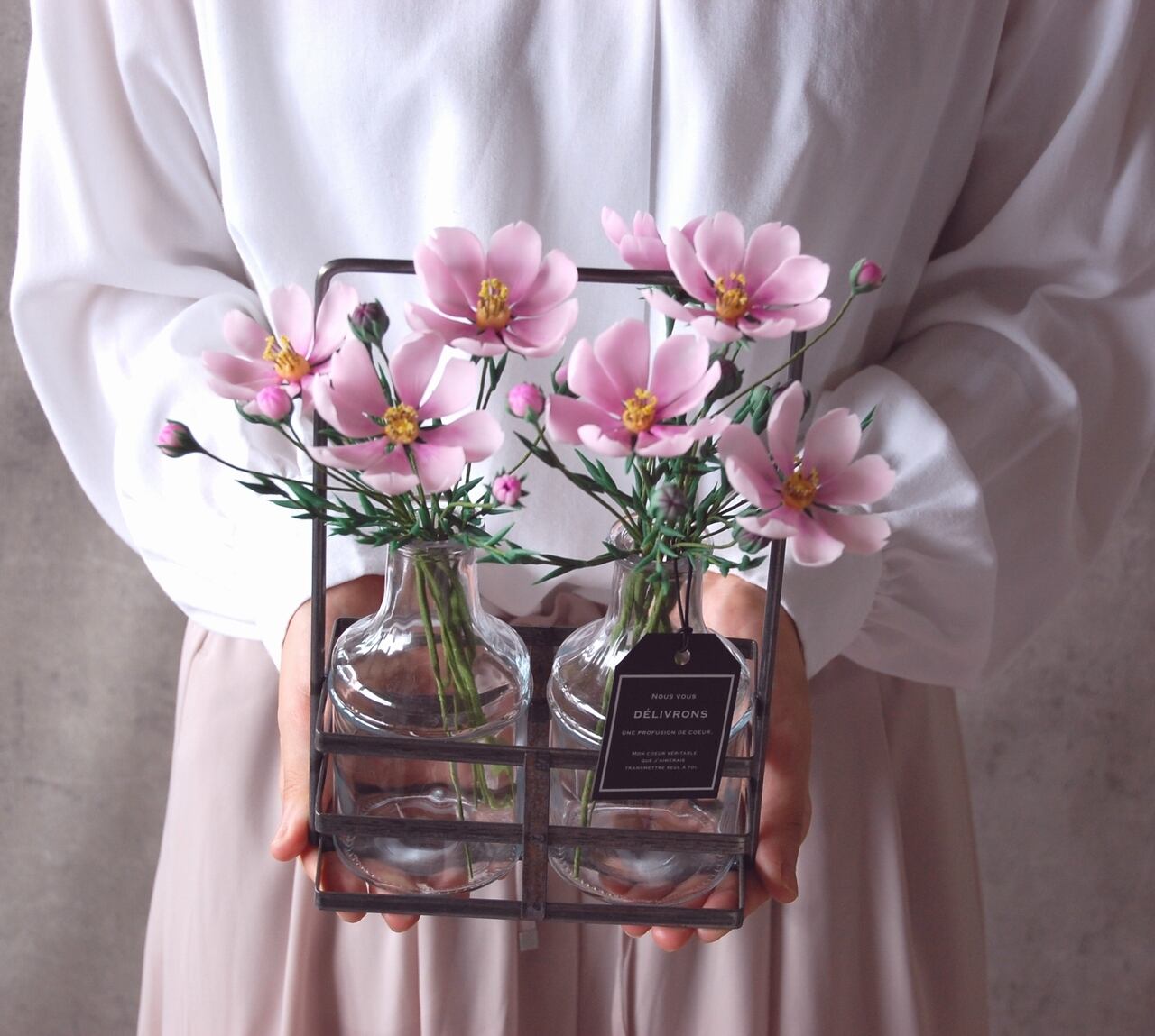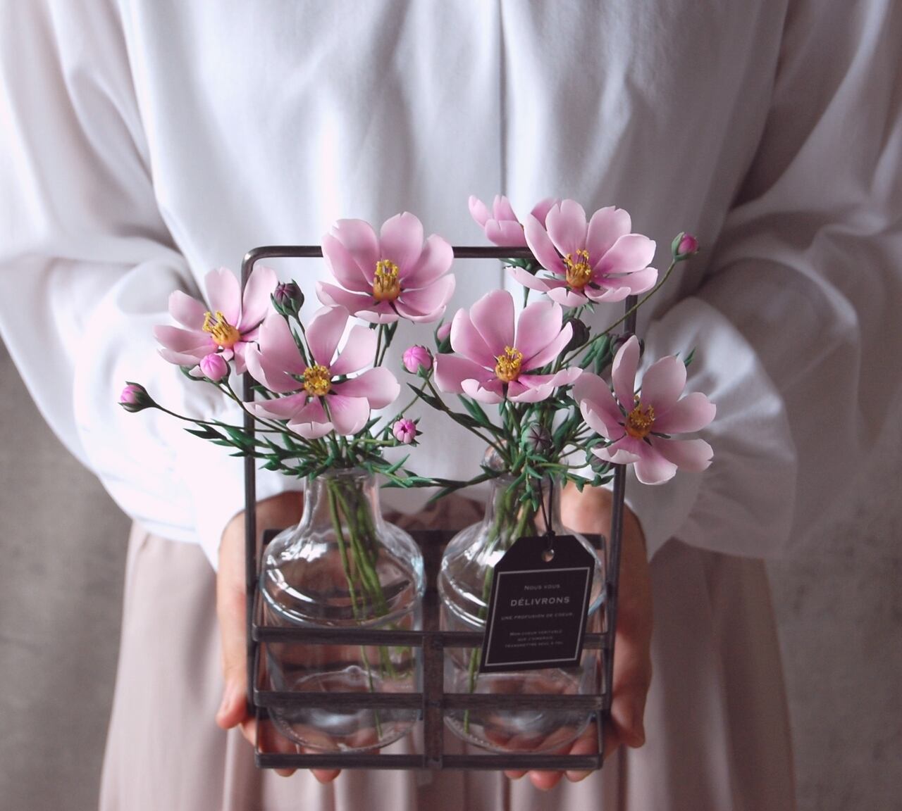 粘土でコスモスを作り、たっぷりと7輪、アイアンホルダーに入ったボトルにたっぷりと生けました。小さなコーナーや出窓など、ちょっとしたスペースに置いていただけるだけで、魅力的なインテリアになるおしゃれなアイアンホルダーです。