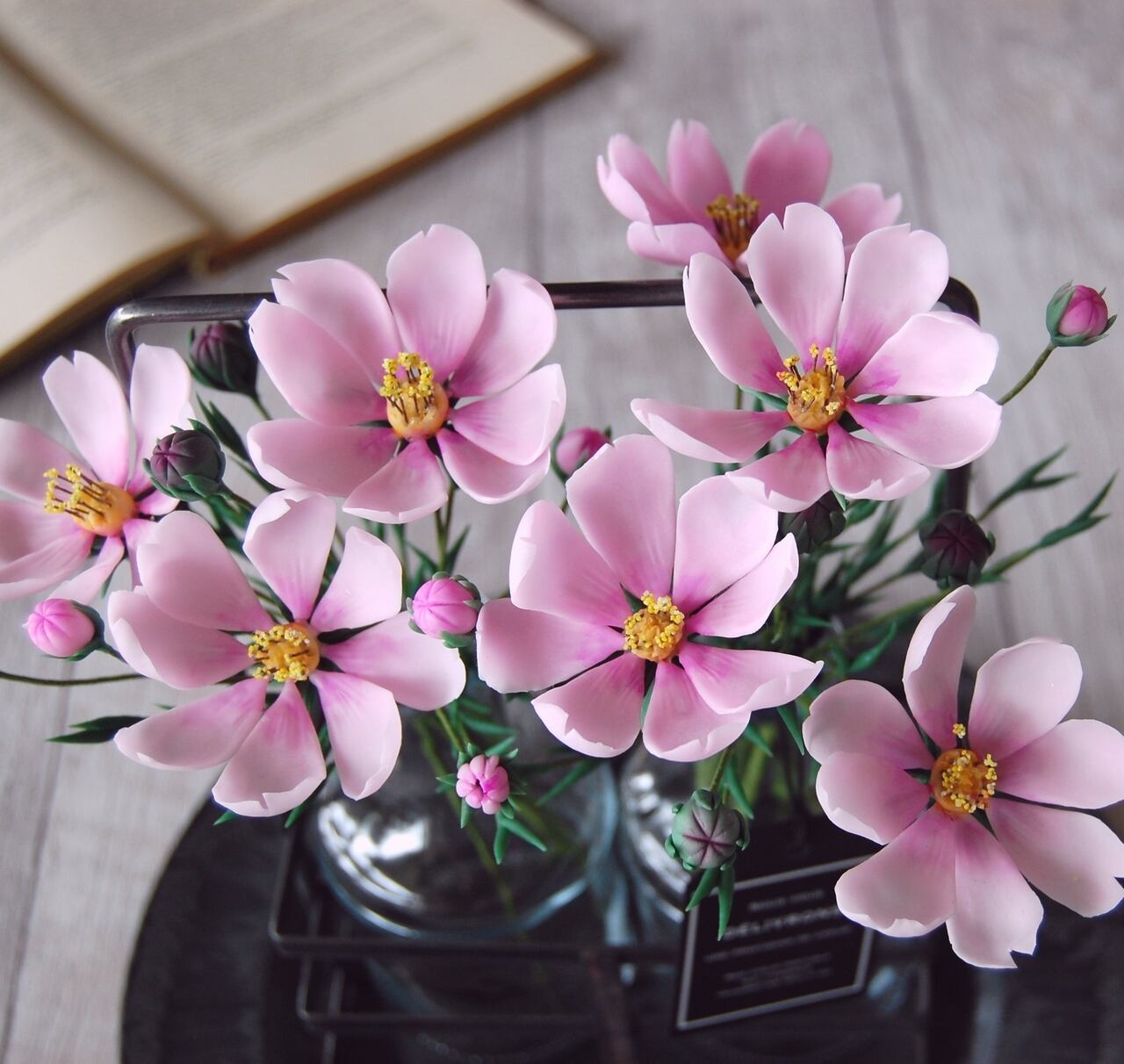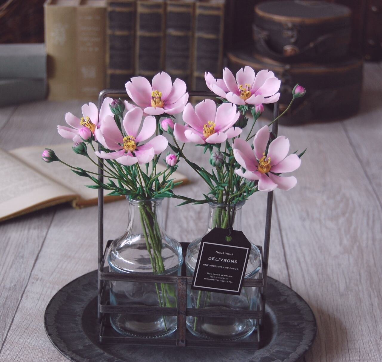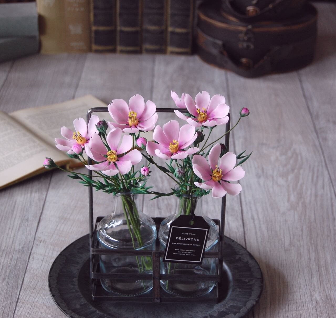 粘土でコスモスを作り、たっぷりと7輪、アイアンホルダーに入ったボトルにたっぷりと生けました。小さなコーナーや出窓など、ちょっとしたスペースに置いていただけるだけで、魅力的なインテリアになるおしゃれなアイアンホルダーです。