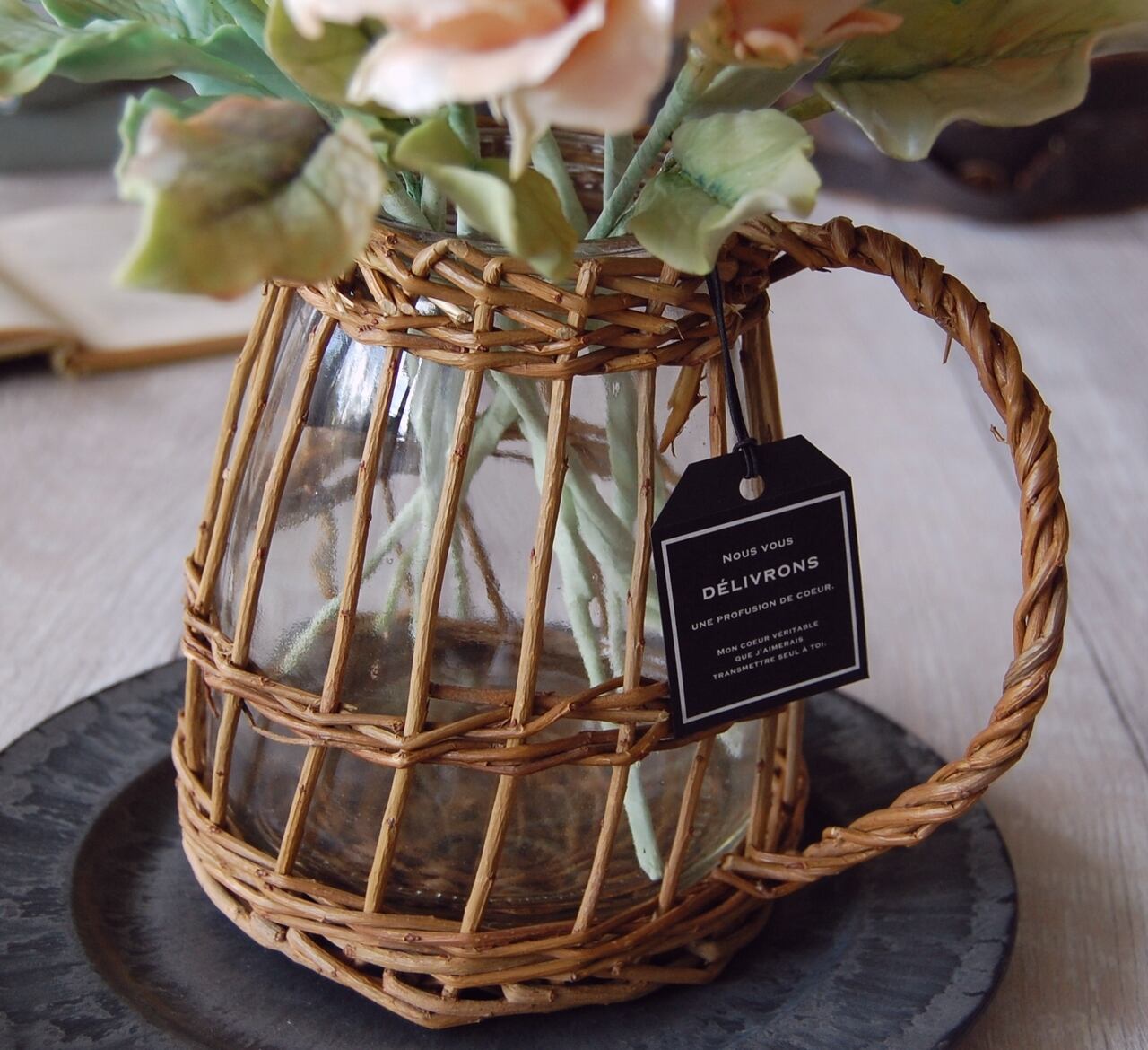 ※籐のフラワーピッチャーはハンドメイドの為、仕上がりのサイズや曲がり具合、ガラスの厚みなどが商品毎に異なります。また、天然素材の為、色に個体差がございます。編み込んだ部分が折れていたり、編み終わりが外側に出ている場合がございます。その他、木の皮の剥げ、ささくれ、黒ずみがある場合がございますがご了承ください。