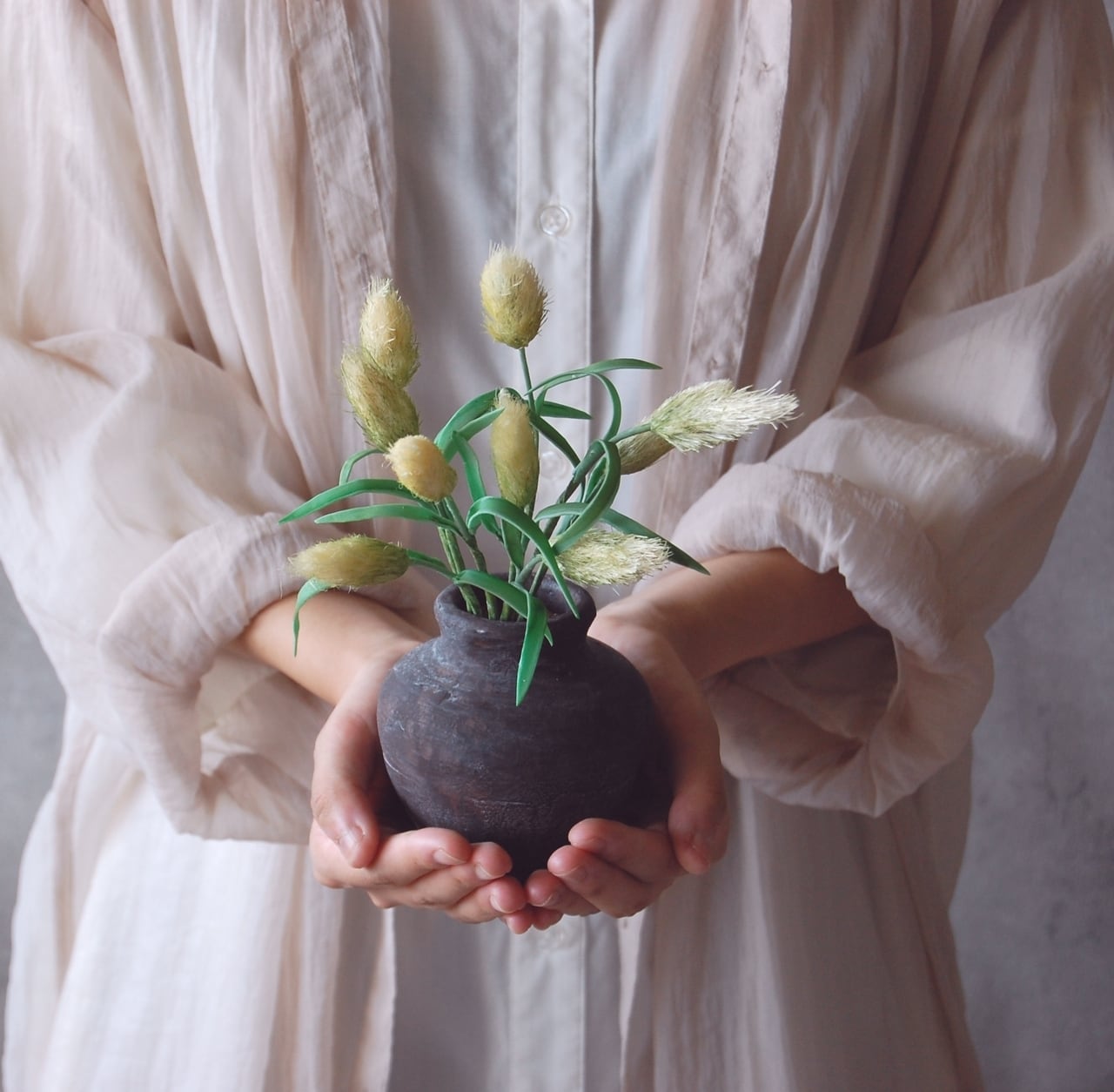 穂の部分は麻紐で、葉は粘土で制作し、壷にアレンジしました。。