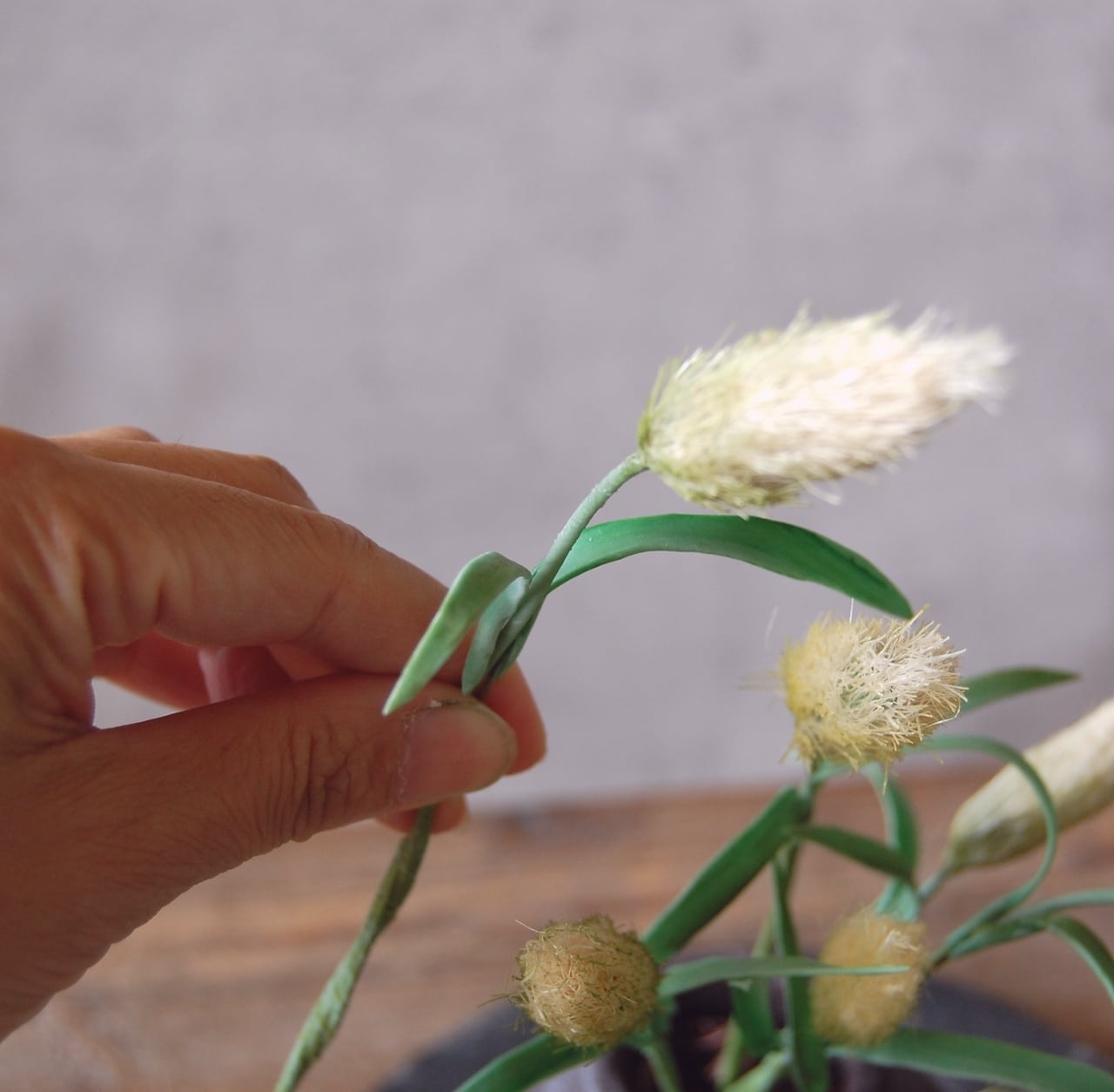 ●エノコログサは麻紐、葉は最高級彫塑用ネンドで手作りしています。