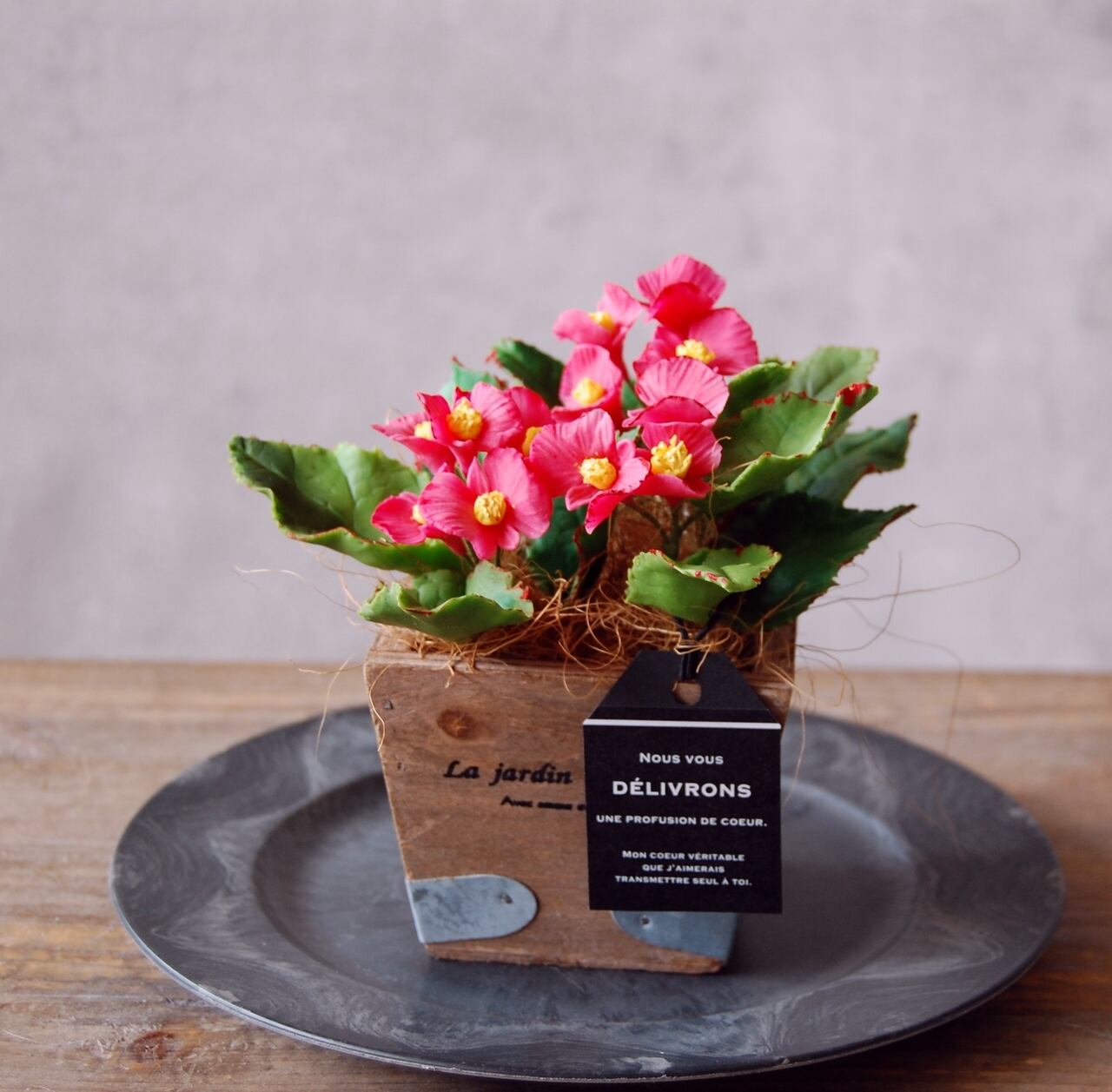 【粘土のお花】真っ赤なベゴニア ウッドプランター・・・B705