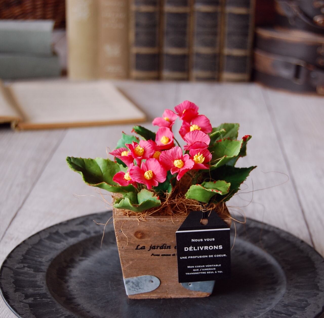 粘土で真っ赤なベゴニアを作り、小さなウッドプランターに植え込みました。