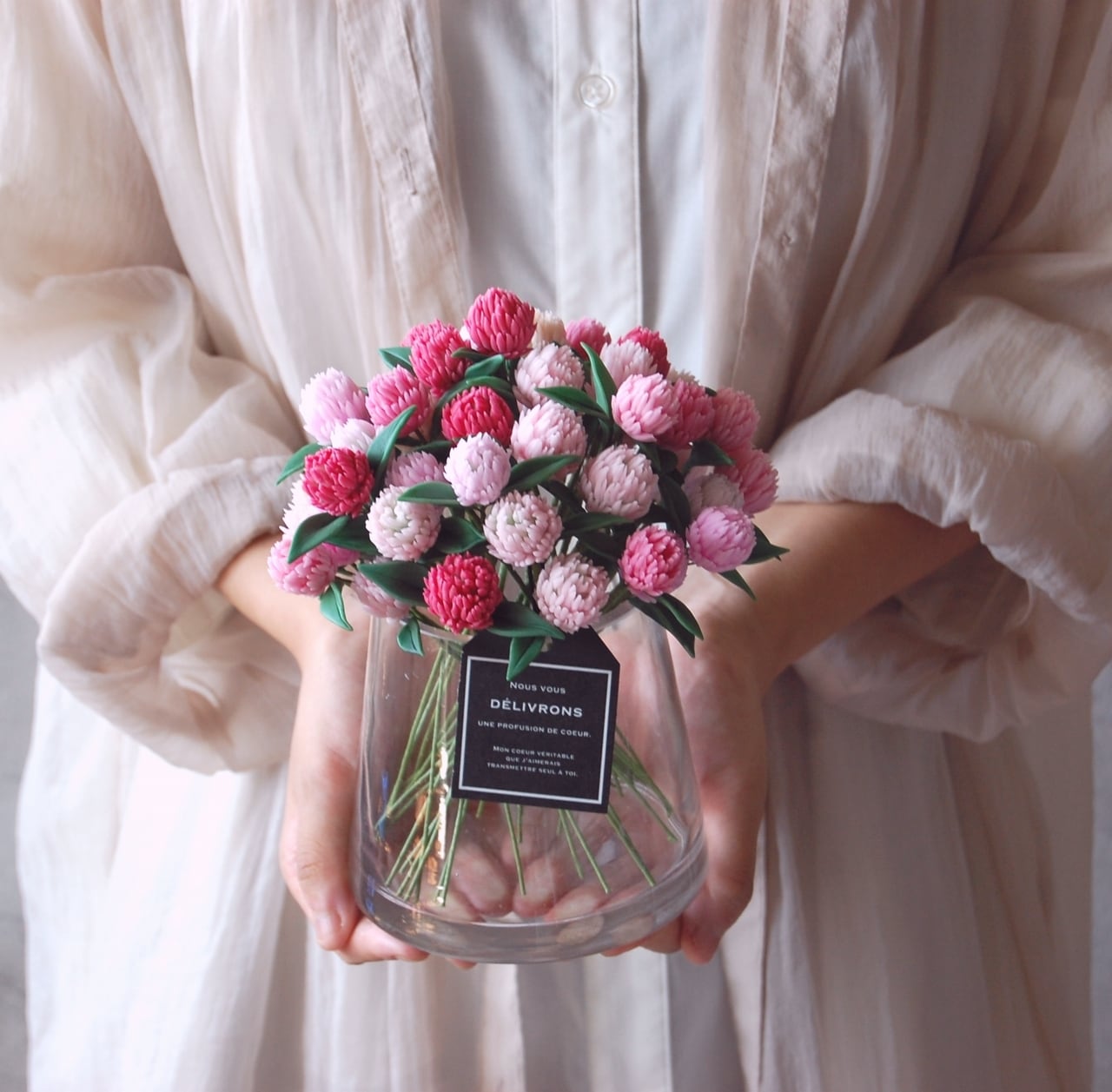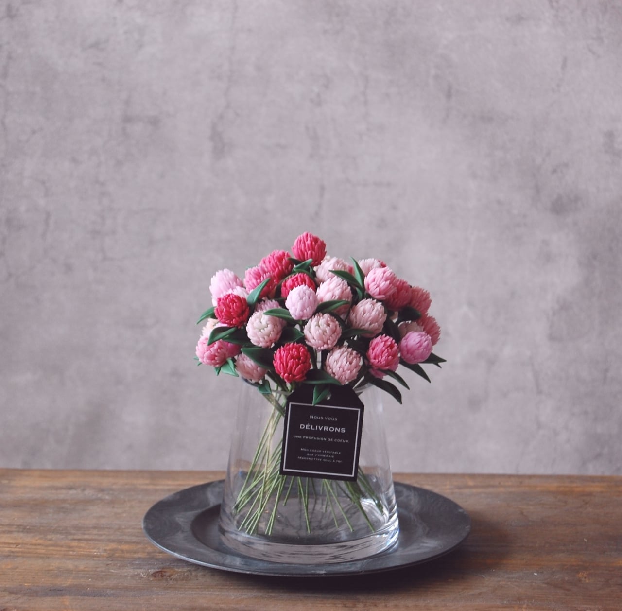 【粘土のお花】千日紅をシンプルガラスボトルに飾って・・・約19センチ S706
