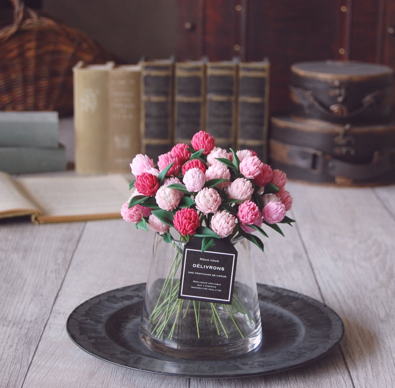 ●千日紅や葉っぱは最高級彫塑用ネンドで手作りしています。