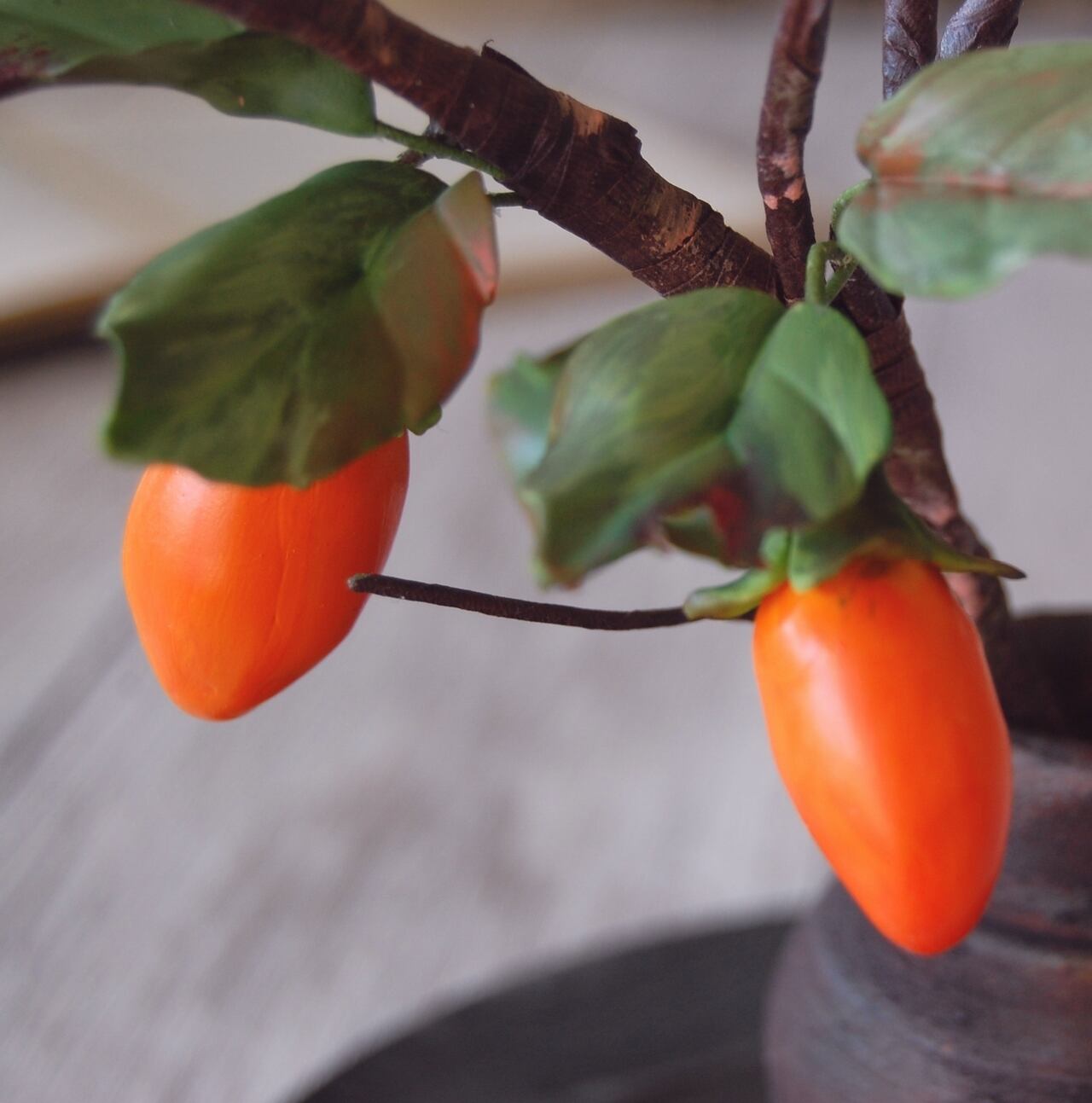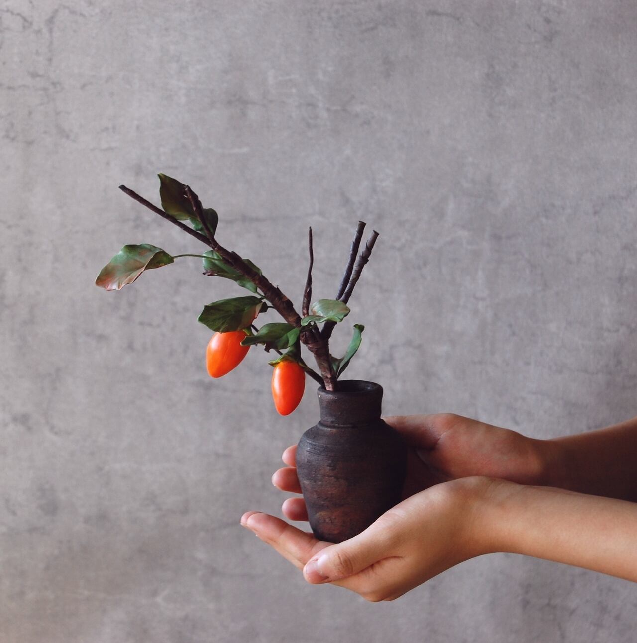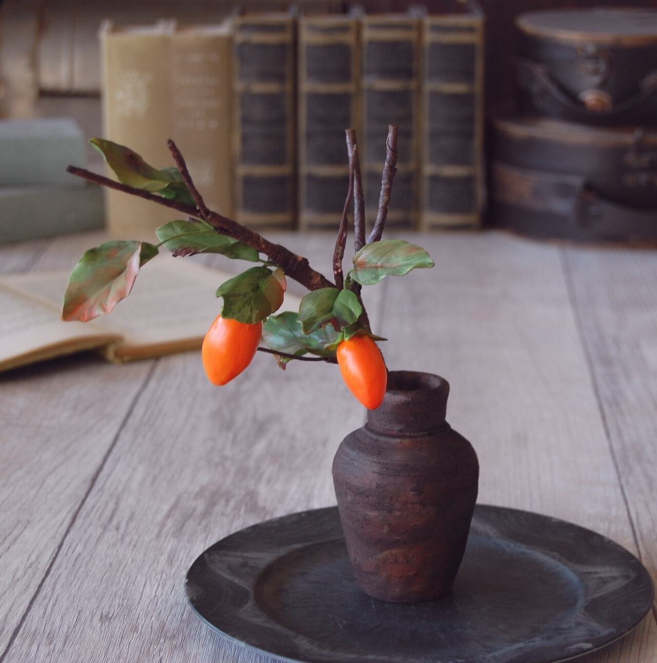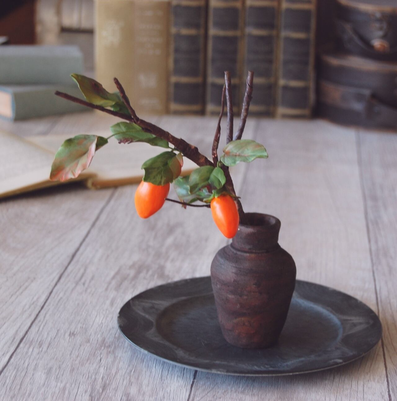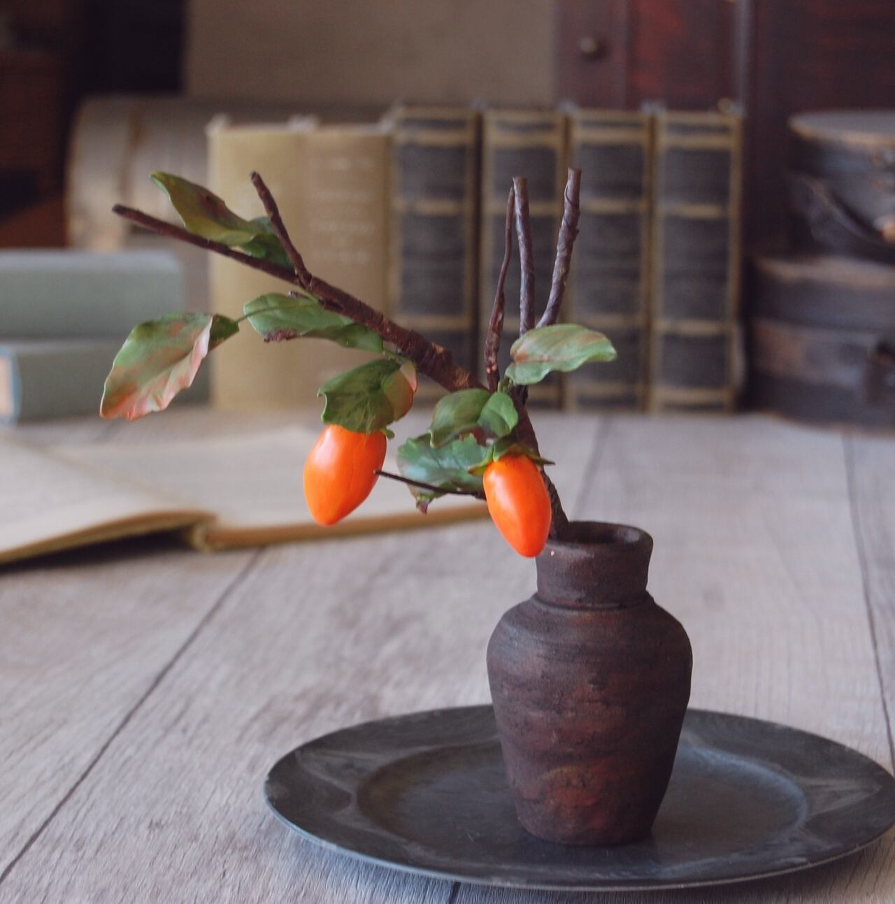粘土で柿(老爺柿)を作り、小さな壺にアレンジしました。