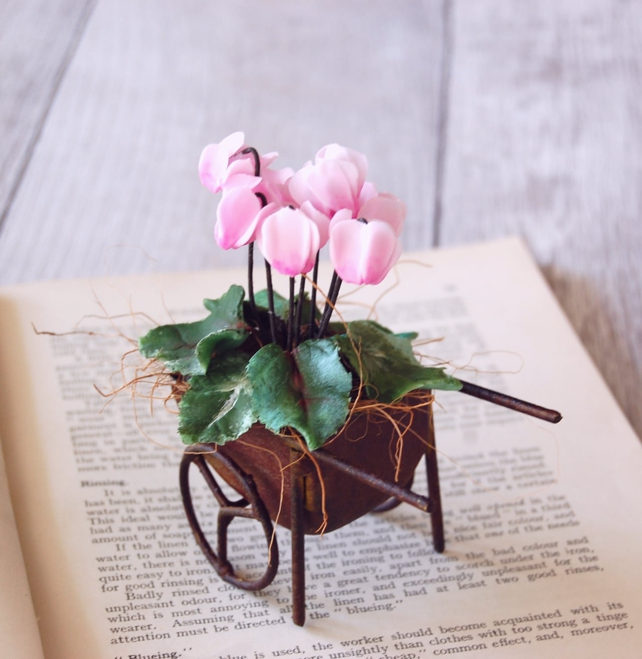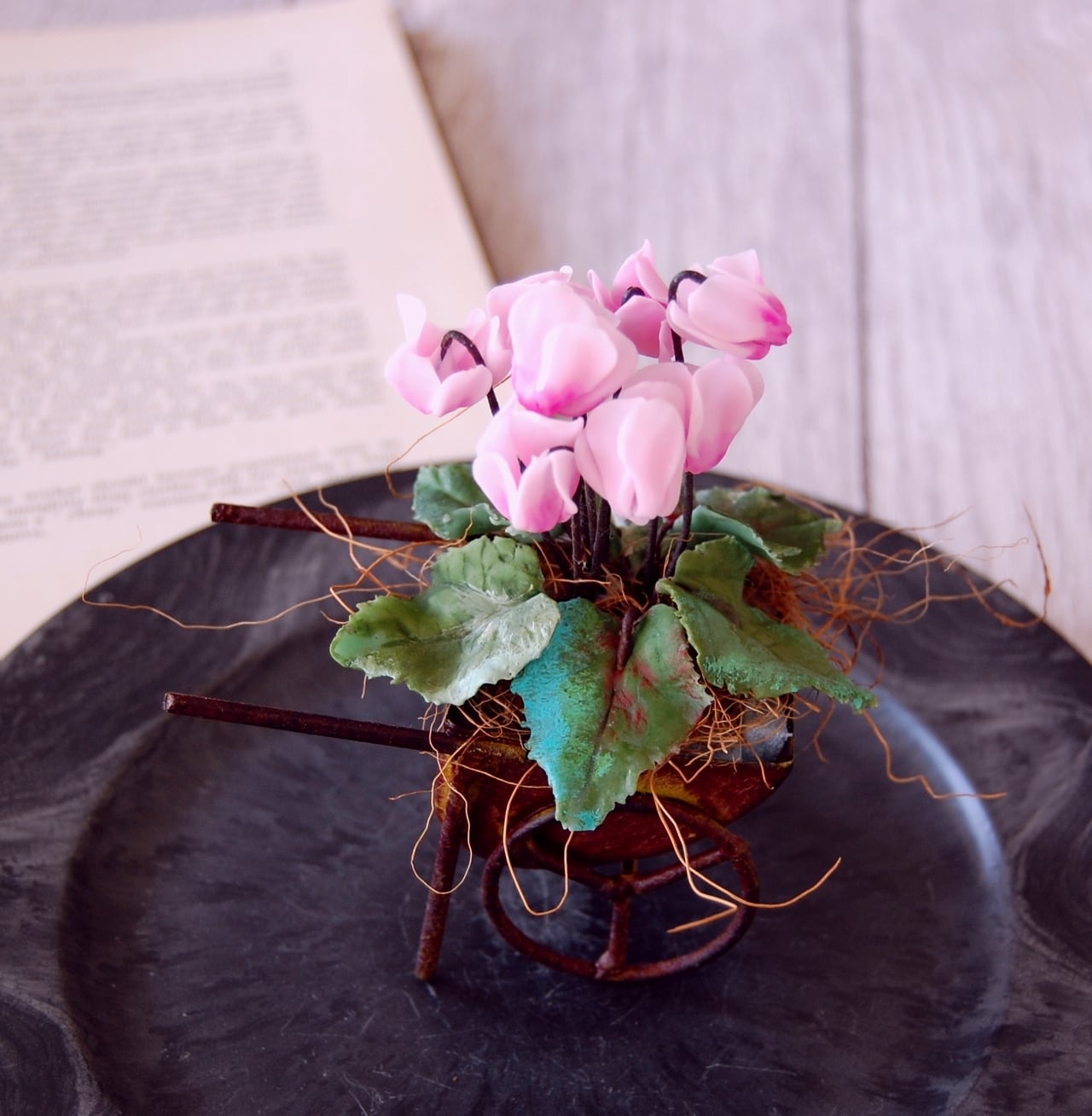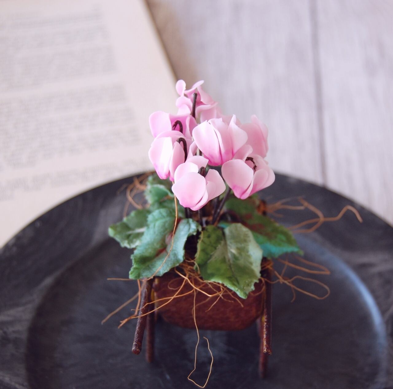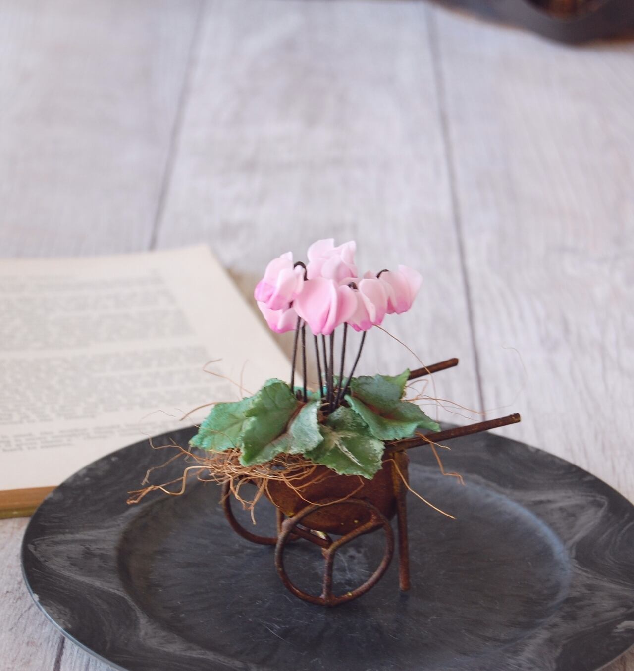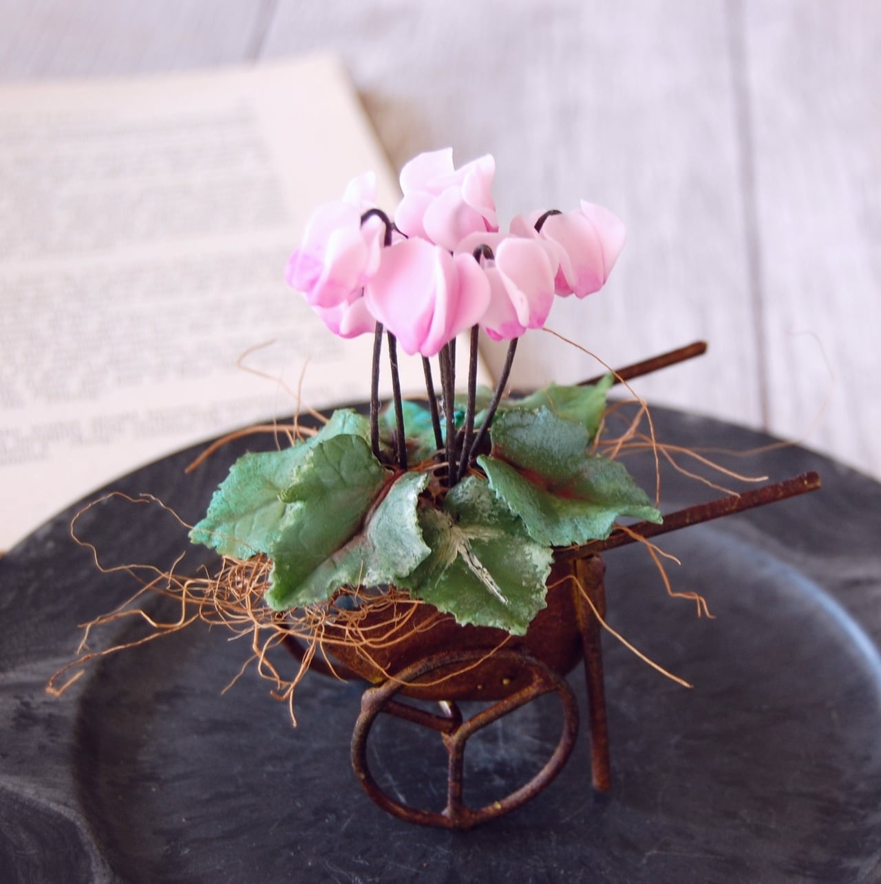 ◆粘土のお花◆ 小さな小さなシクラメン ピンク アンティーク ブリキ車輪… S729