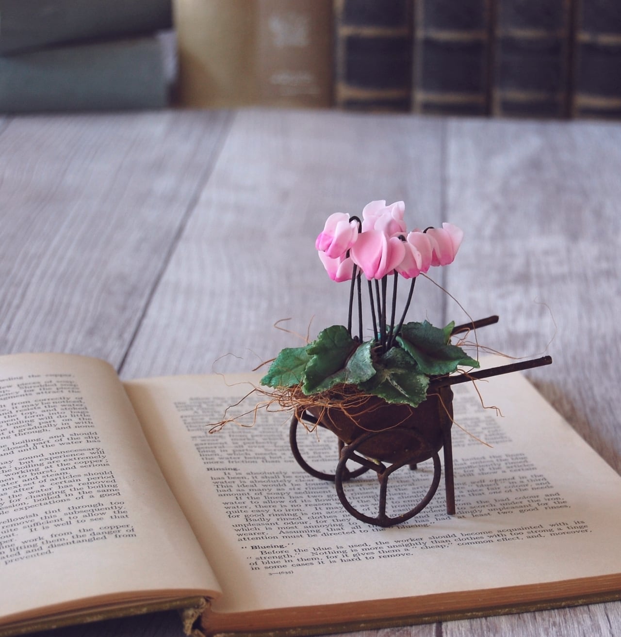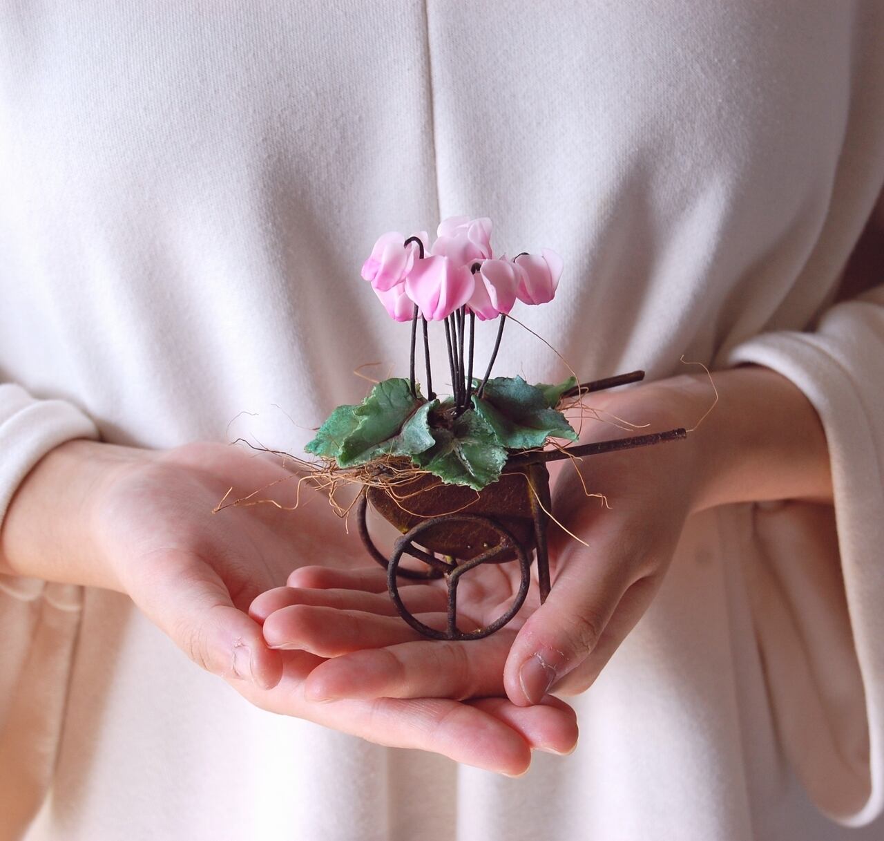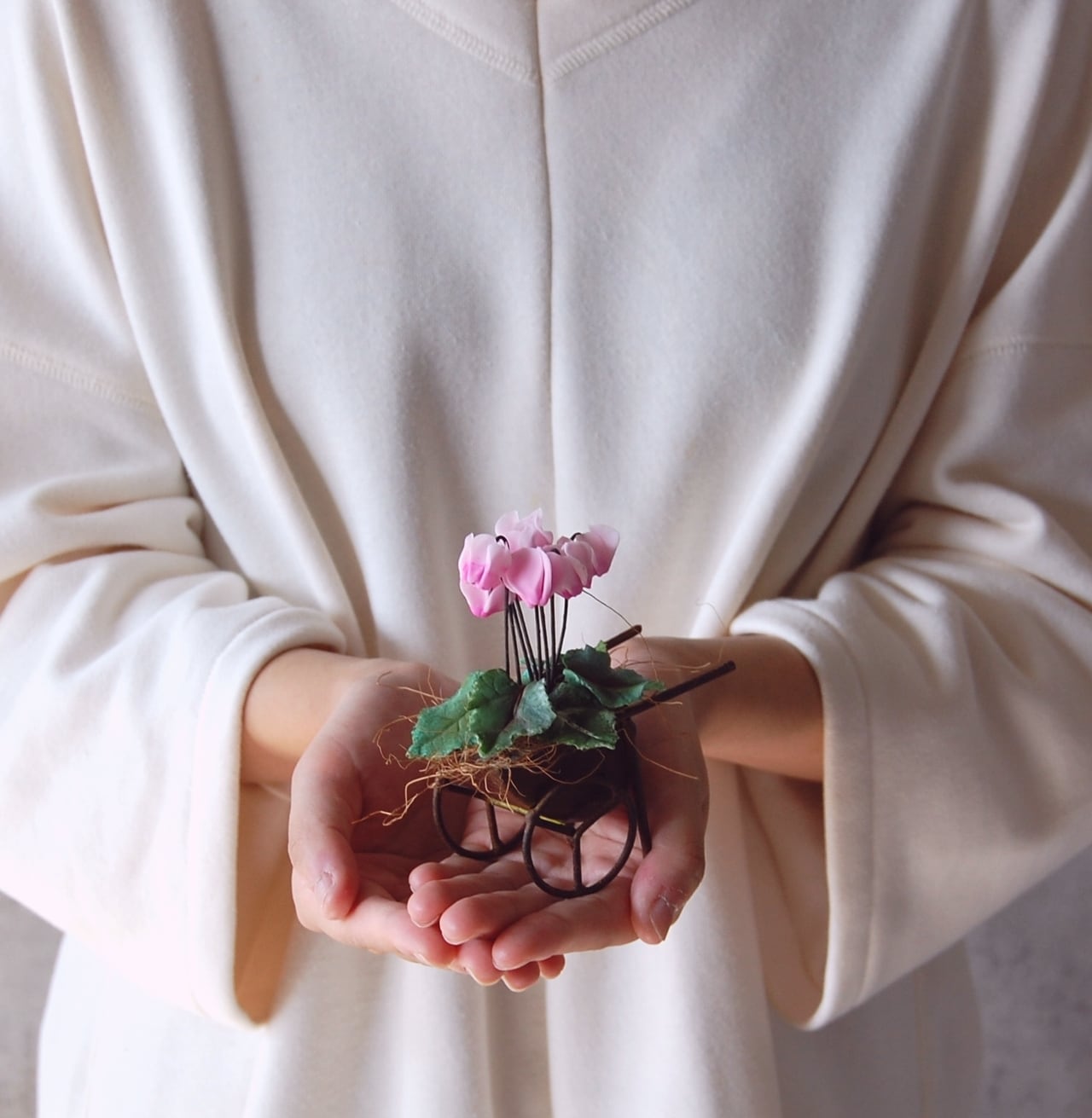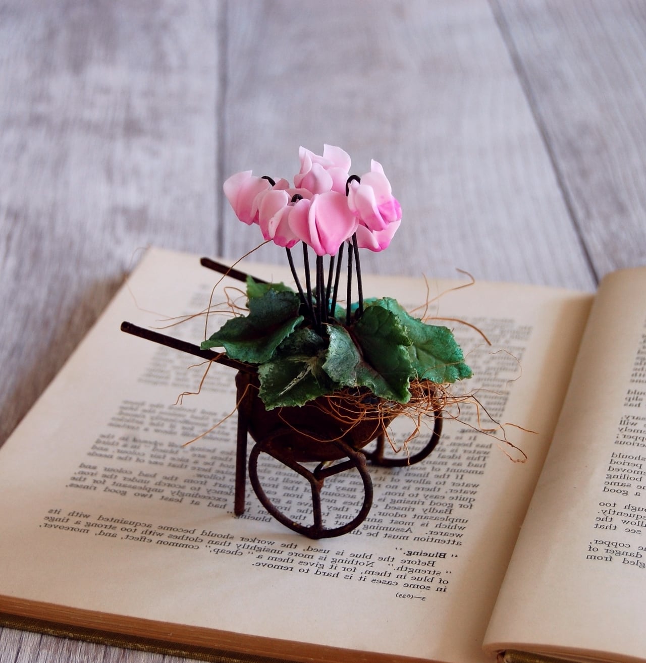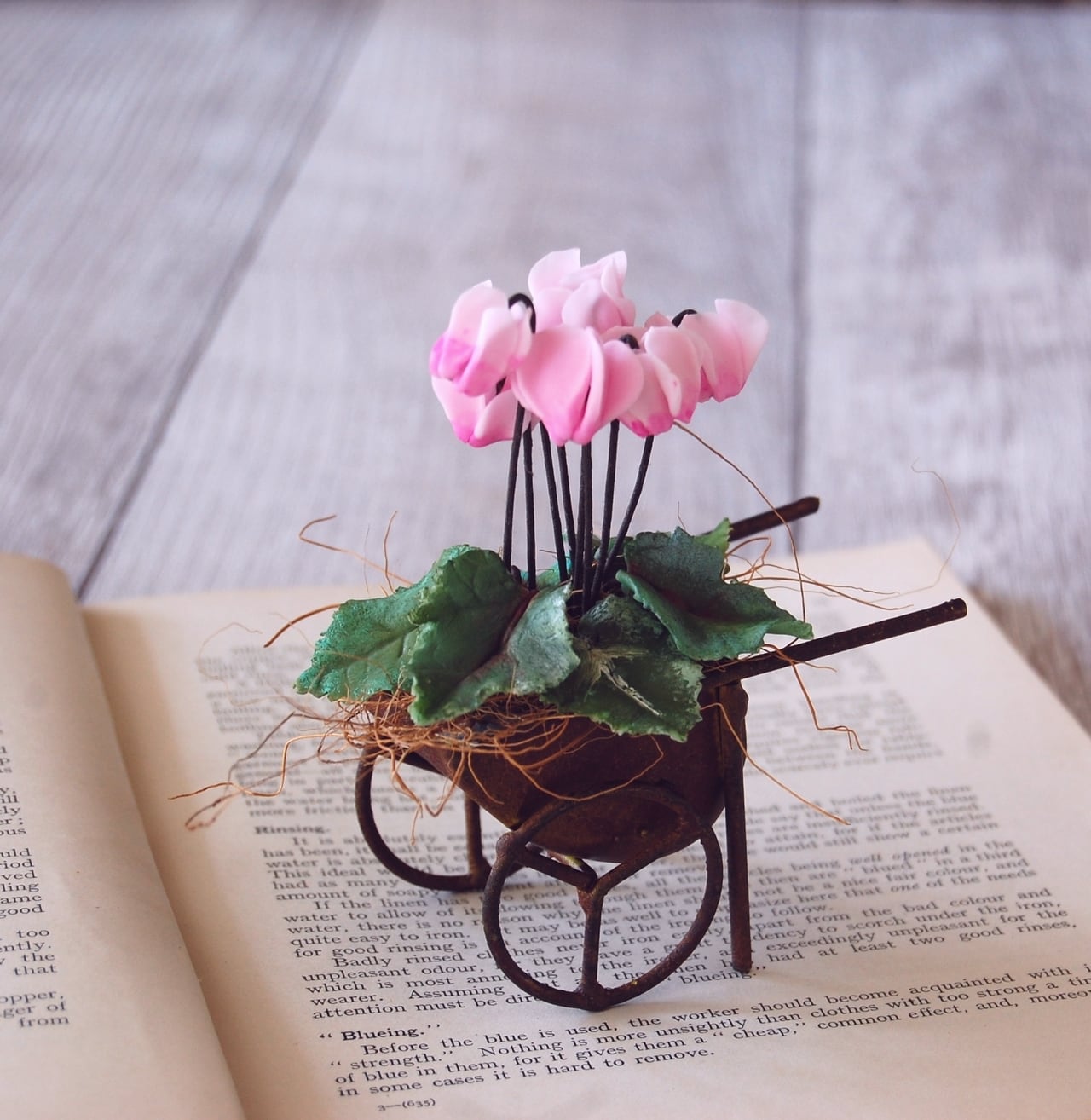 ◆粘土のお花◆ 小さな小さなシクラメン ピンク アンティーク ブリキ車輪… S729