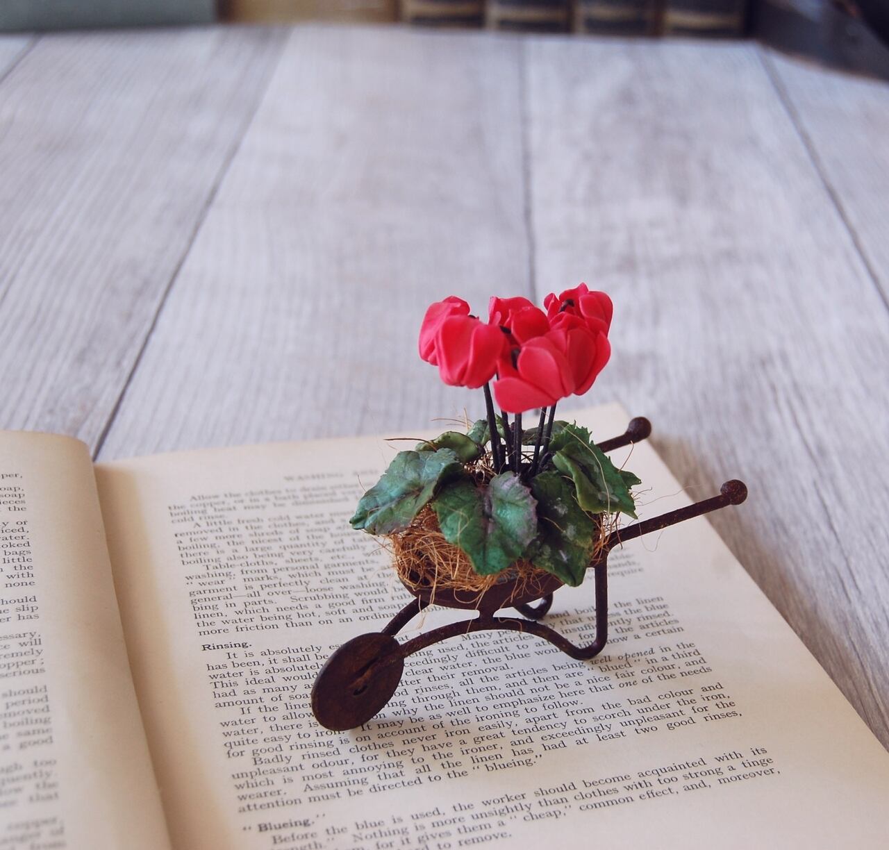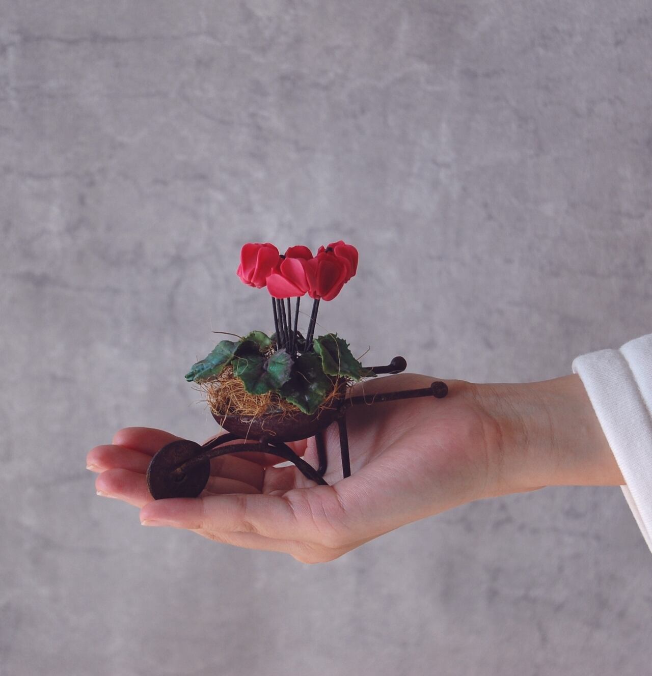 ◆粘土のお花◆ 小さな小さなシクラメン 赤 アンティーク ブリキ一輪車…S731