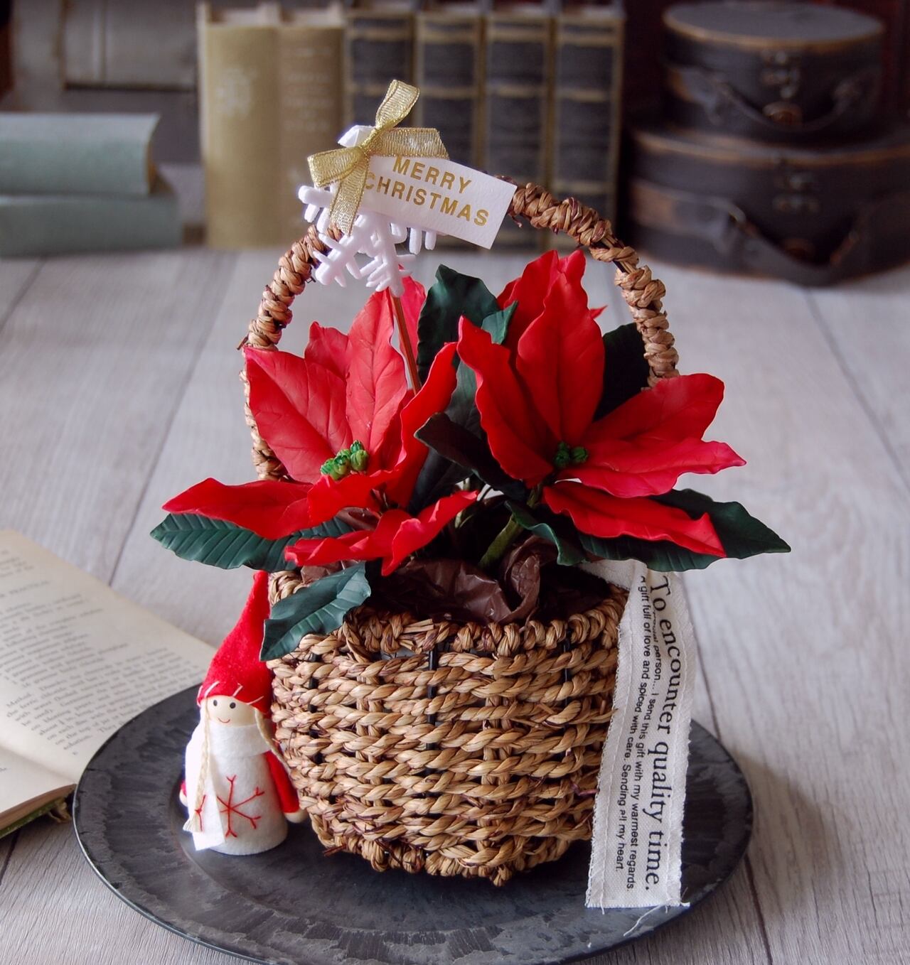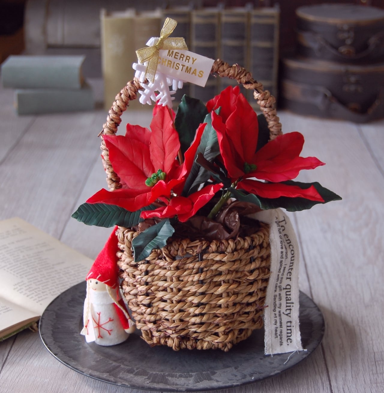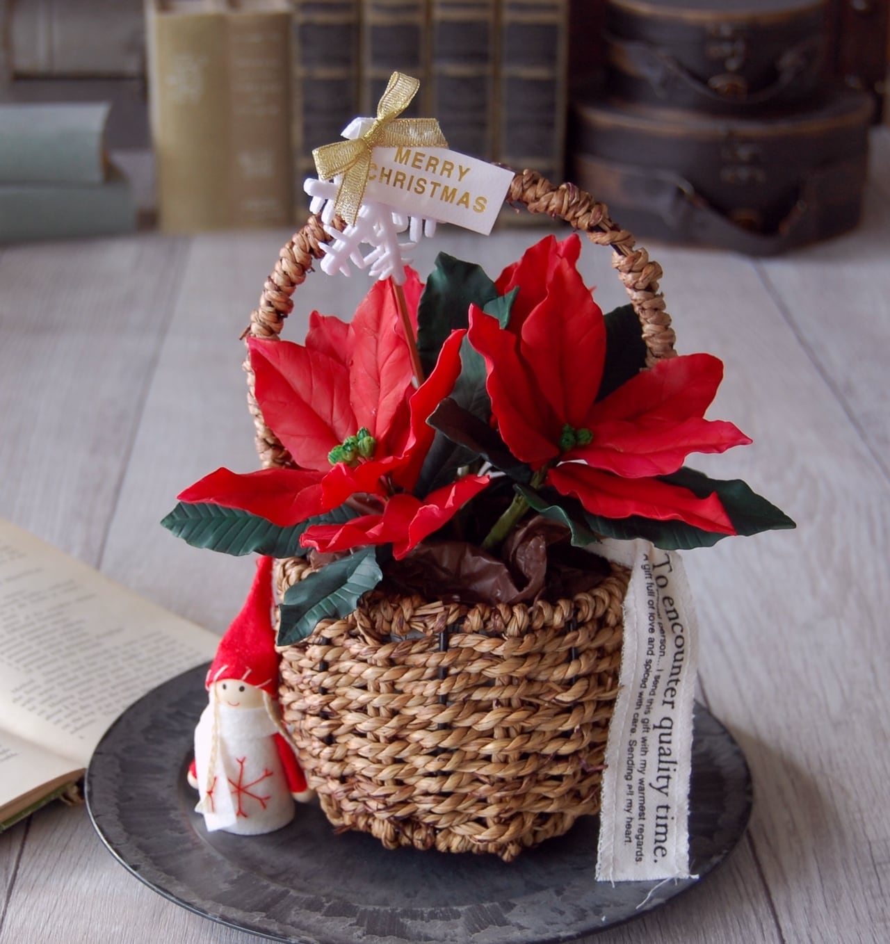 【粘土のお花】 ポインセチア ハンドル籠バック クリスマスアレンジ ニッセマスコット(どちらか1つ付き♪) P737