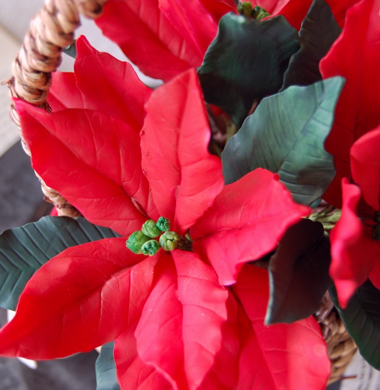粘土でポインセチアを作り、ハンドル付きの籠バックにアレンジしました。