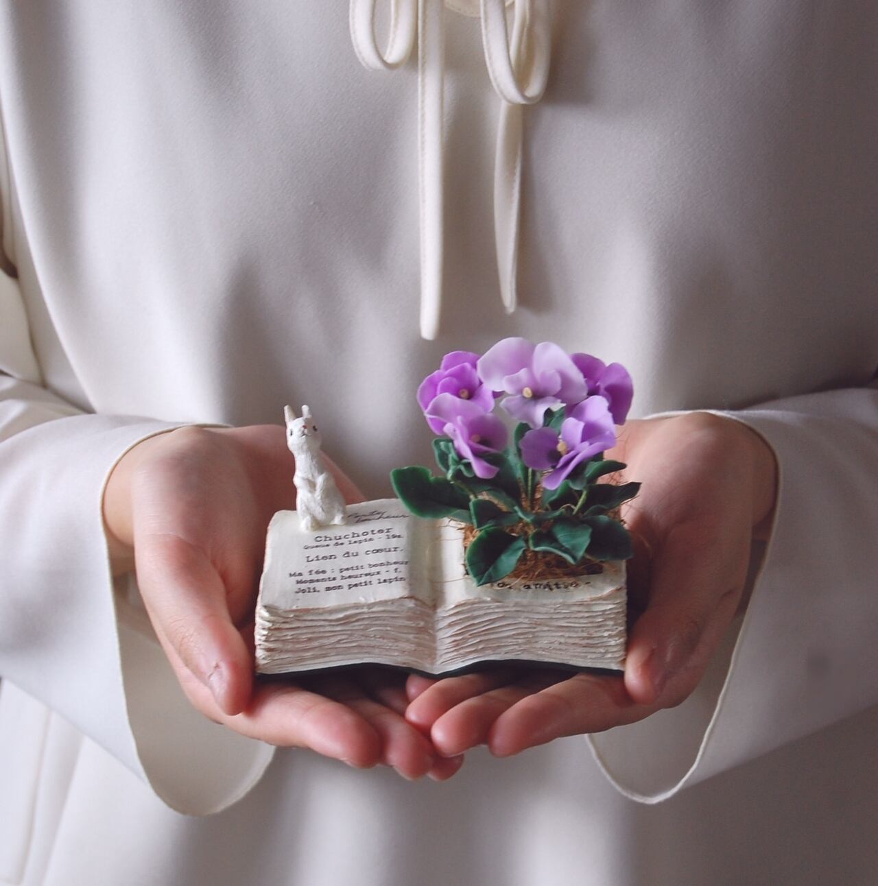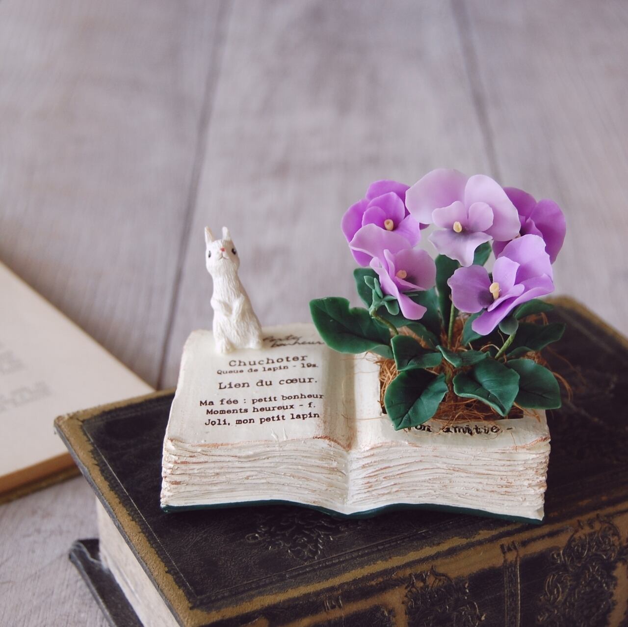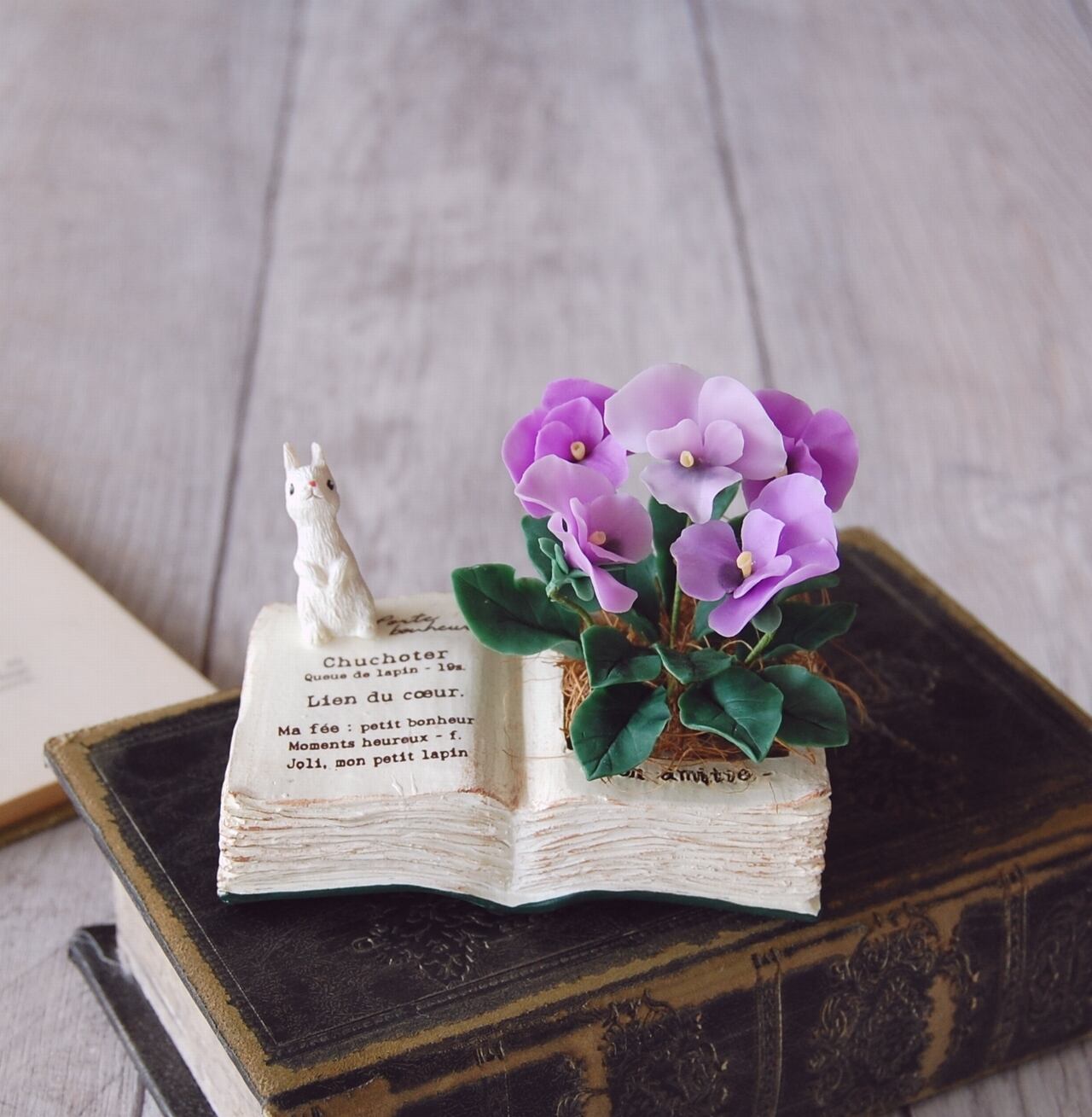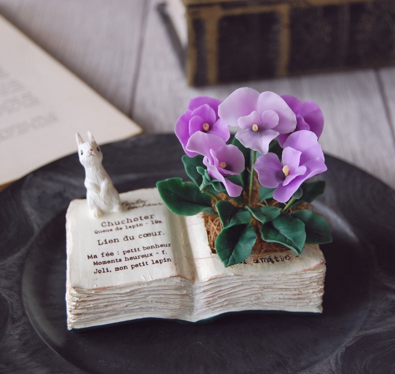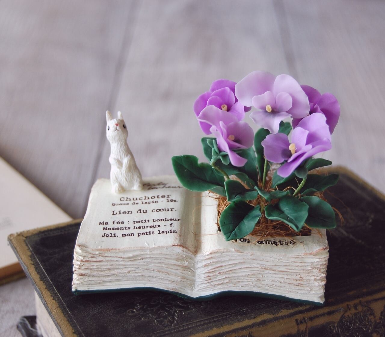 【粘土のお花】 小さなビオラ パープル うさぎさんと小さなbookポット B750