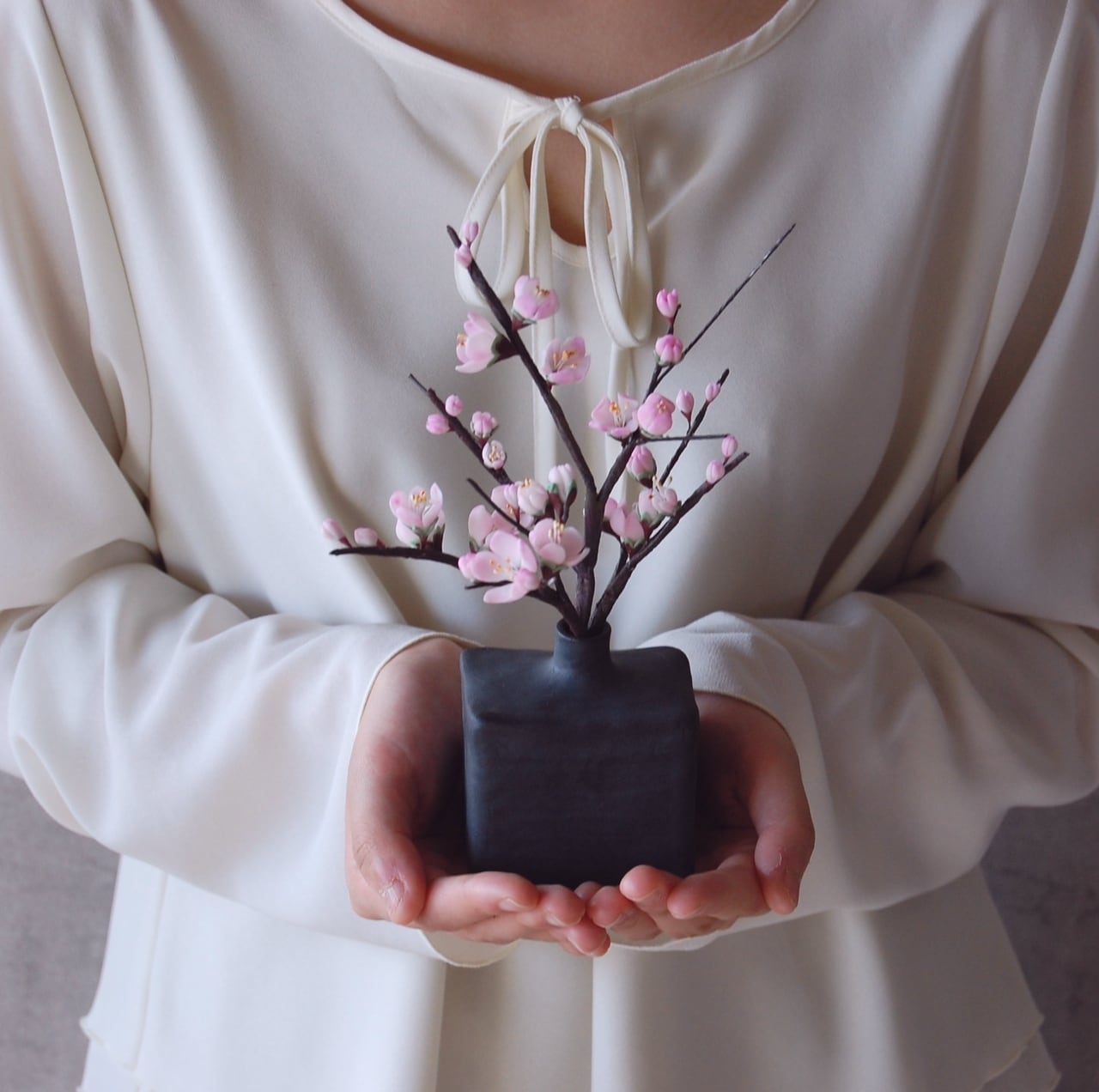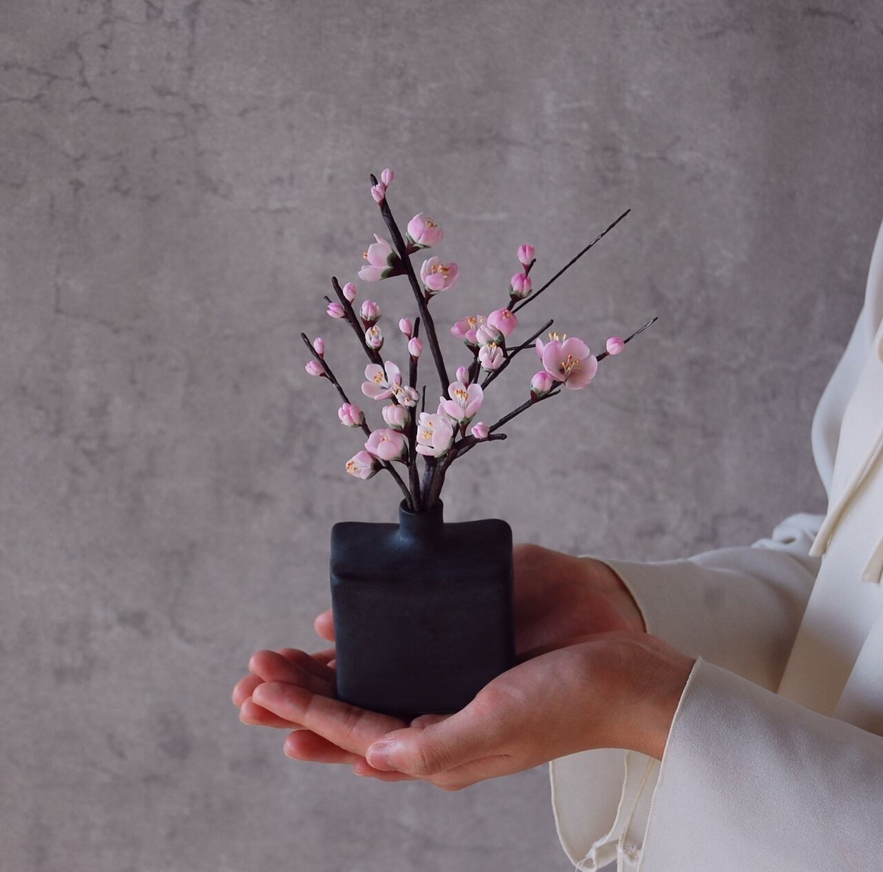 粘土で梅を作り、和モダンでシンプルなデザインの波佐見焼(はさみやき)の花瓶にアレンジしました。