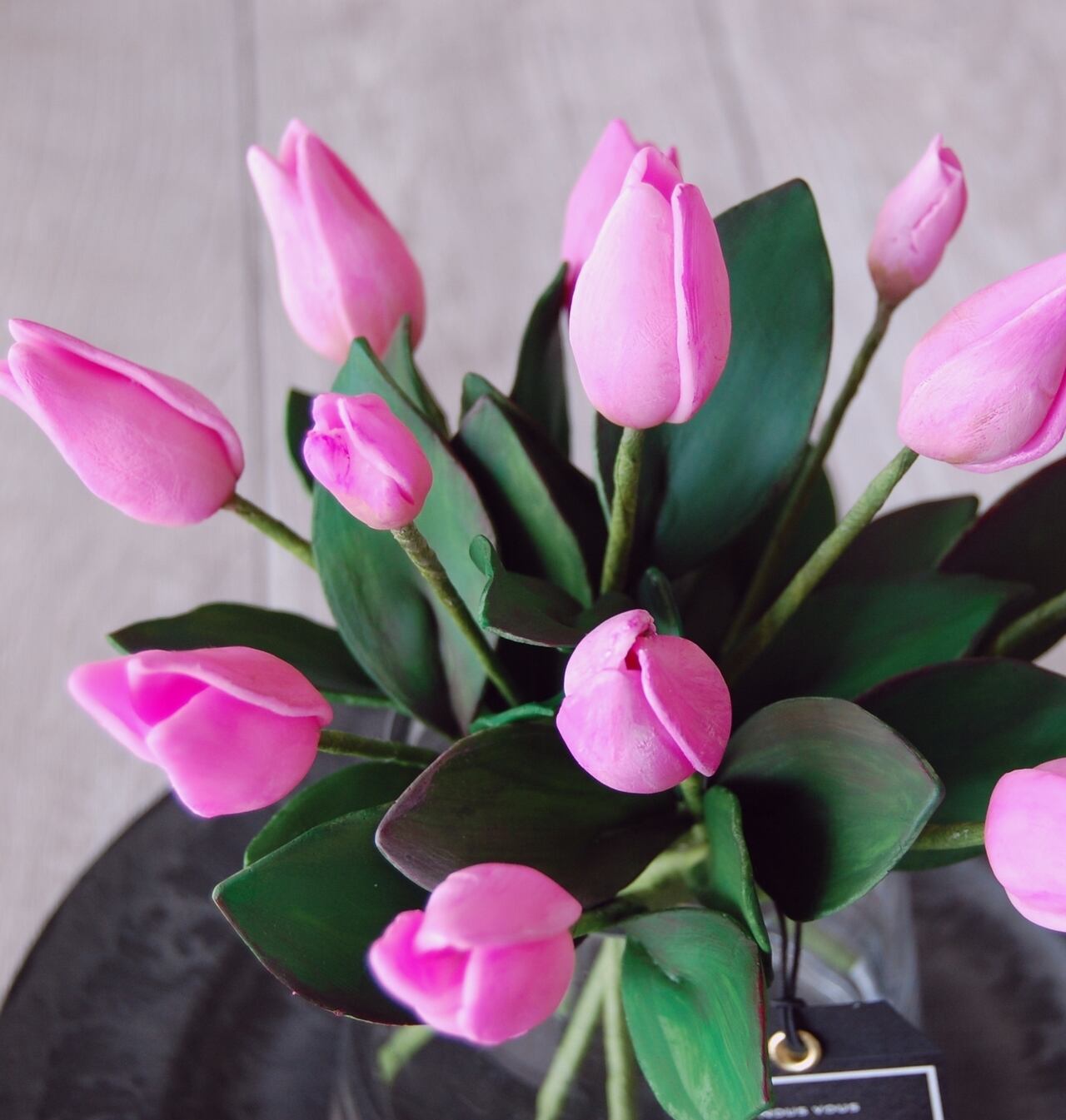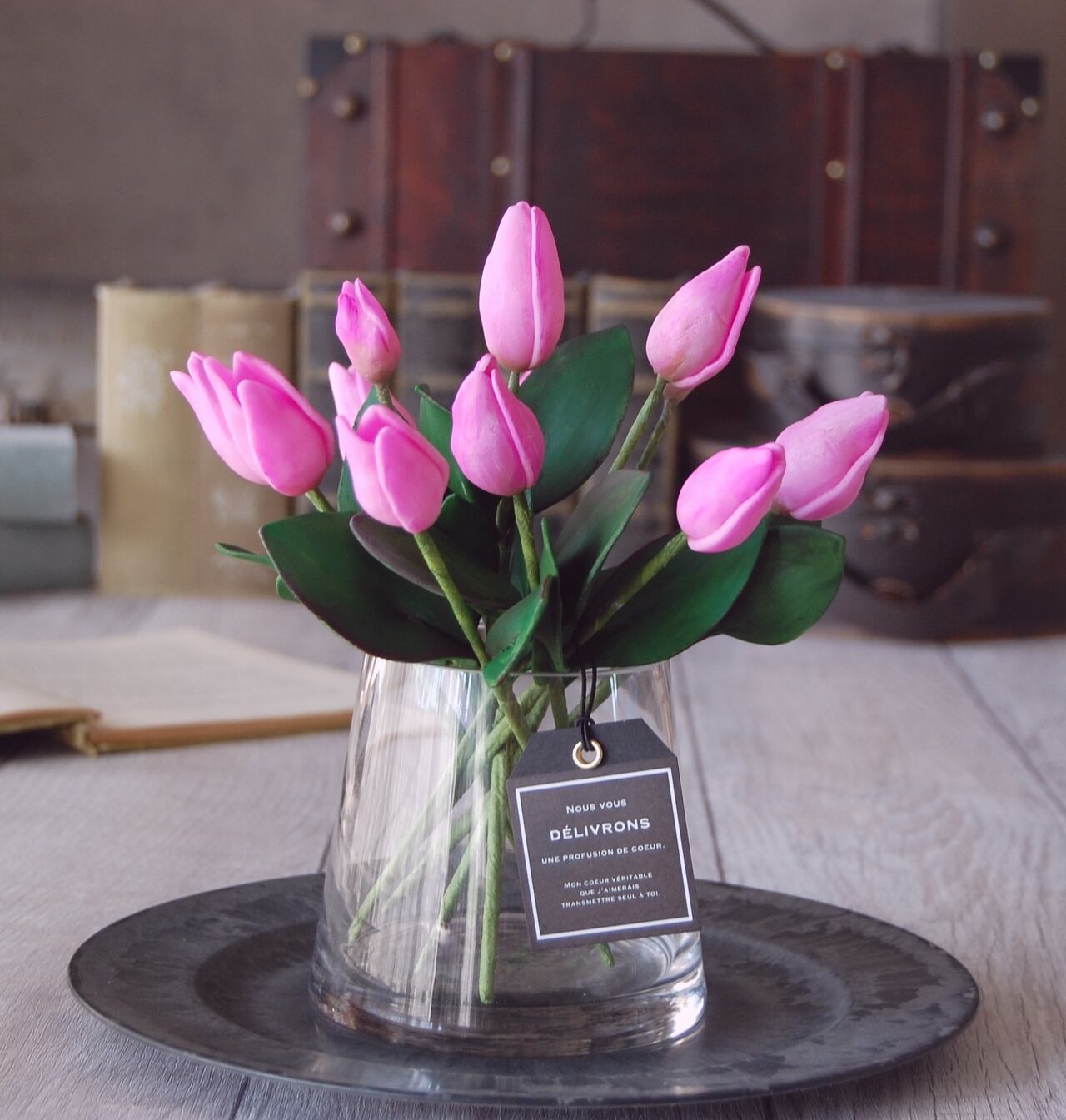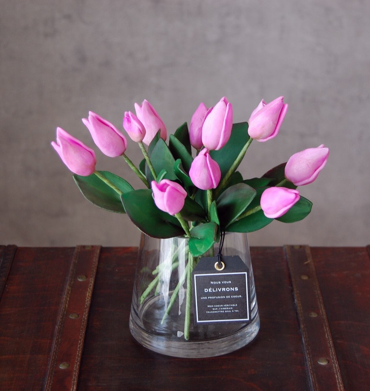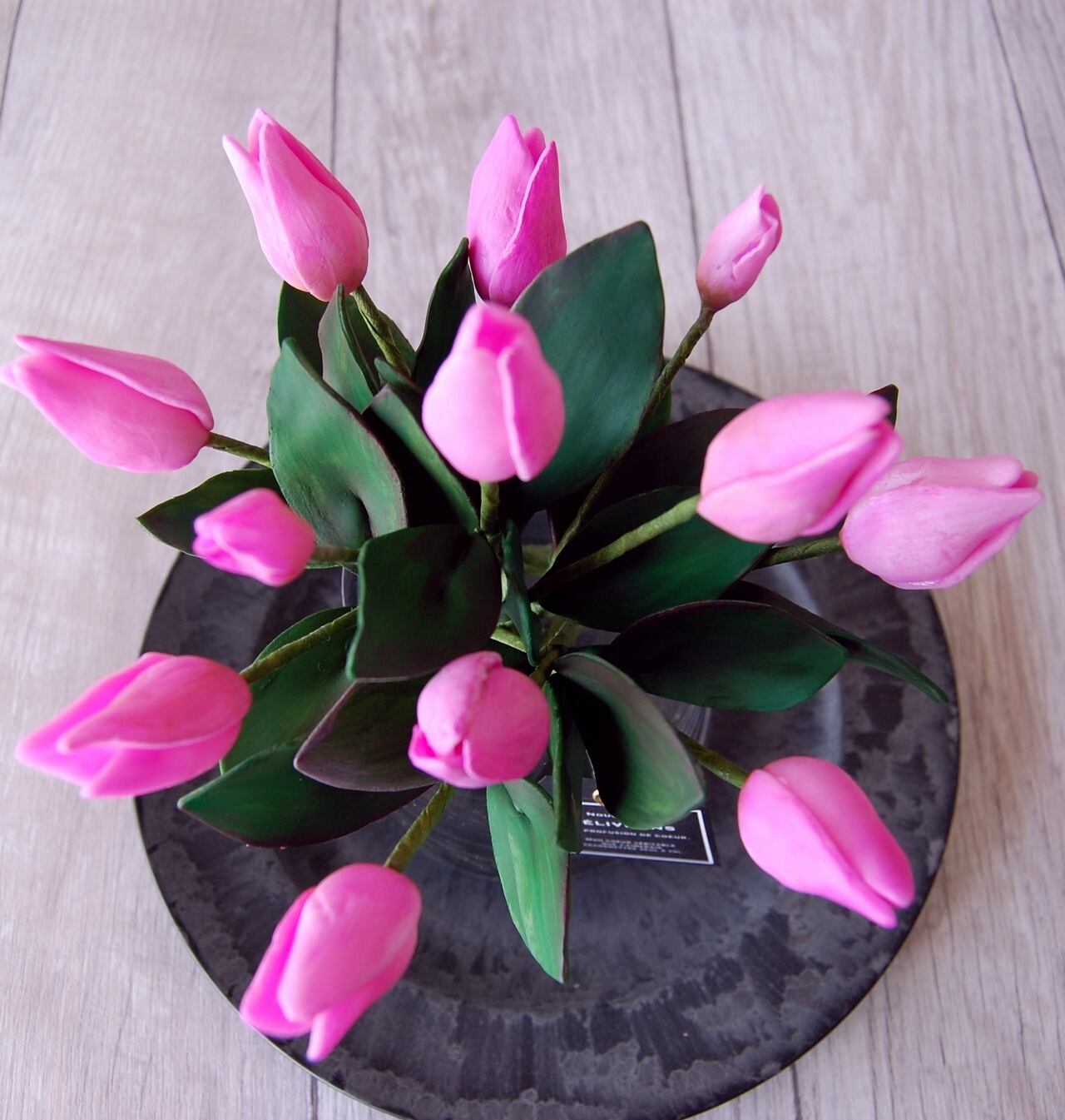 粘土でチューリップをつくり、シンプルなガラスボトル(クリアー)にたっぷりと生けました。