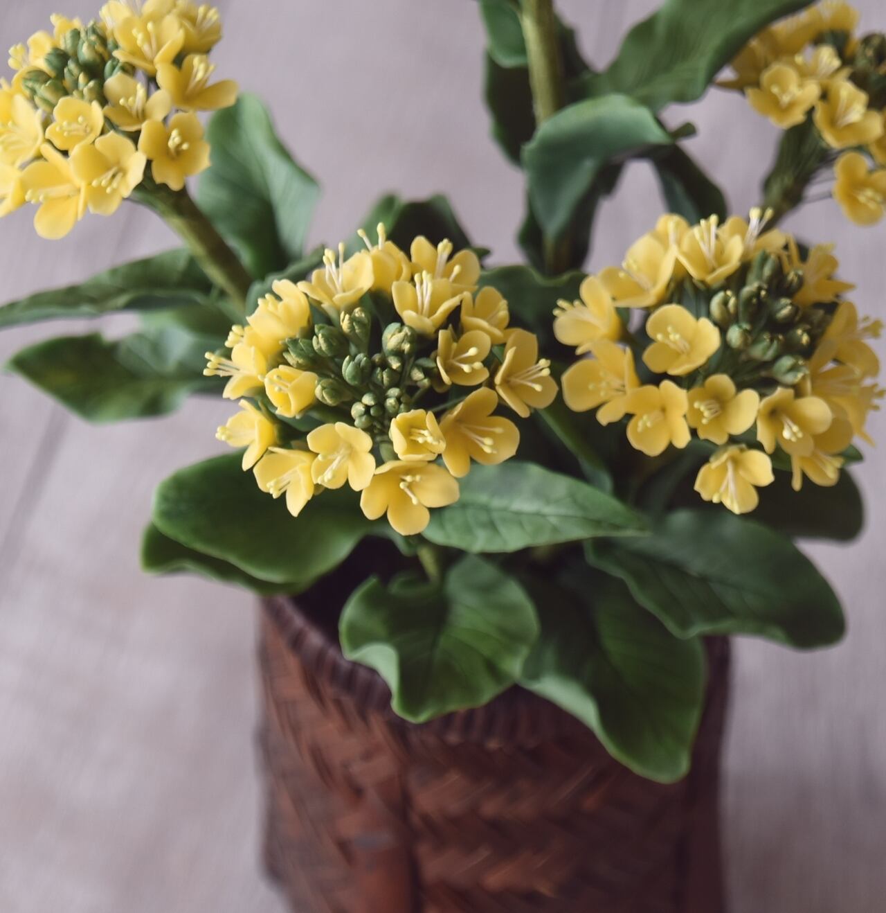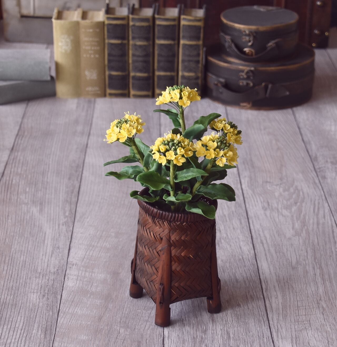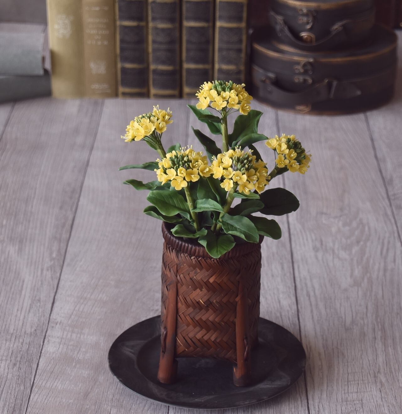 粘土で菜の花をつくり、シックな籠に背丈を少し高めにアレンジしました。