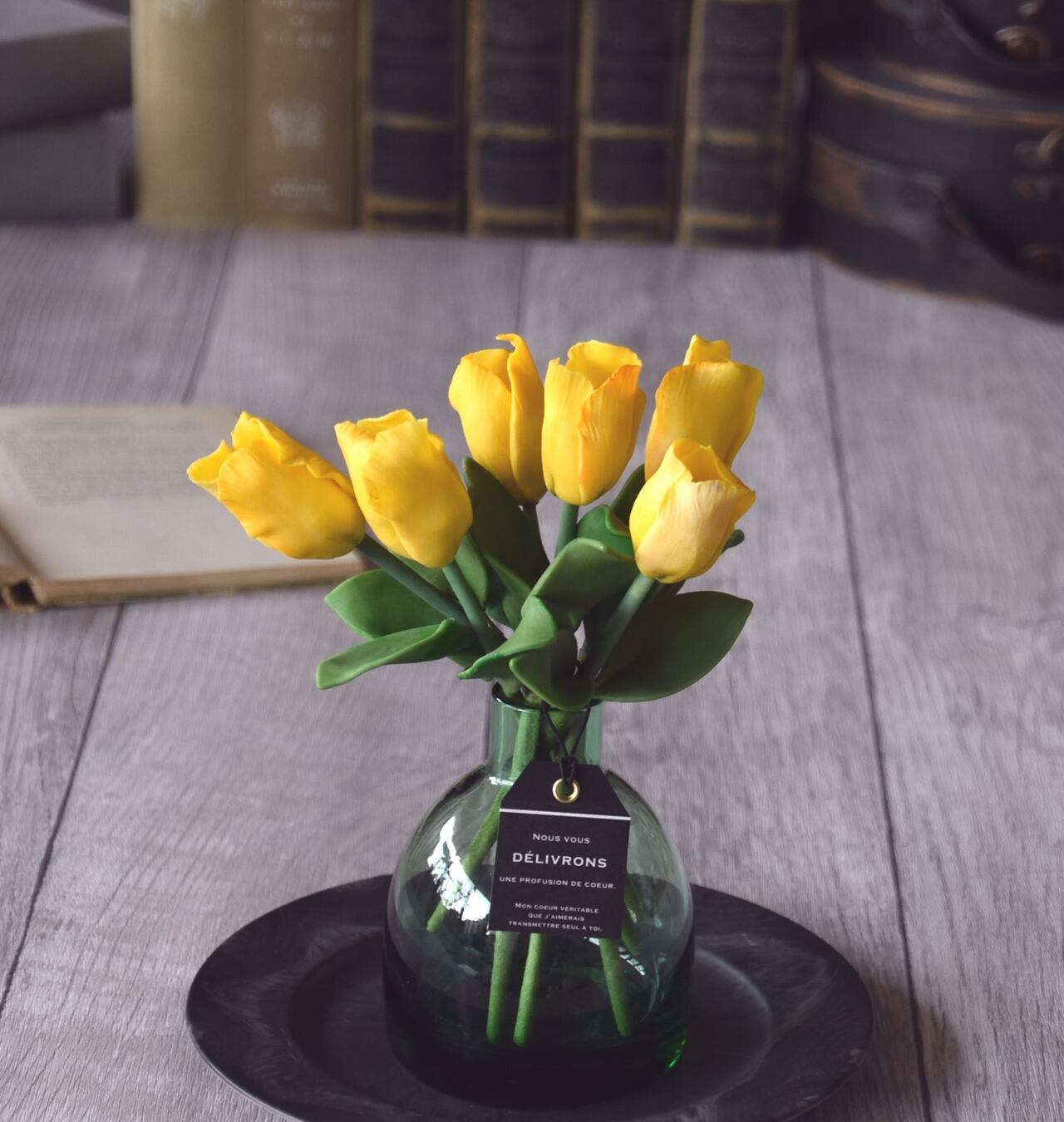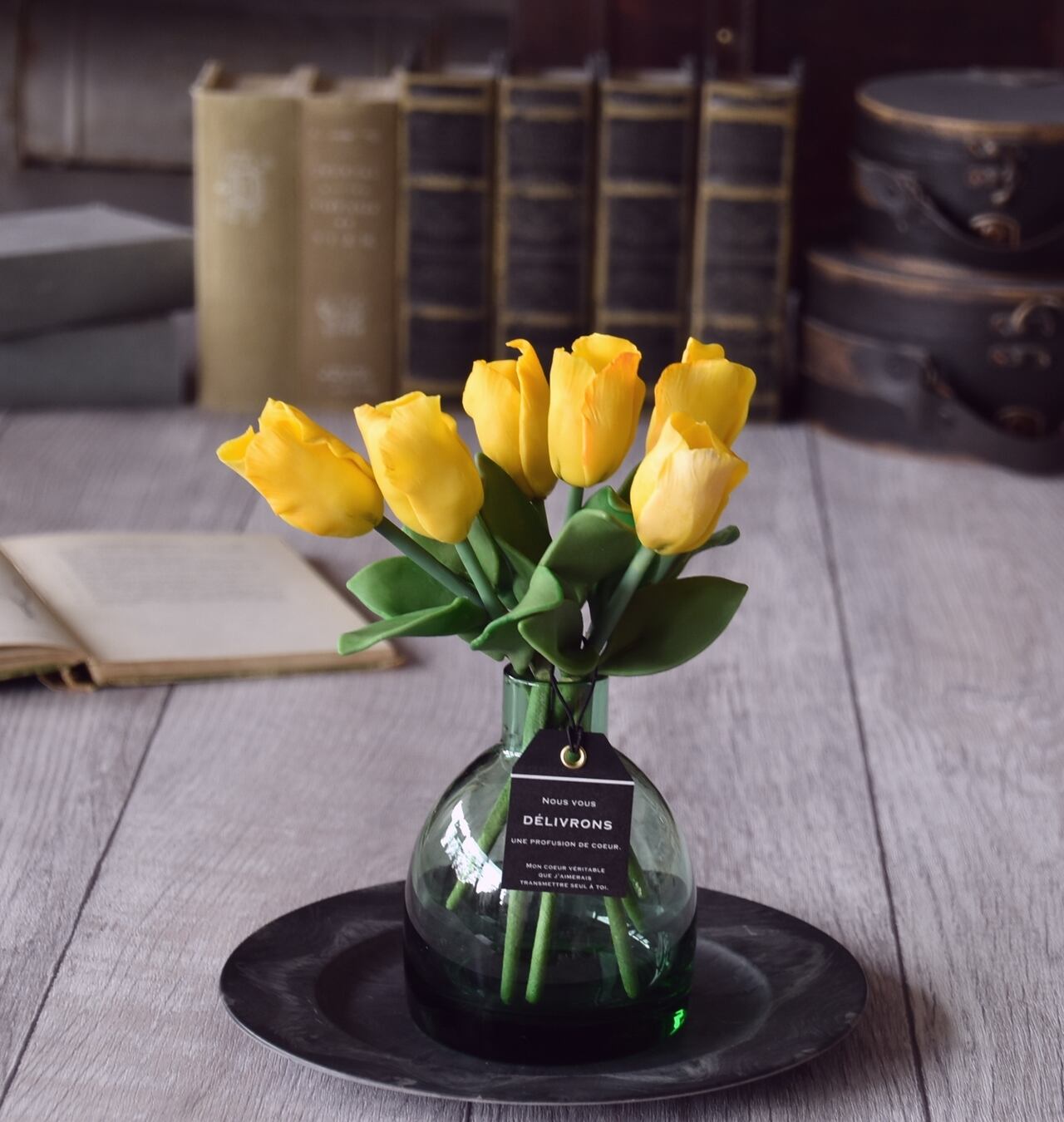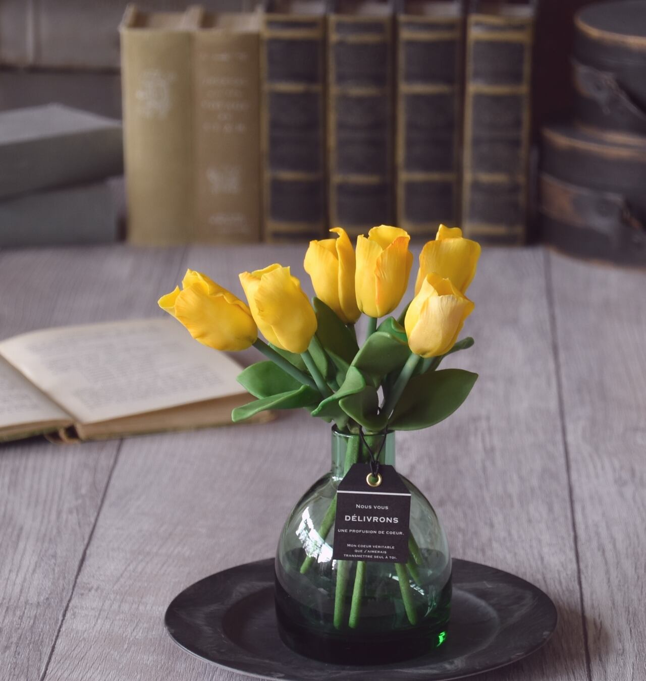 ◆粘土のお花◆ チューリップ イエロー ぽってりグリーンガラスボトル 高さ約22センチ T773