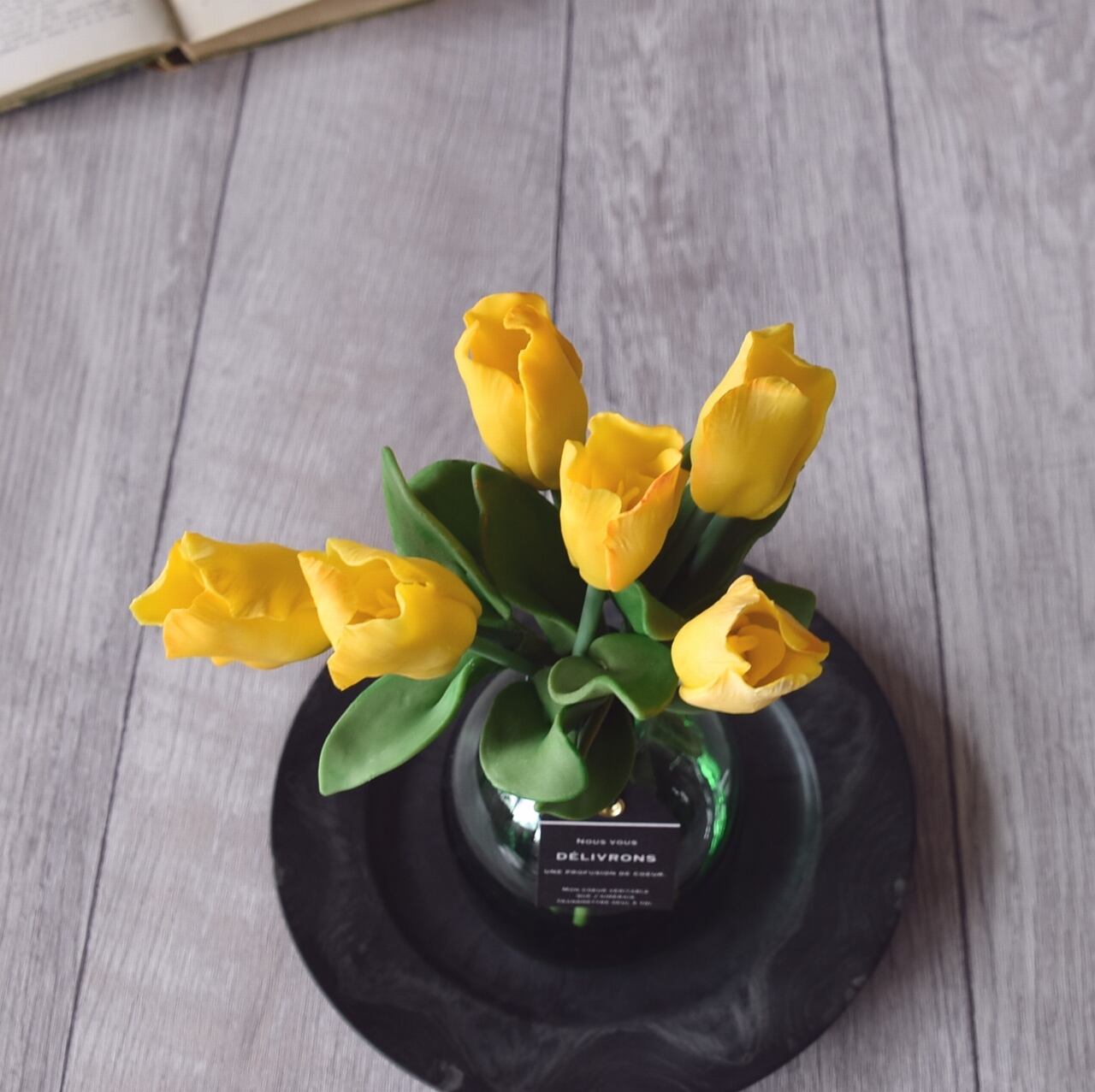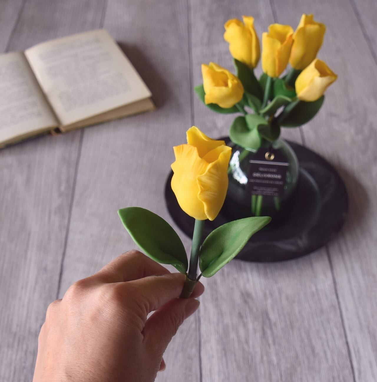 粘土でチューリップをつくり、ぽってりとしたまあるいホルムのガラスボトルにアレンジしました。