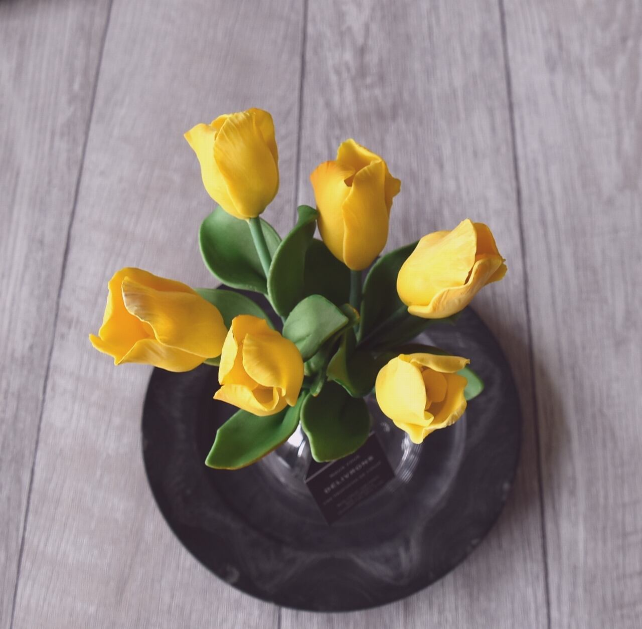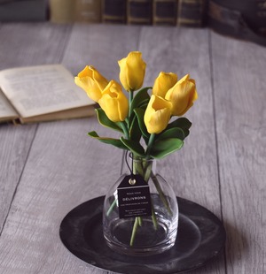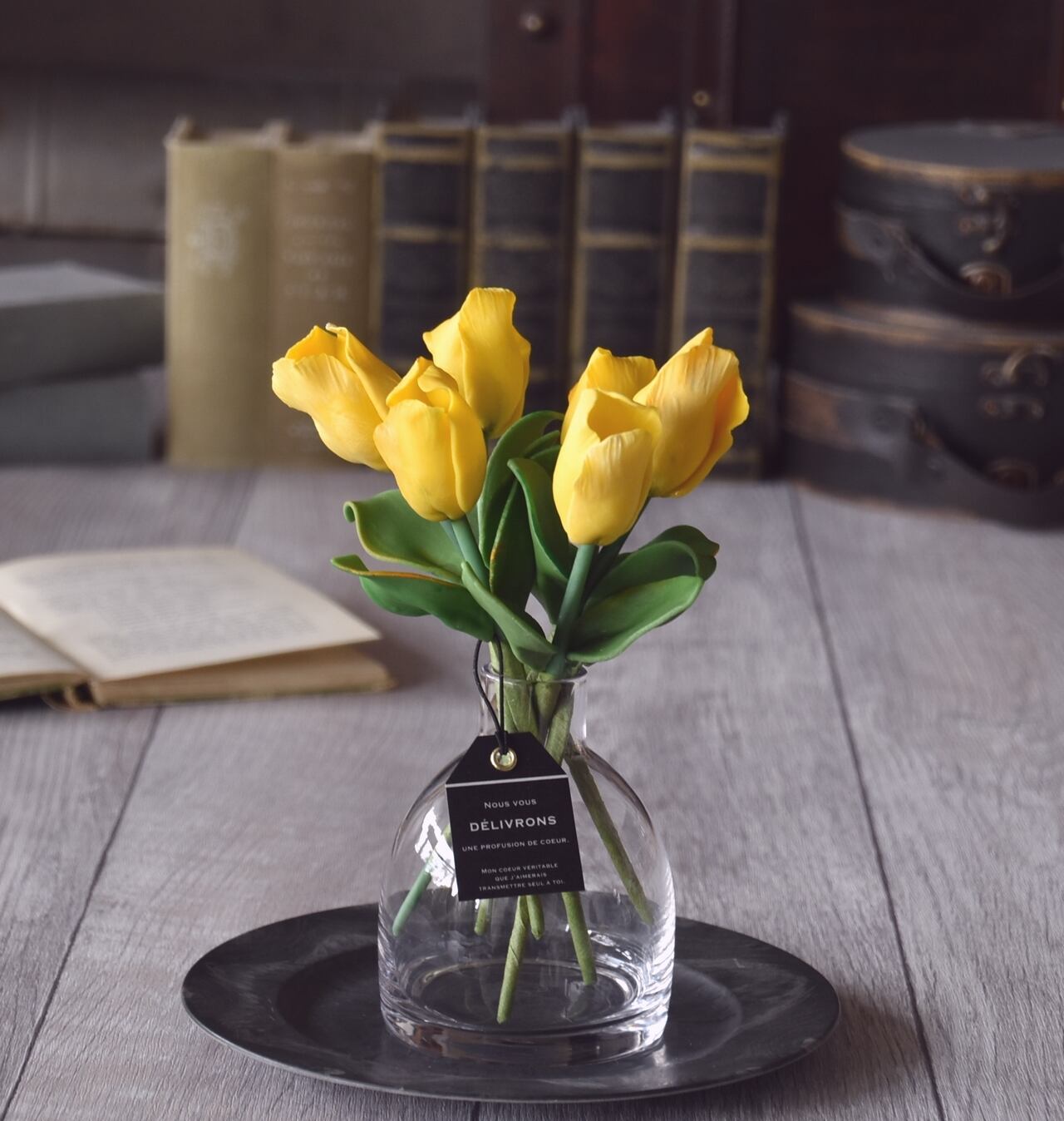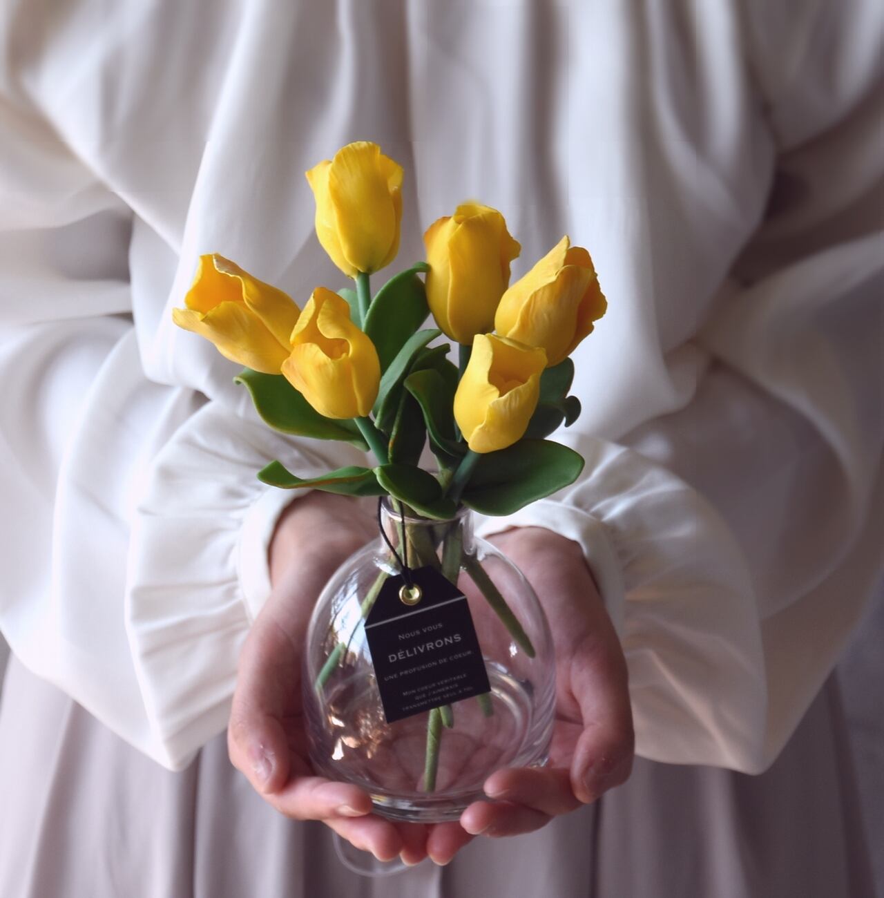 ◆粘土のお花◆ チューリップ イエロー ぽってりクリアーガラスボトル 高さ約22センチ T774