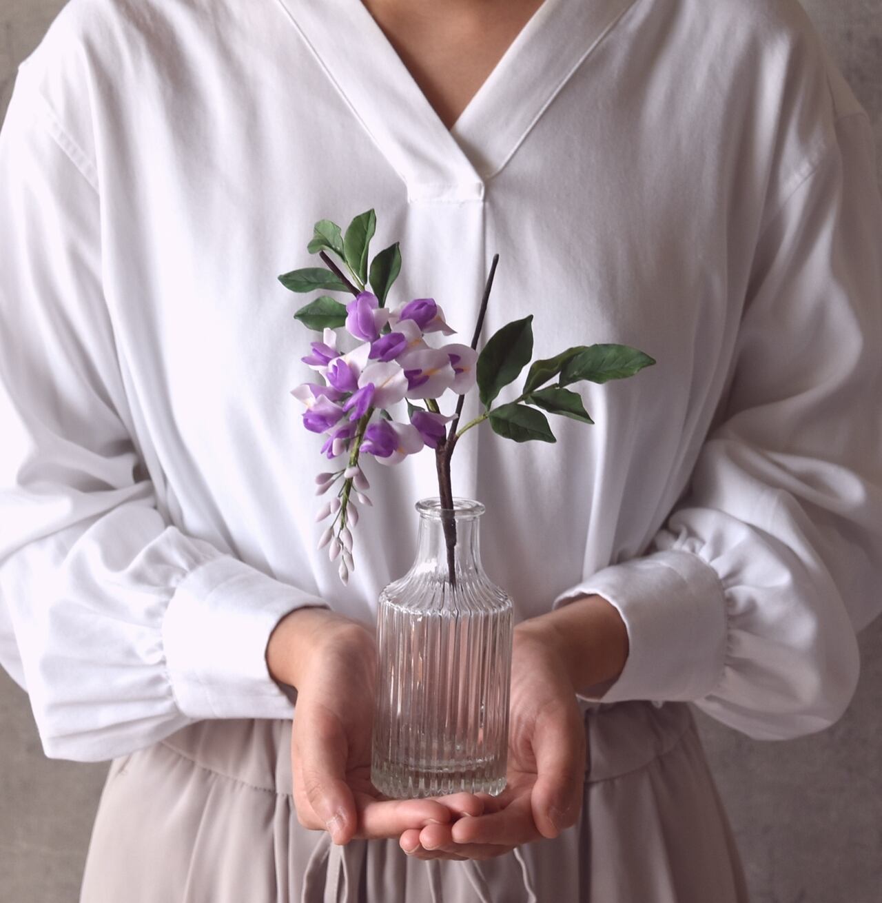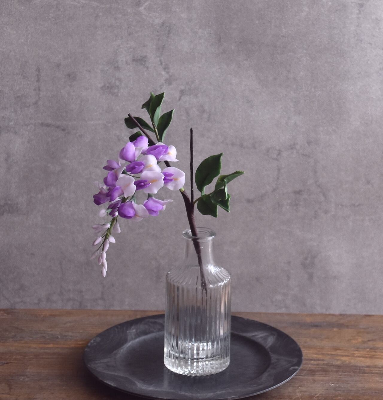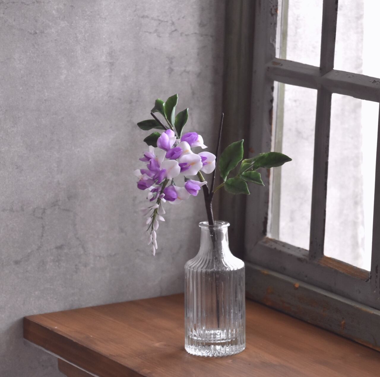 粘土で藤の花をつくり、上品なガラスボトルにアレンジしました。