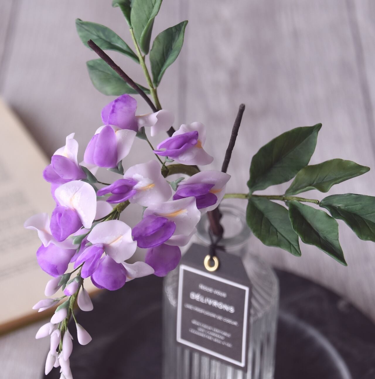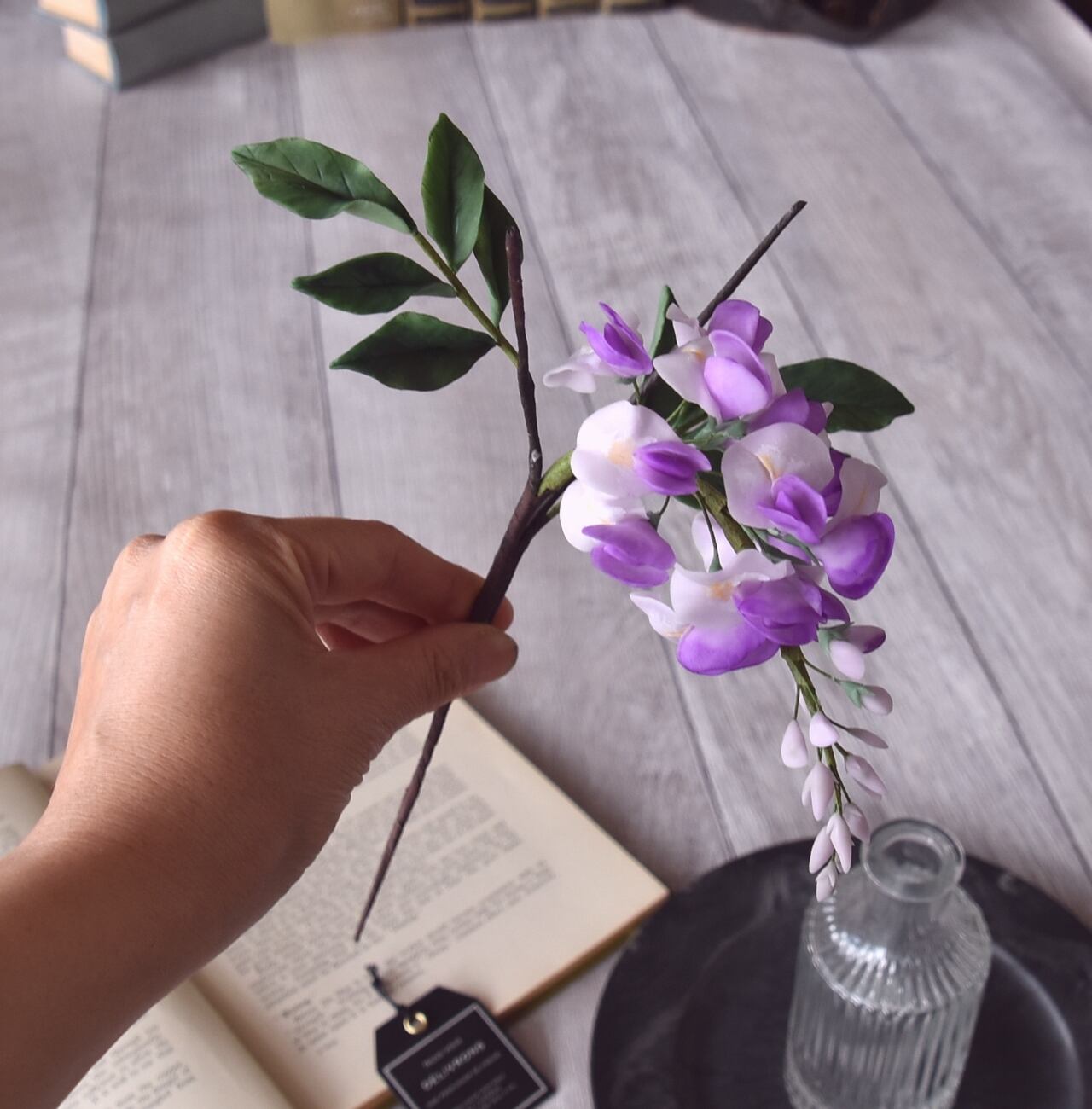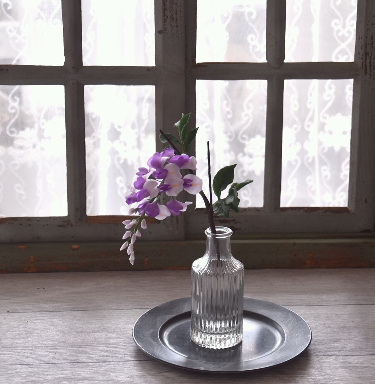 粘土で藤の花をつくり、上品なガラスボトルにアレンジしました。