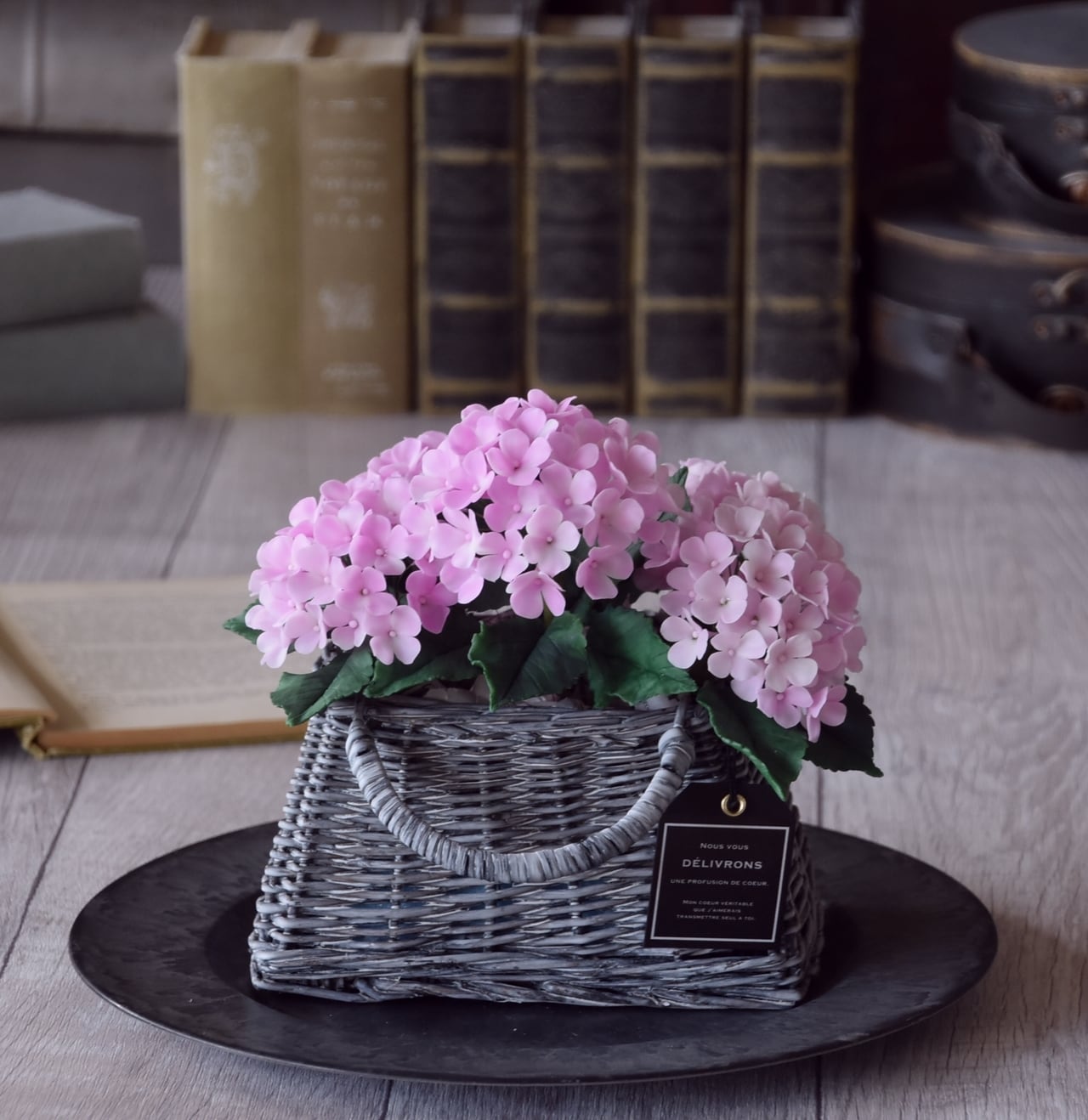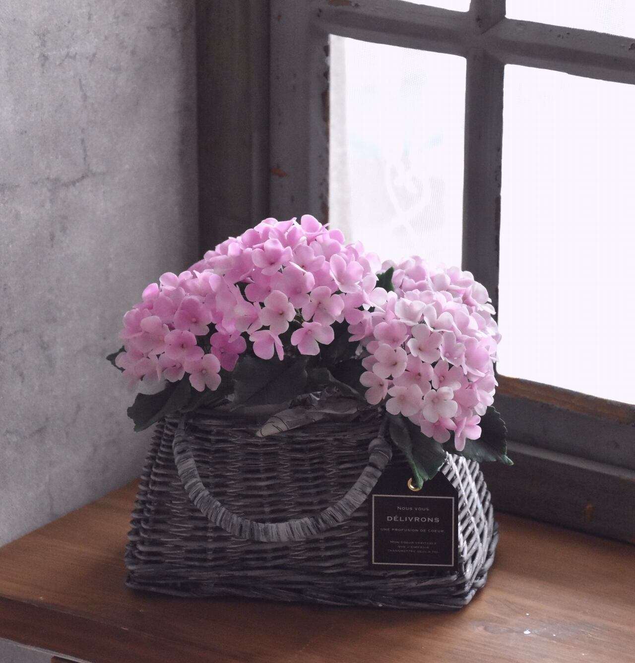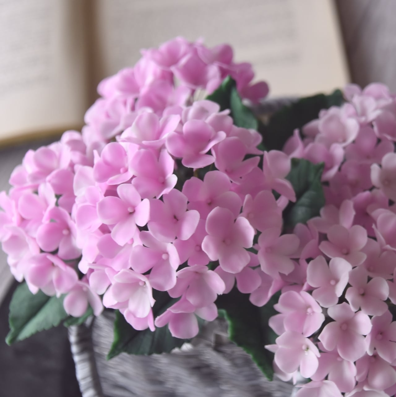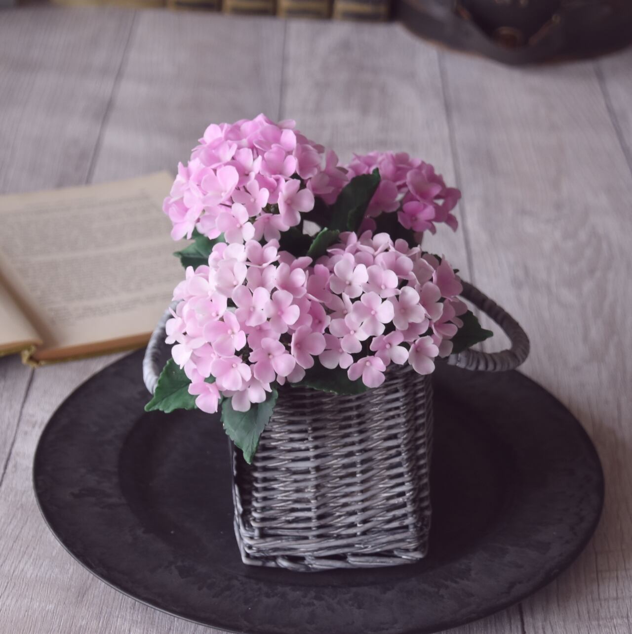 ◆粘土のお花◆ 紫陽花 ライトピンク グレーバスケット A797