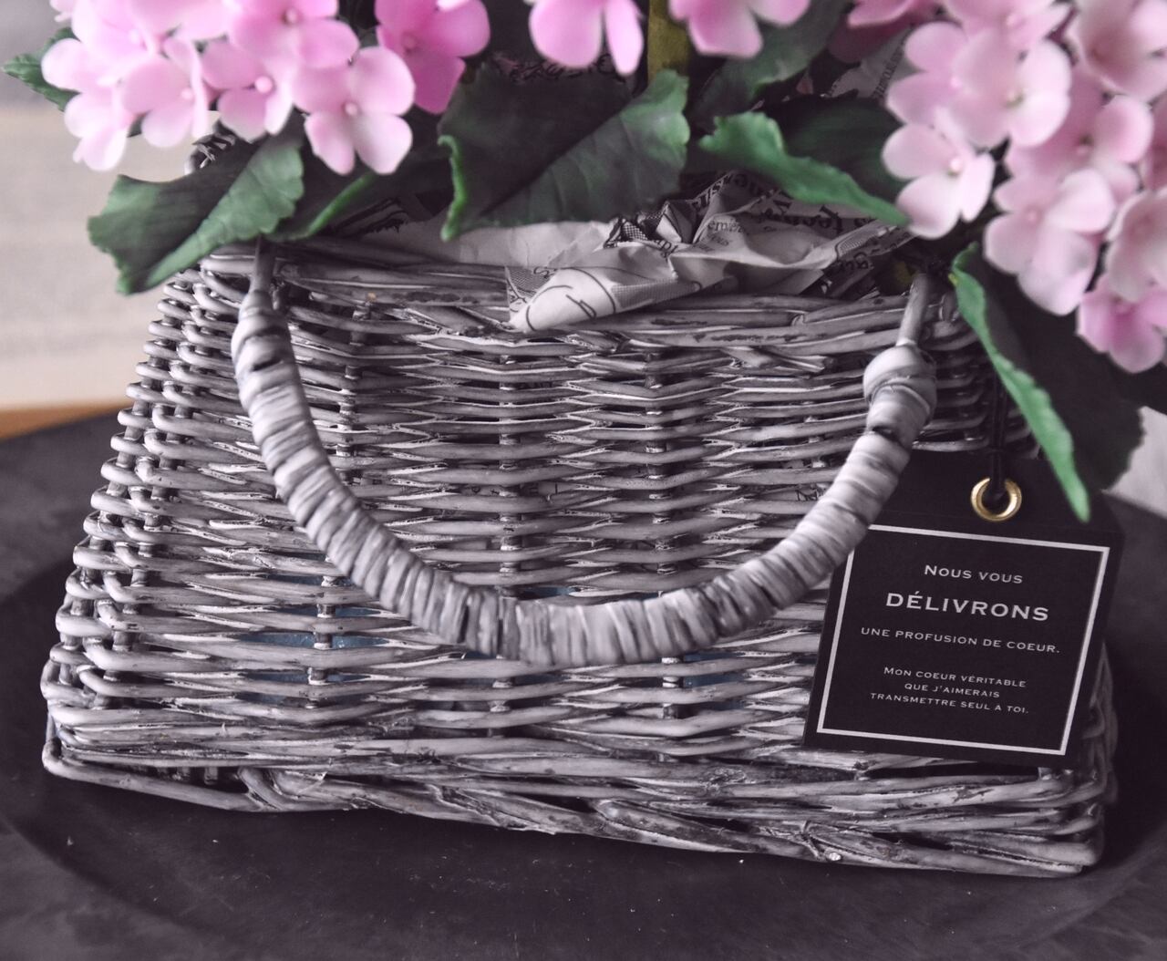 バスケットはシャビーシックな色合いのグレーのハンドルバッグ型のバスケットです。