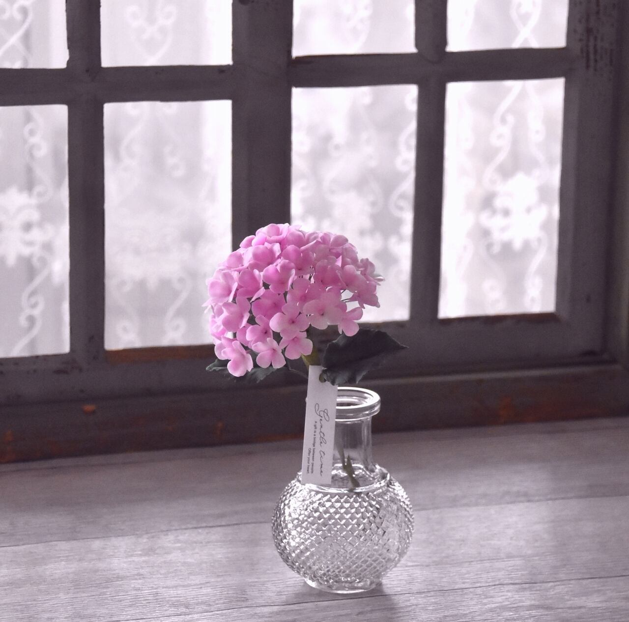 フラワーベースはシンプルなのに存在感が抜群で、淡い色合いの紫陽花の可愛らしさを引き立ててくれます。