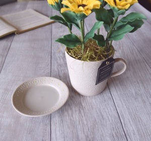 フラワーポット(カップ&ソーサー型ポット)はベージュにエンボス加工の可愛いレース柄です。