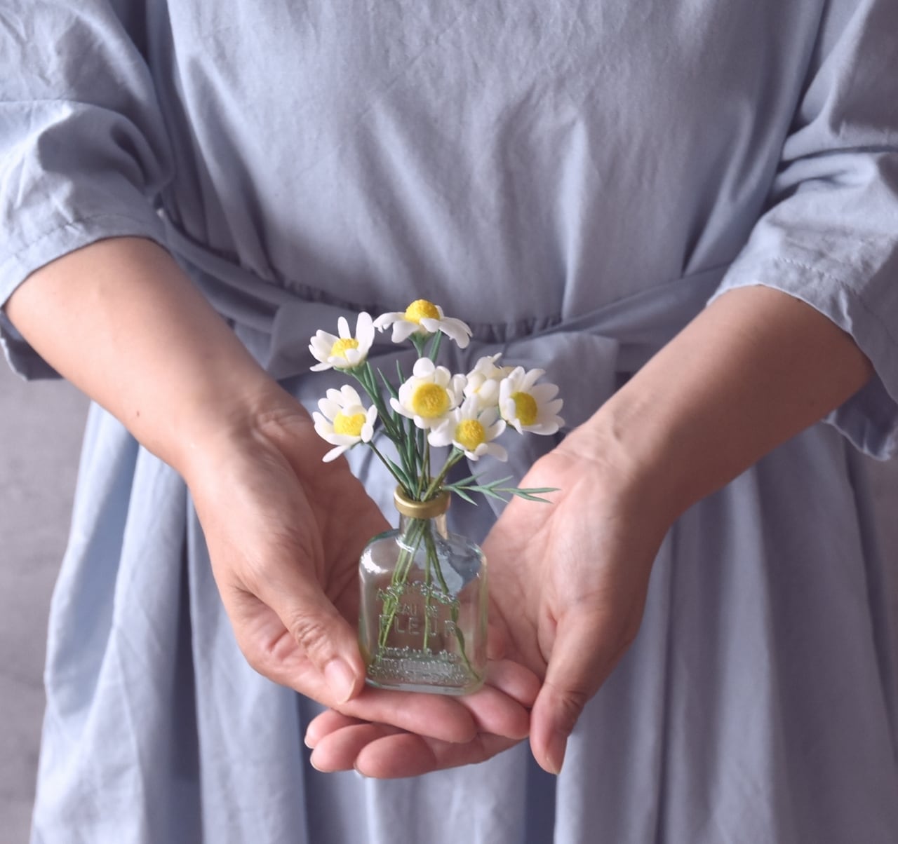 粘土でカモミールをつくり、小さなホラリング・プティボトル にアレンジしました。