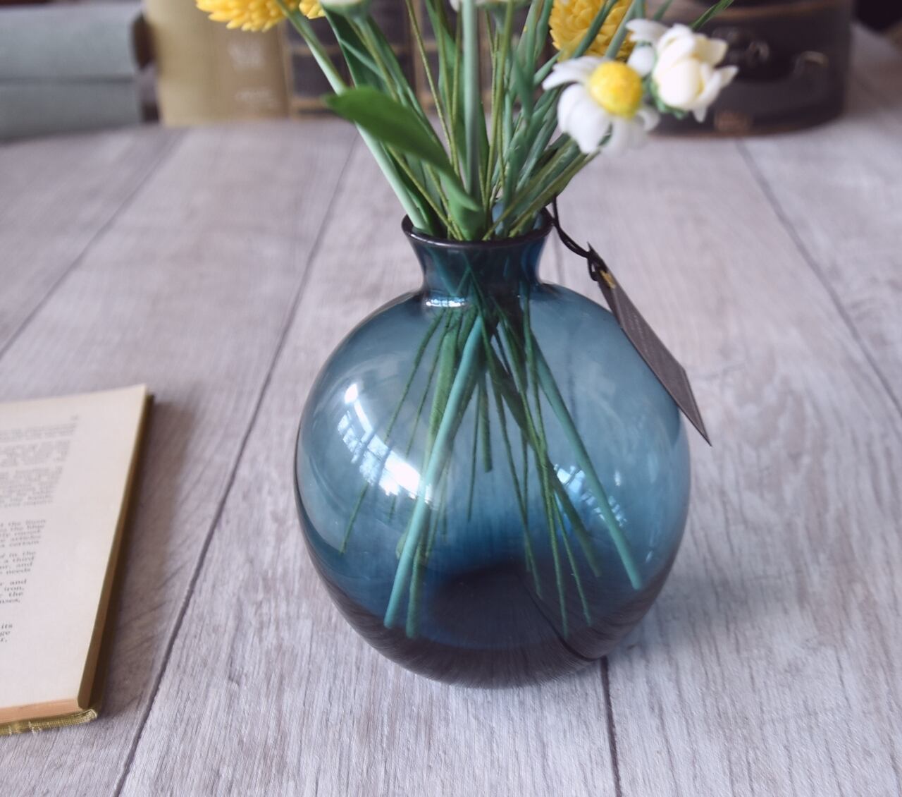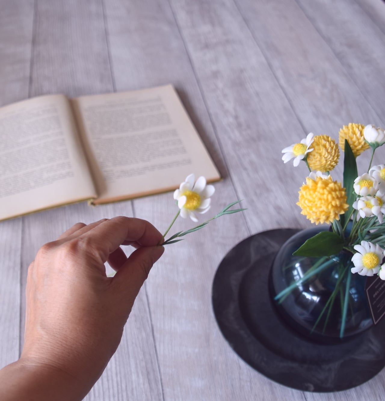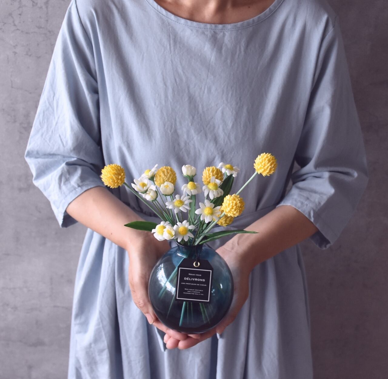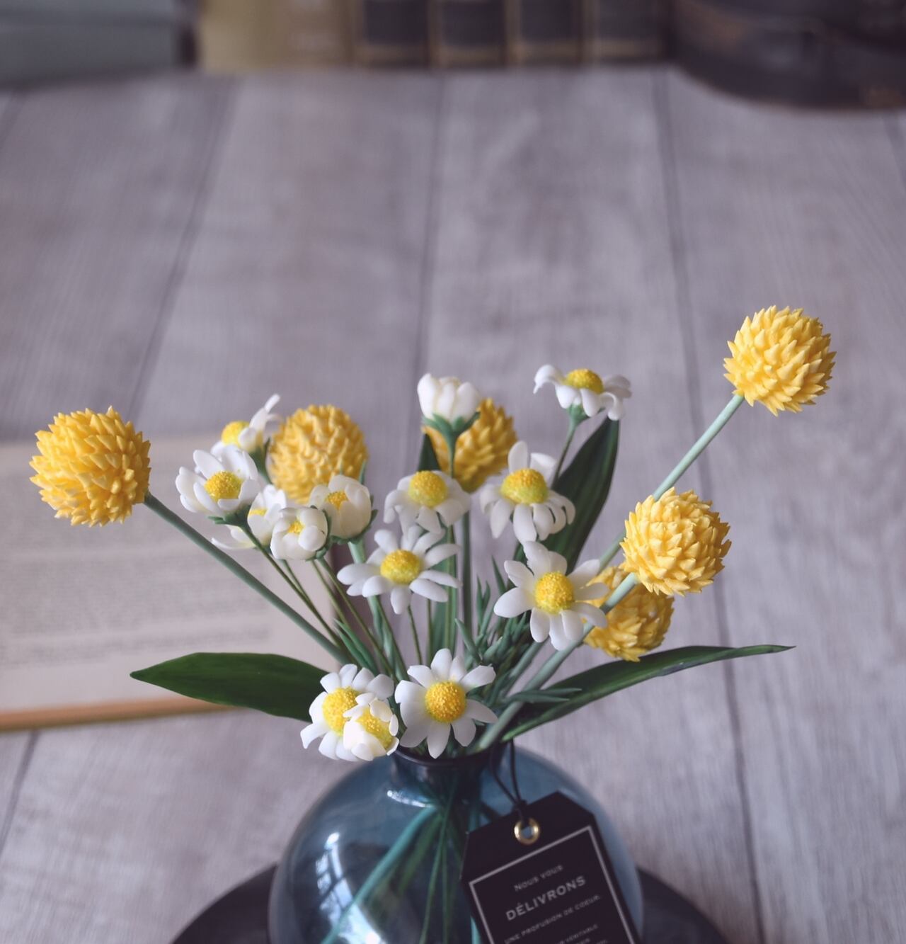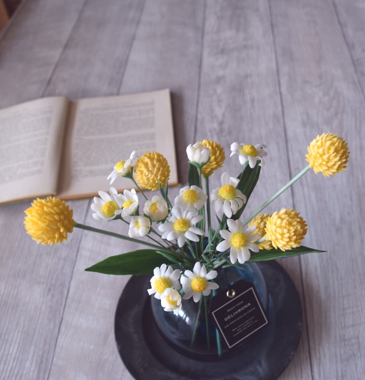 粘土でカモミールとビリーボタン(クラスペディア)をつくり、シンプルだけど可愛い、ぽってりとしたボトルにアレンジしました。