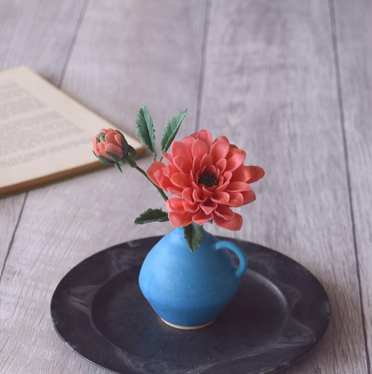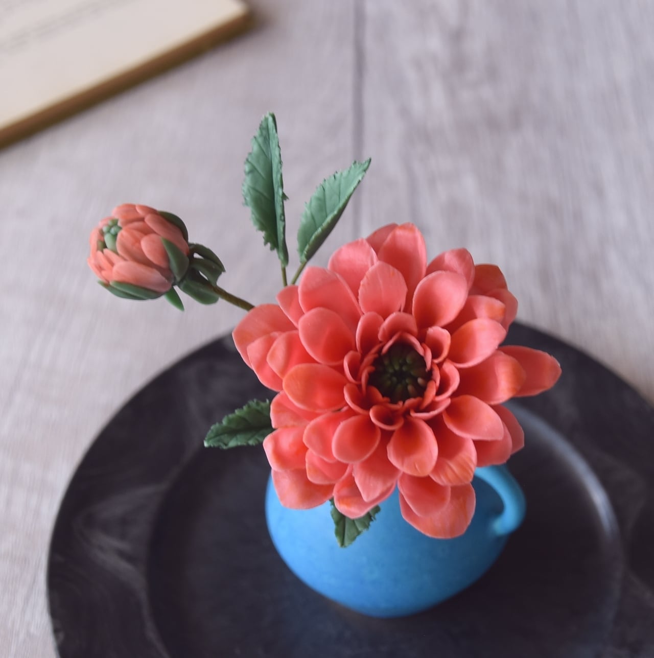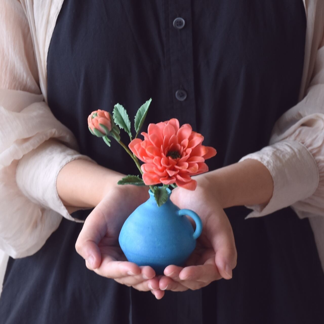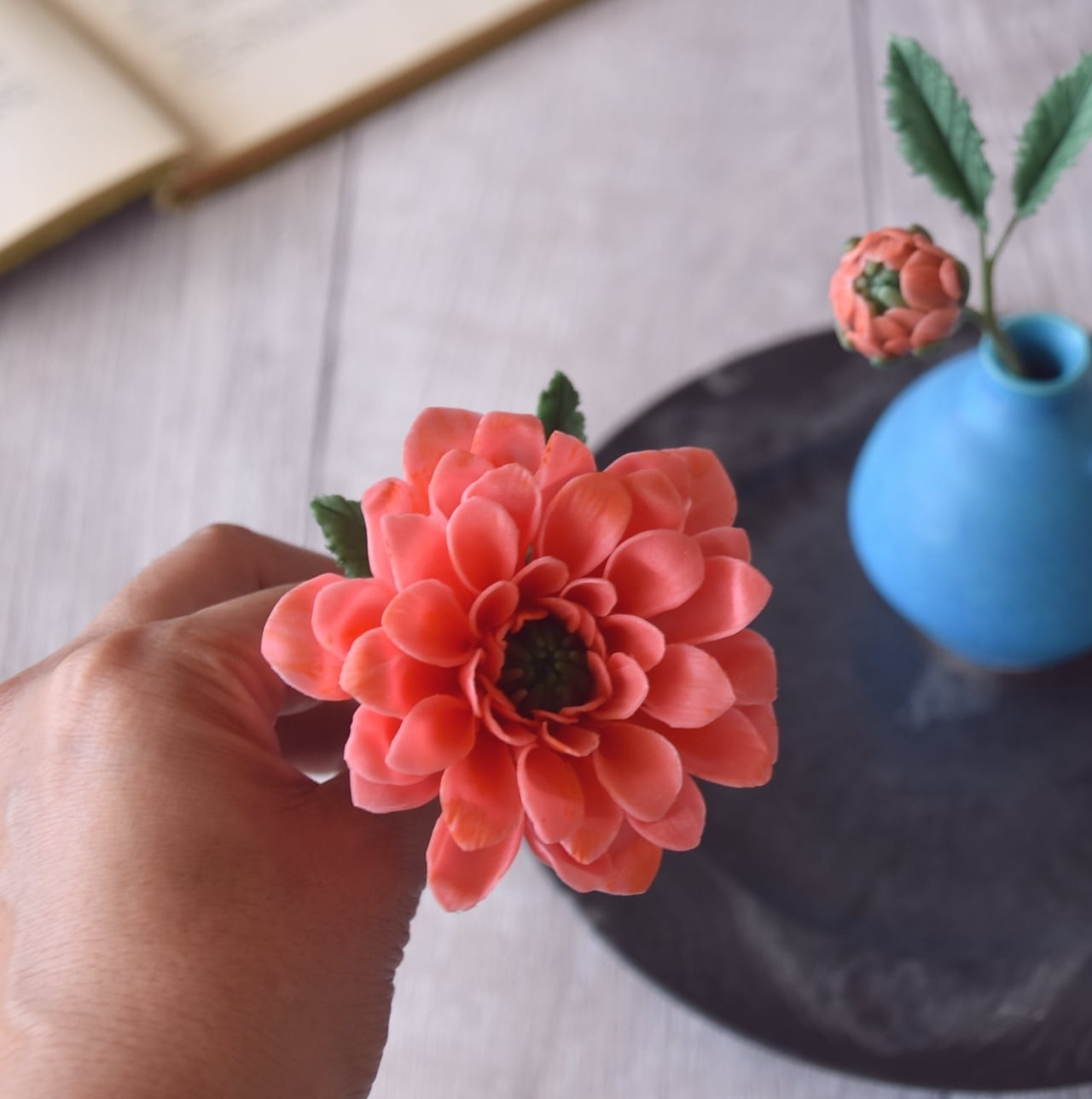 ダリアは色の種類だけでなく、花弁の形や咲き方も様々なものがありますが、八重咲きの豪華な花弁を一輪挿しのサイズに合うように制作しました。