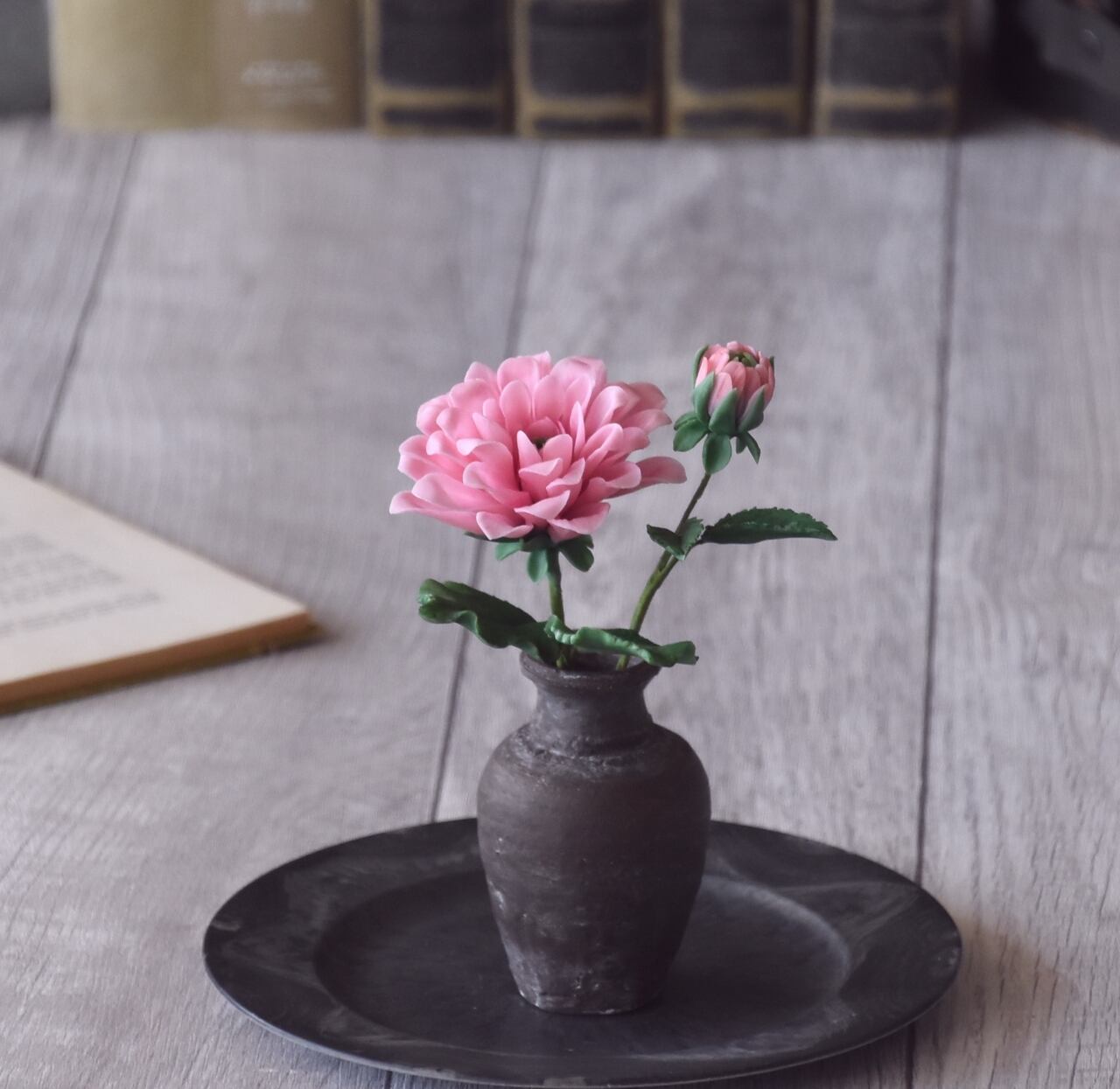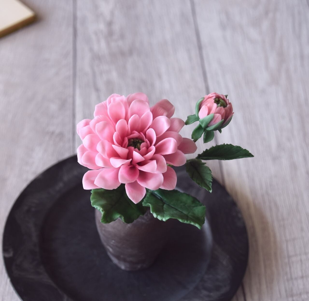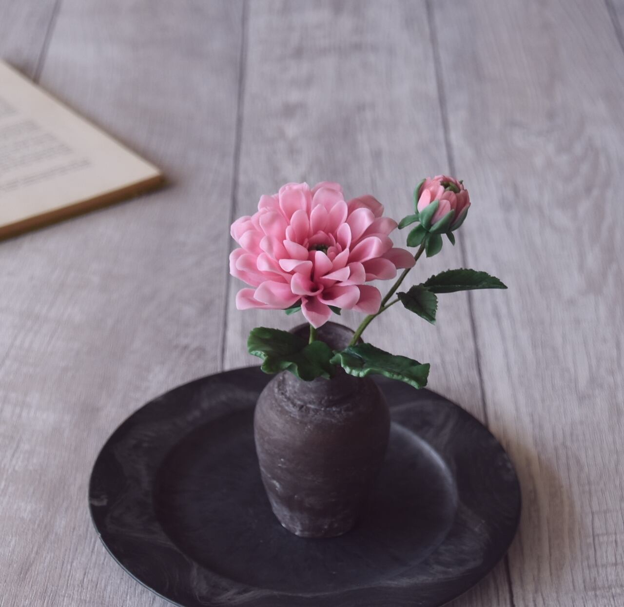 ダリアは色の種類だけでなく、花弁の形や咲き方も様々なものがありますが、この作品は八重咲きの豪華な花弁を一輪挿しサイズの壺に合うように制作しました。