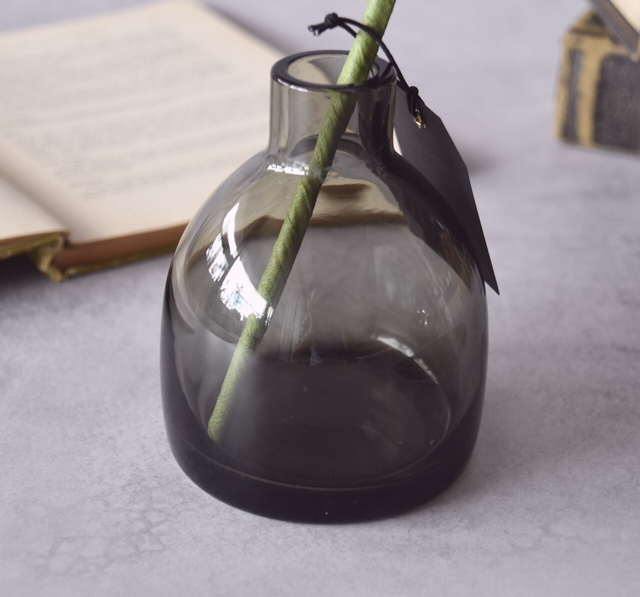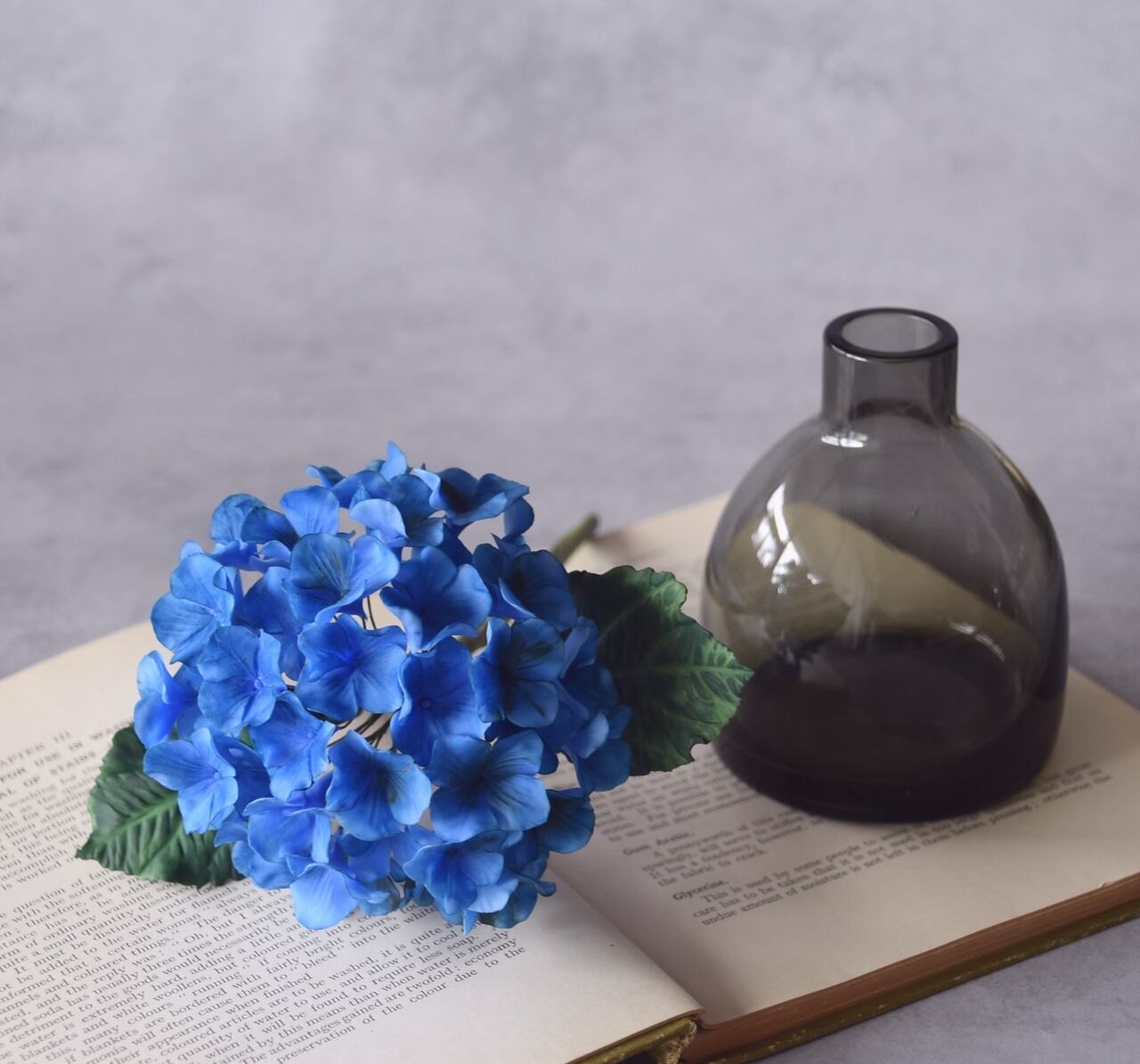 ダークなブラックカラーが秋色紫陽花のアンティークな色合いとマッチするオシャレなガラスベースです。