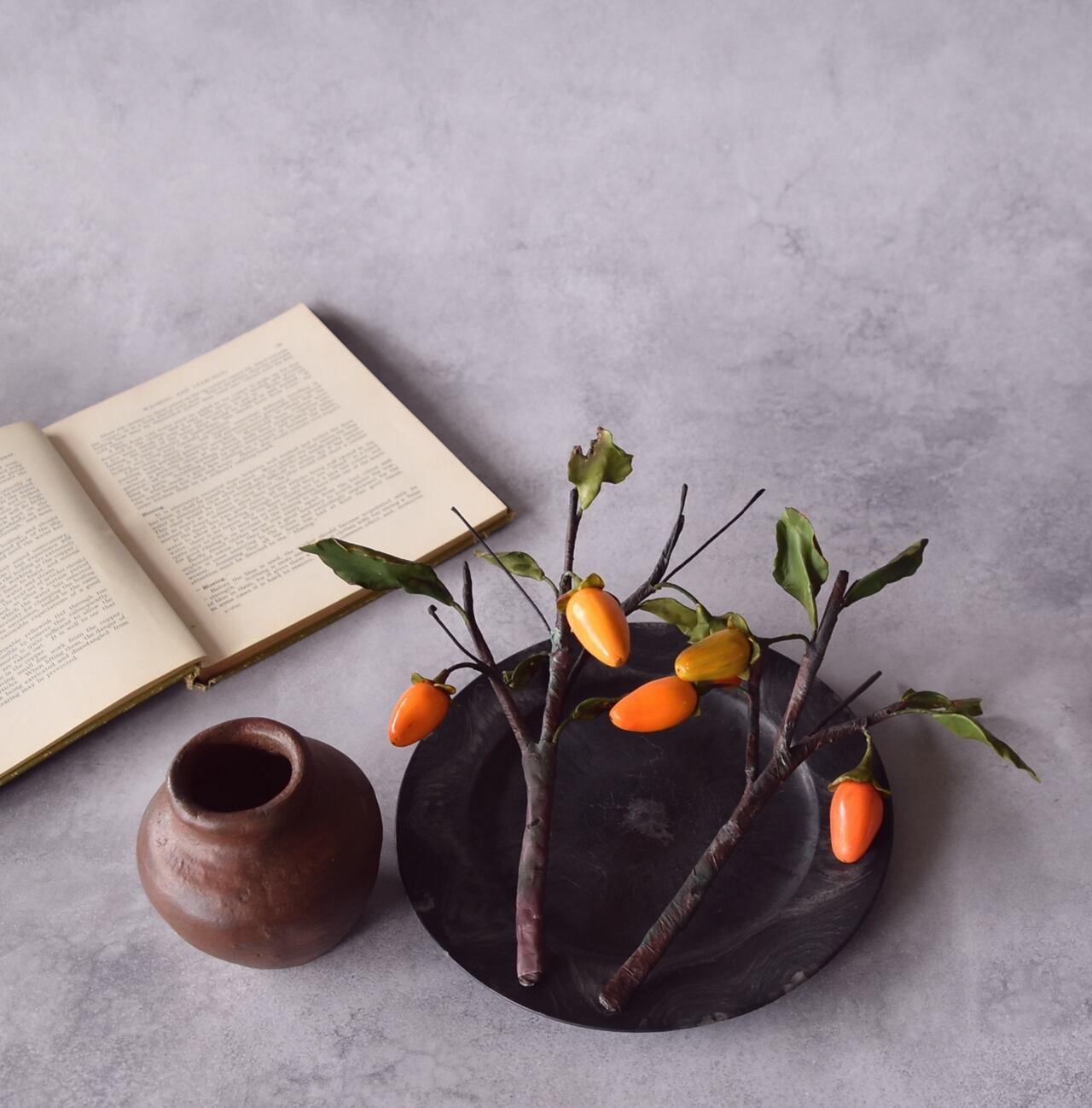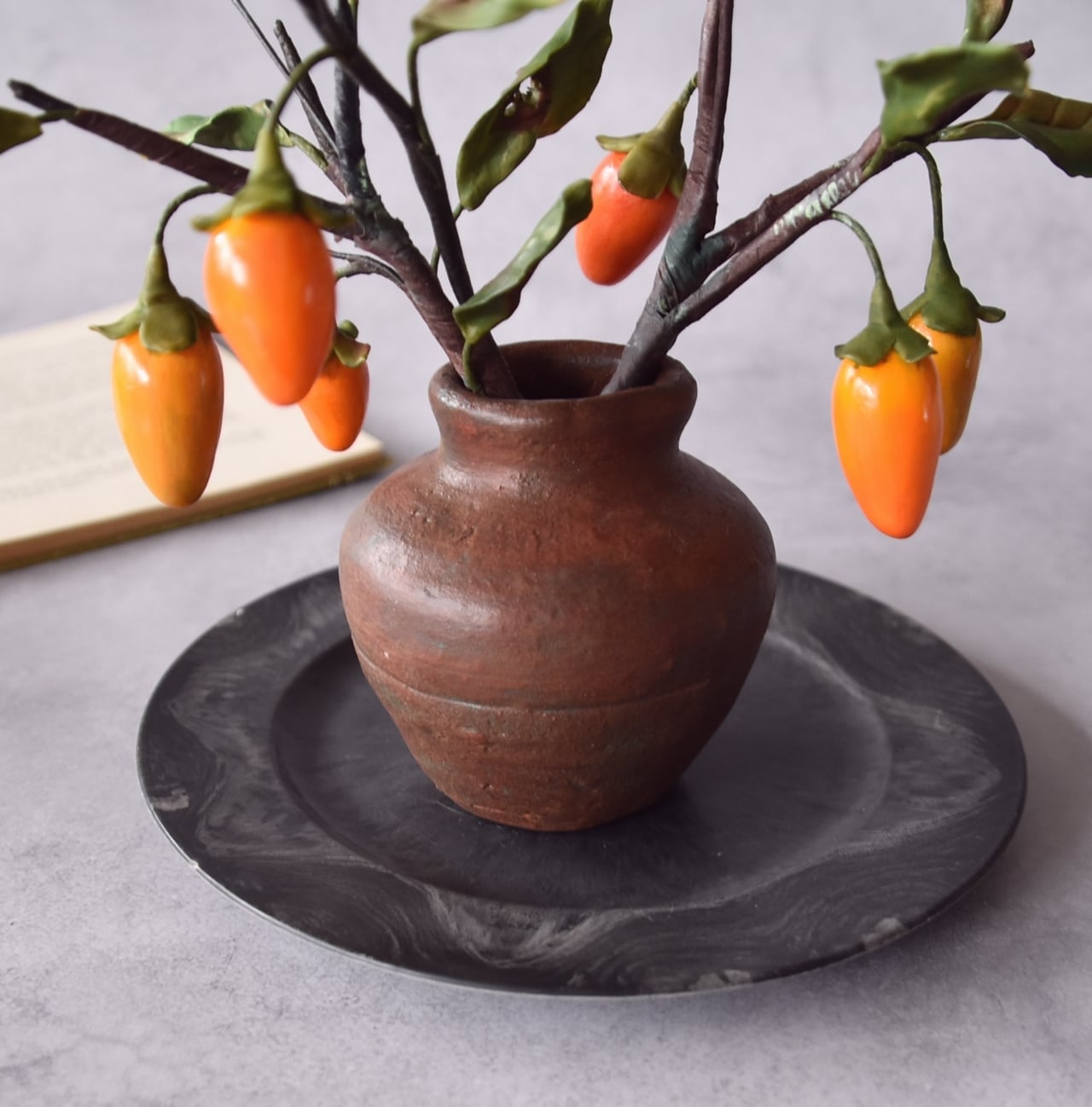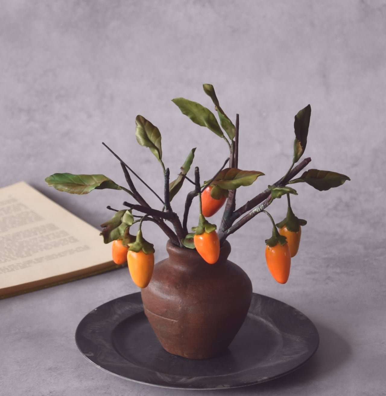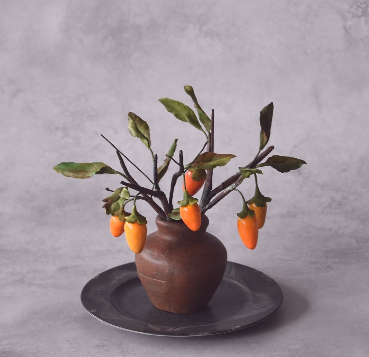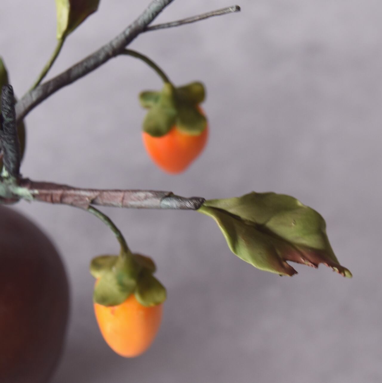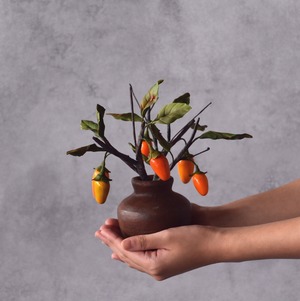 粘土で柿(老爺柿)を作り、小さな壺にアレンジしました。
