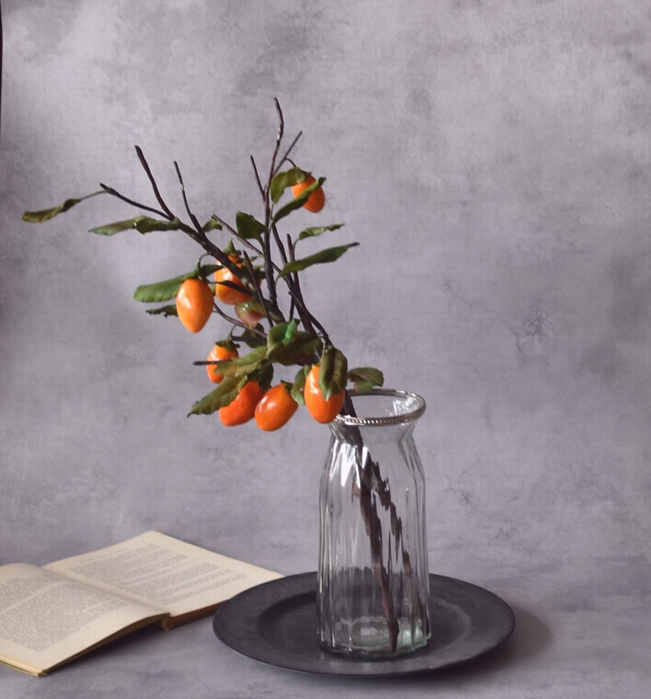 ぷっくりとした可愛い実をつけた大きな枝を3本をエレガントフラワーベースにざっくりと生けました。