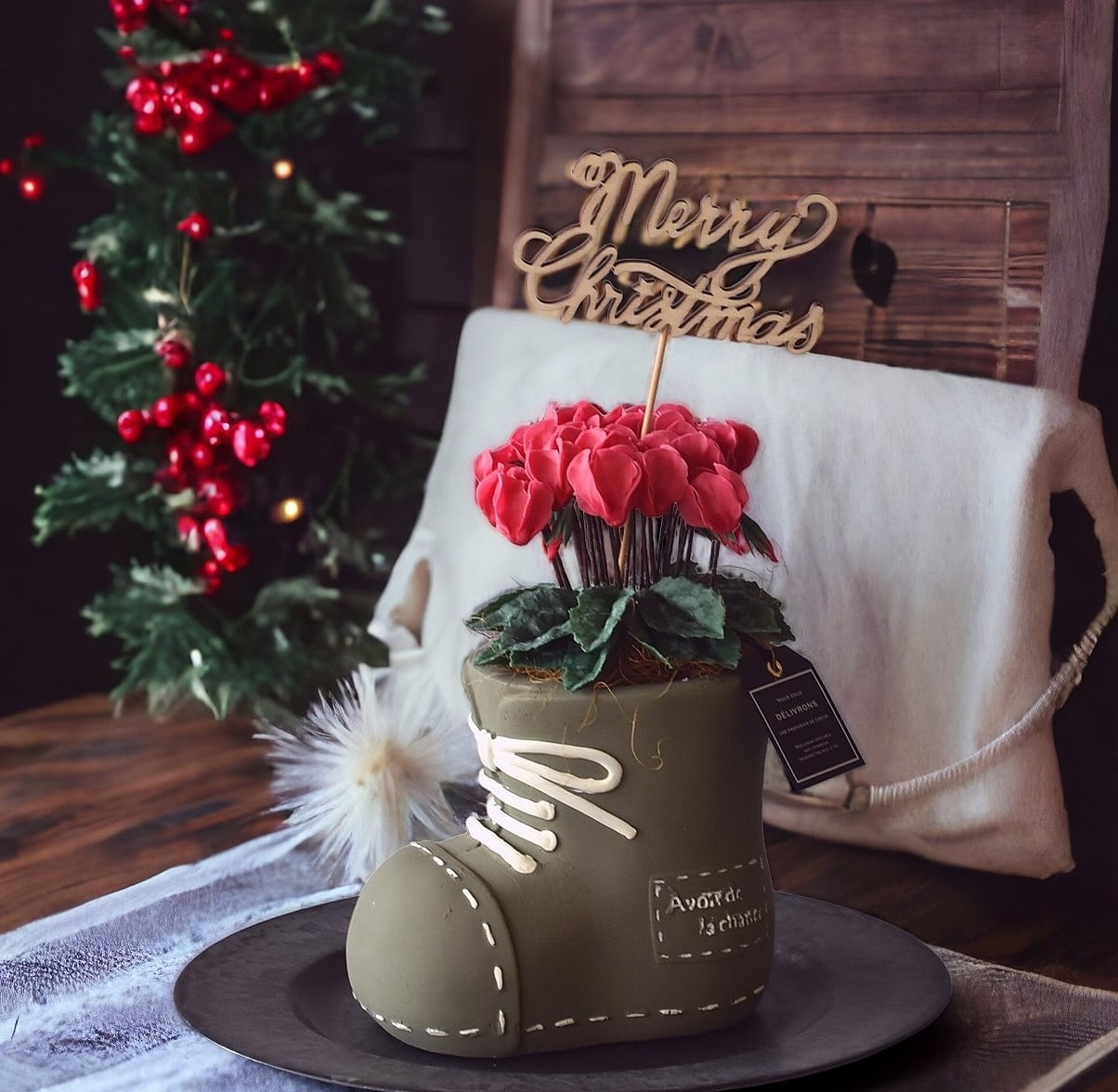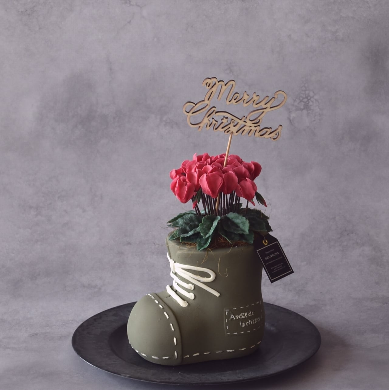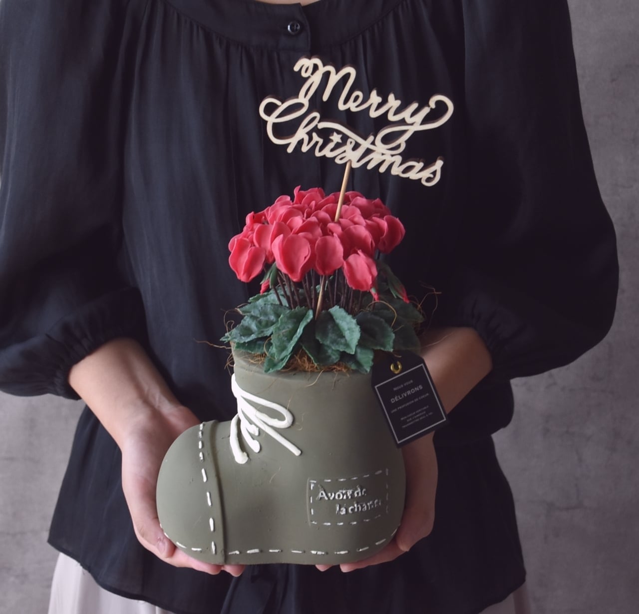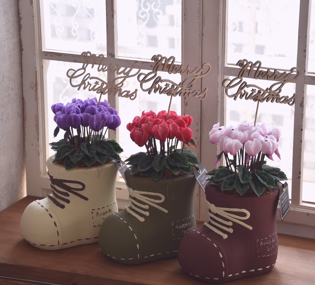 粘土でシクラメンを作り、可愛いクリスマスブーツモチーフのポットにたっぷりと植え込みました。