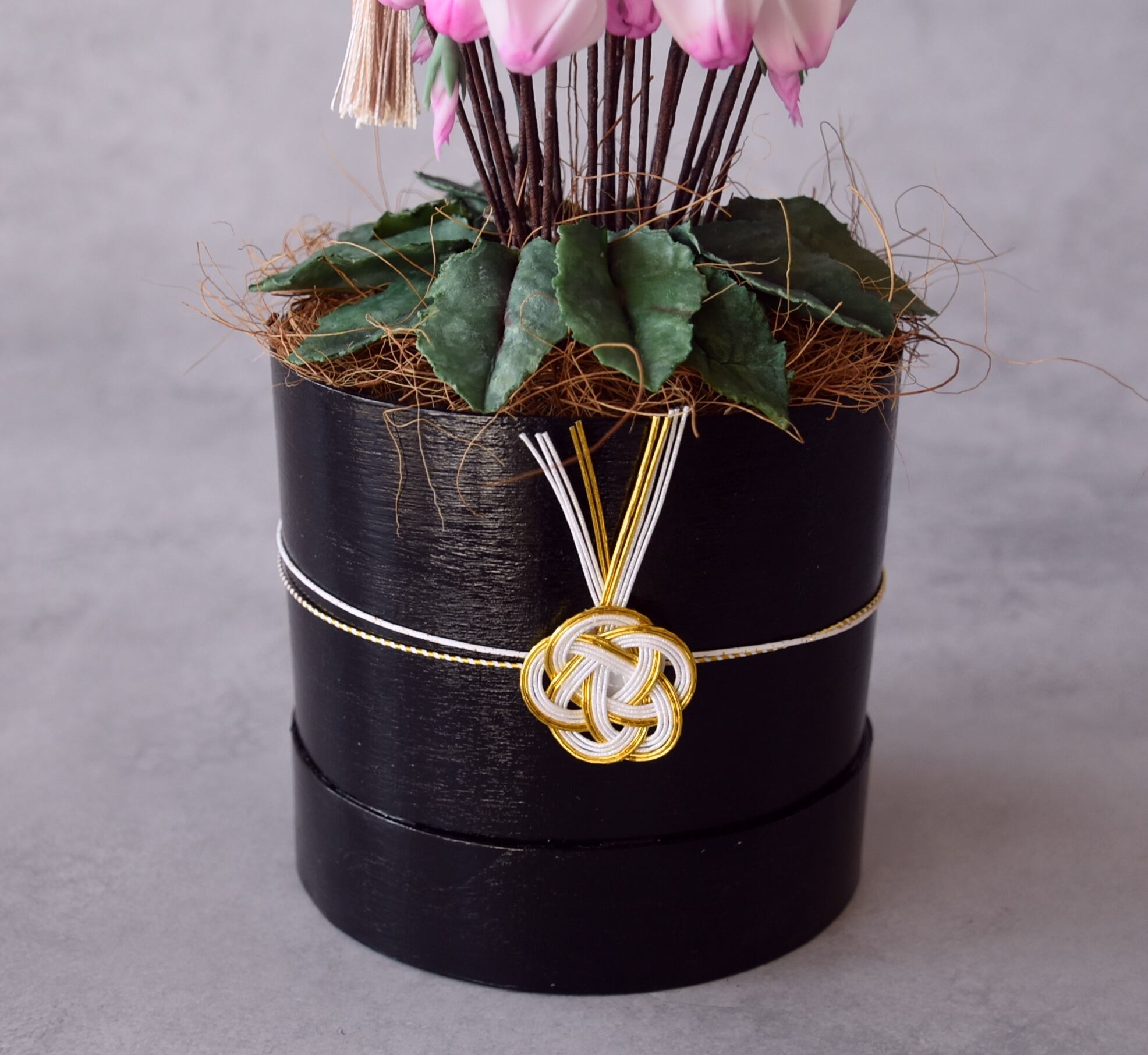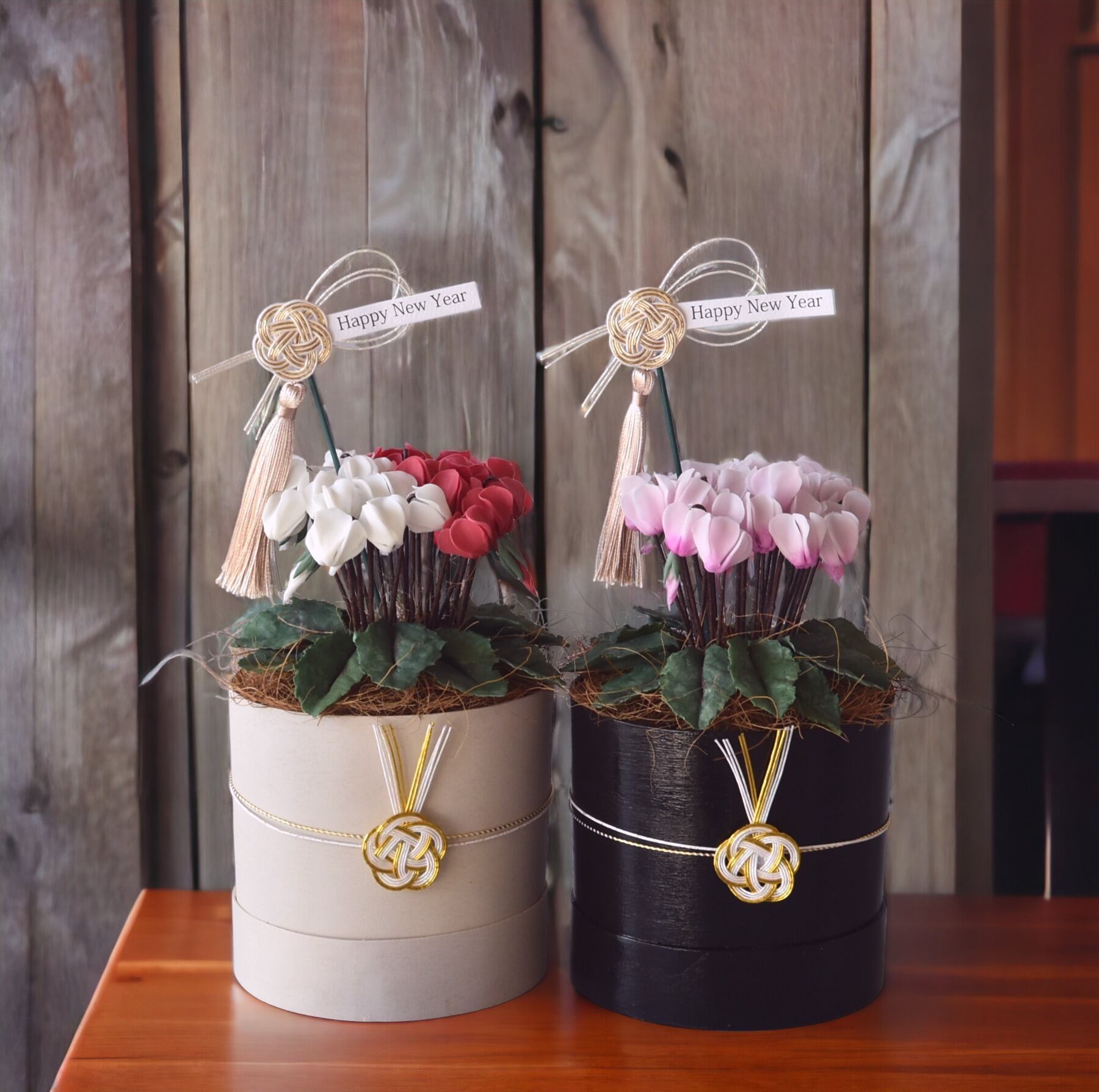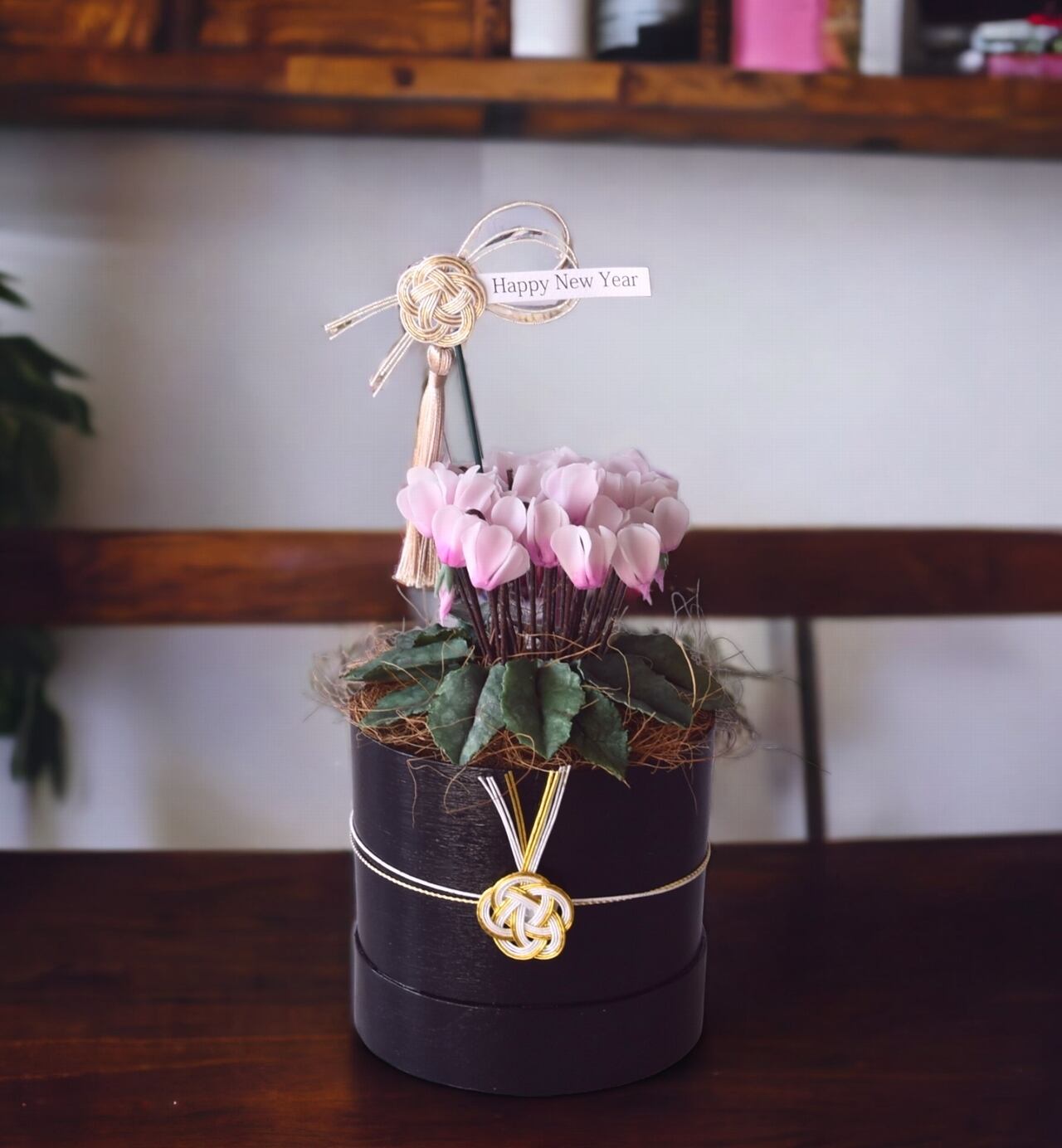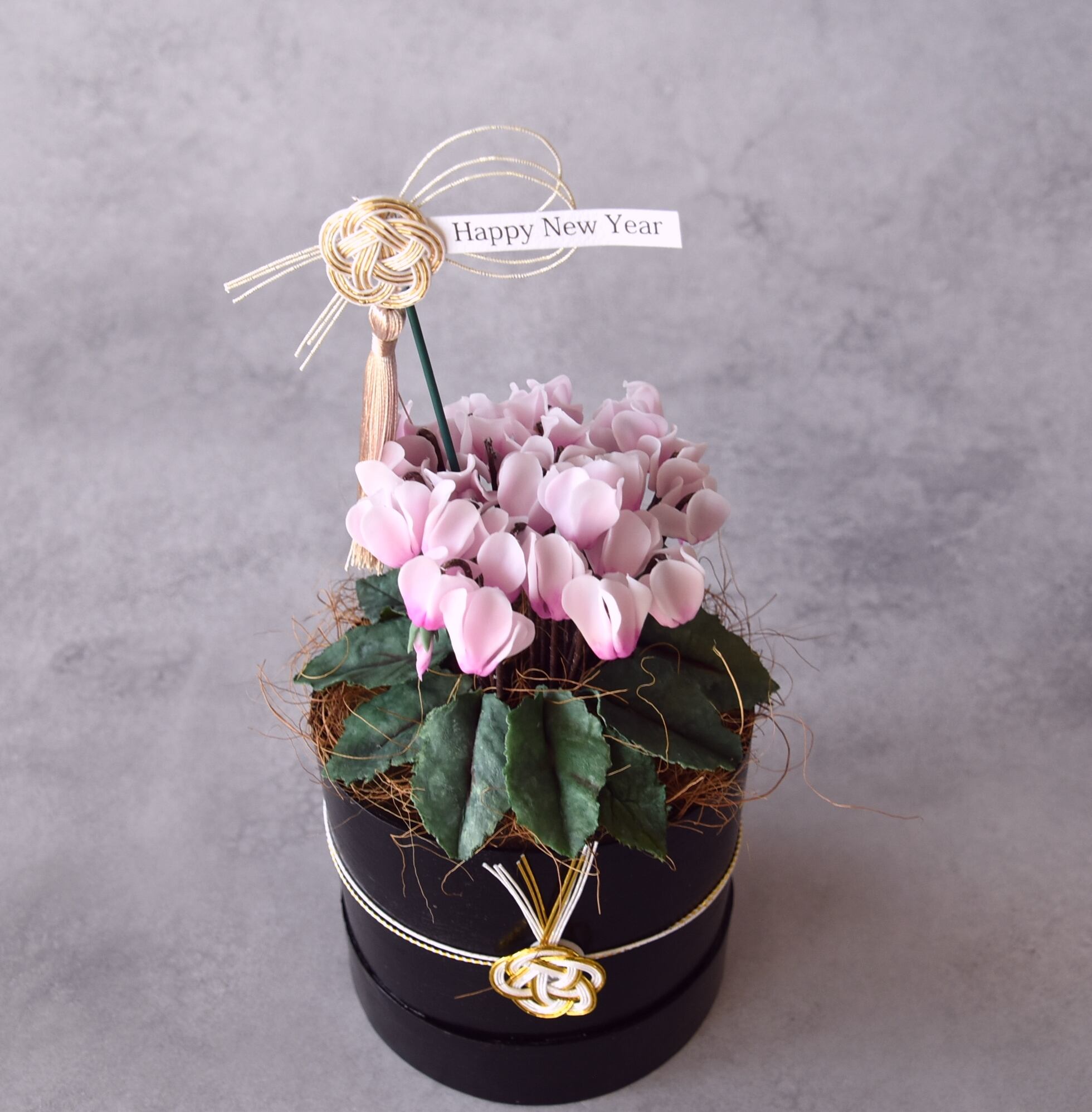 【粘土のお花】 毎年飾れる♪ 小さなシクラメン ピンク 黒いボックス お正月アレンジ S898