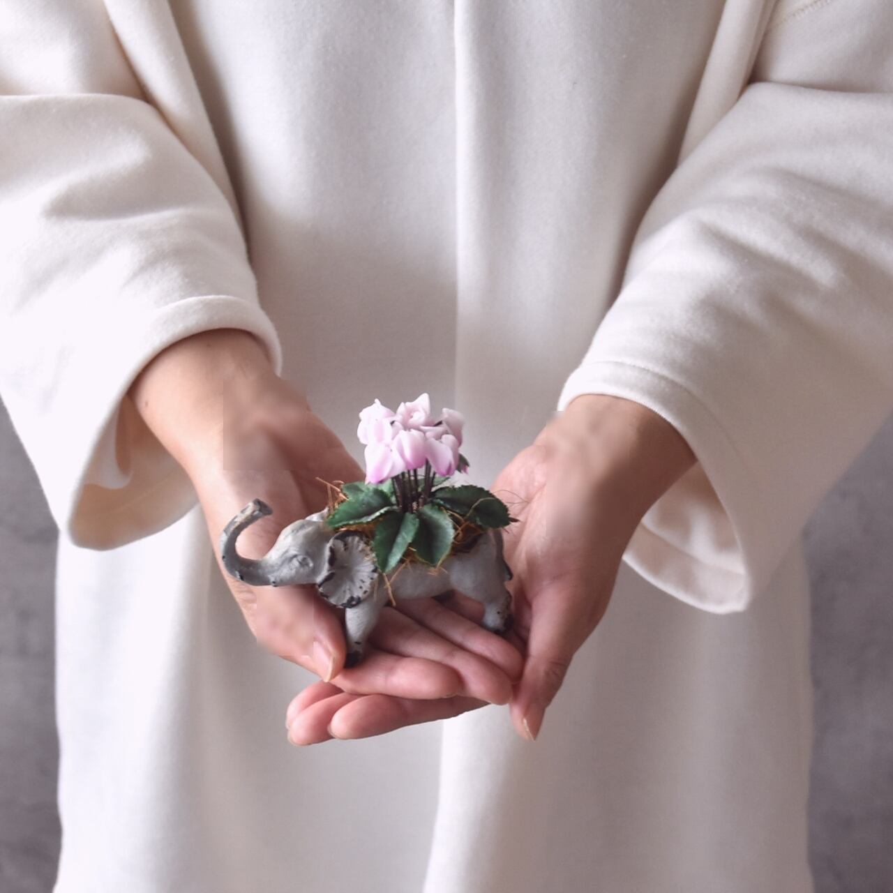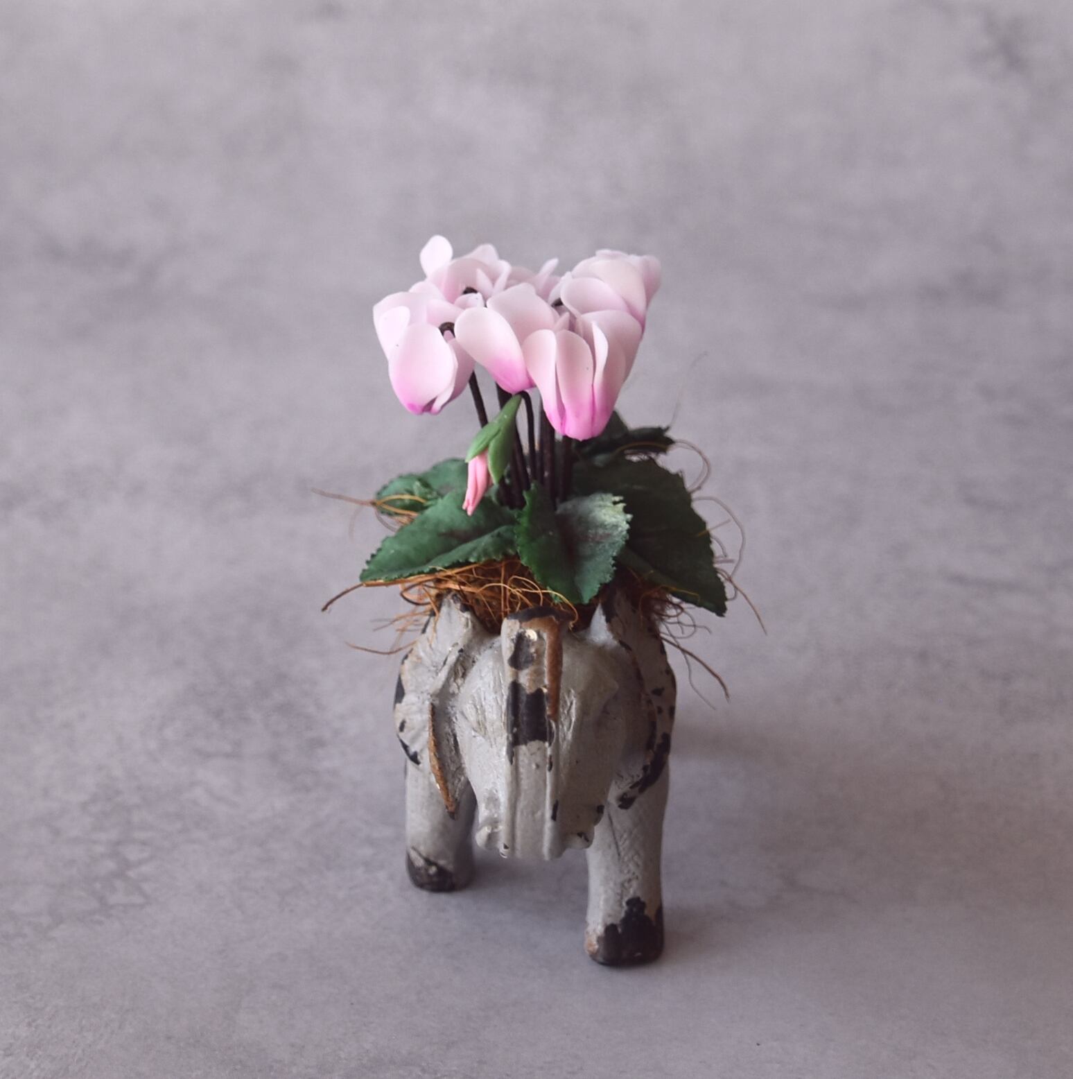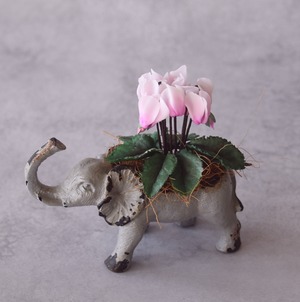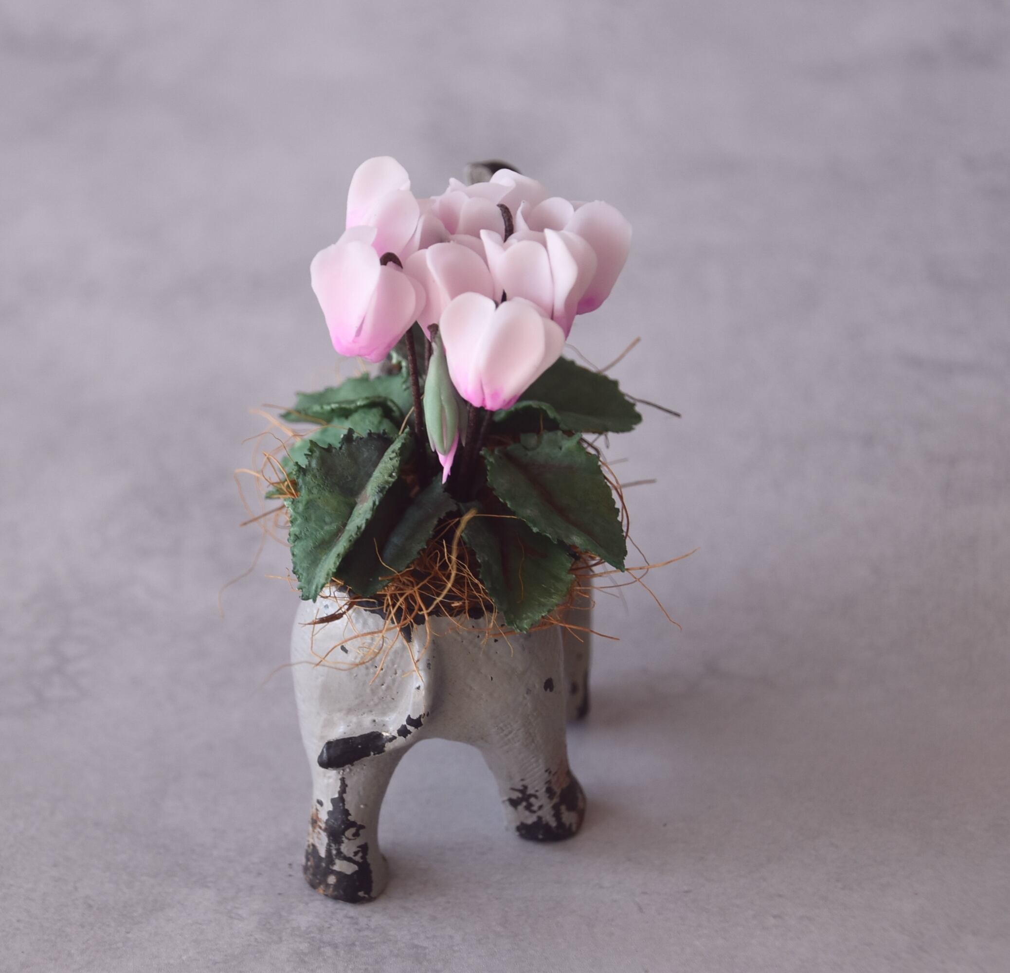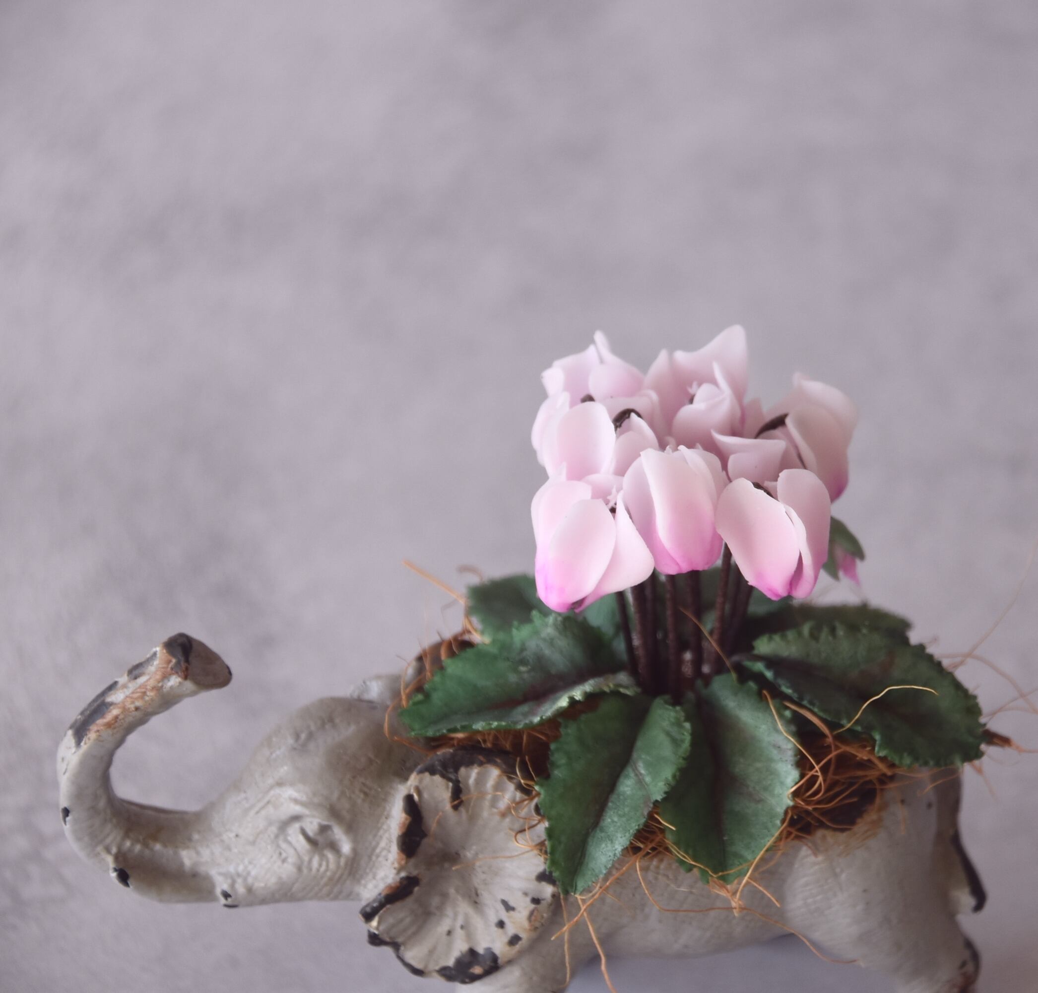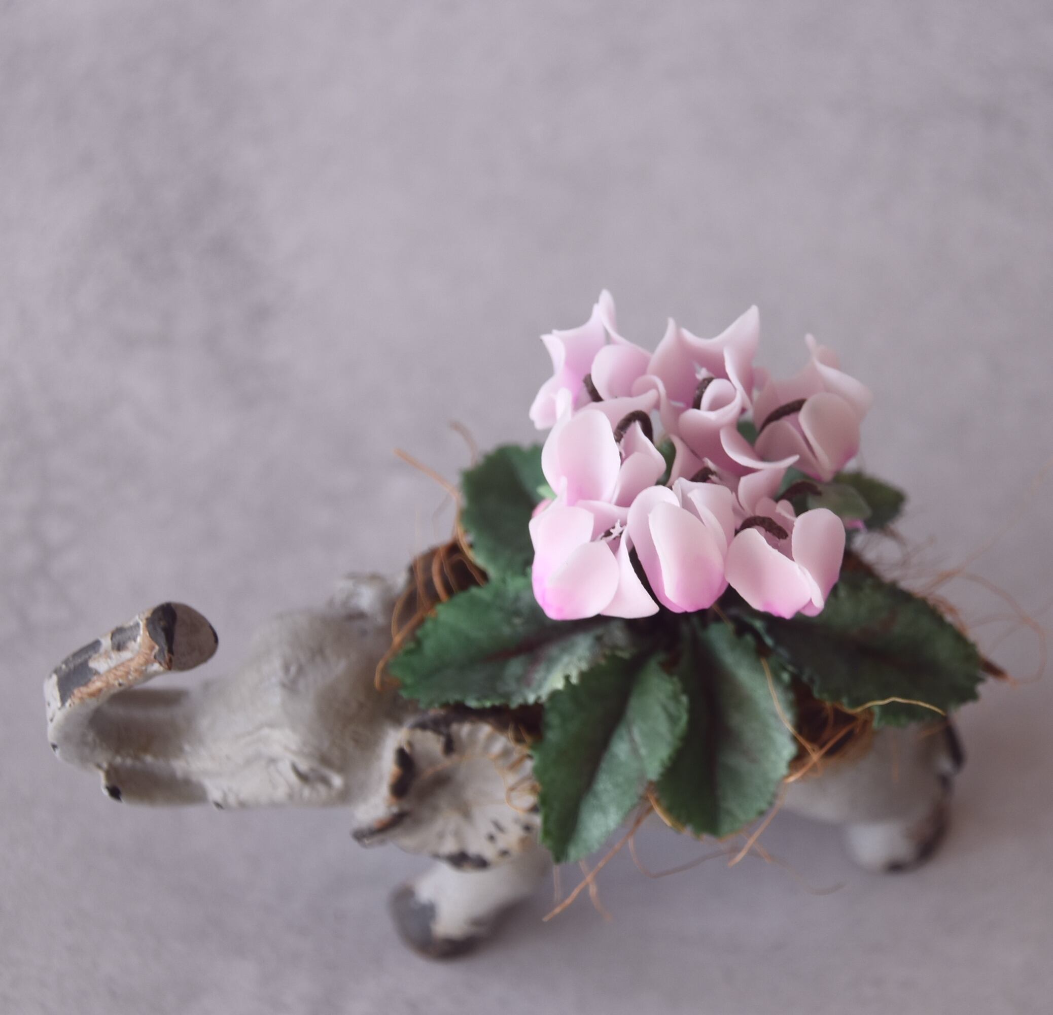 粘土でシクラメンを作り、アンテーィク調のゾウポットにたっぷりと植え込みました。