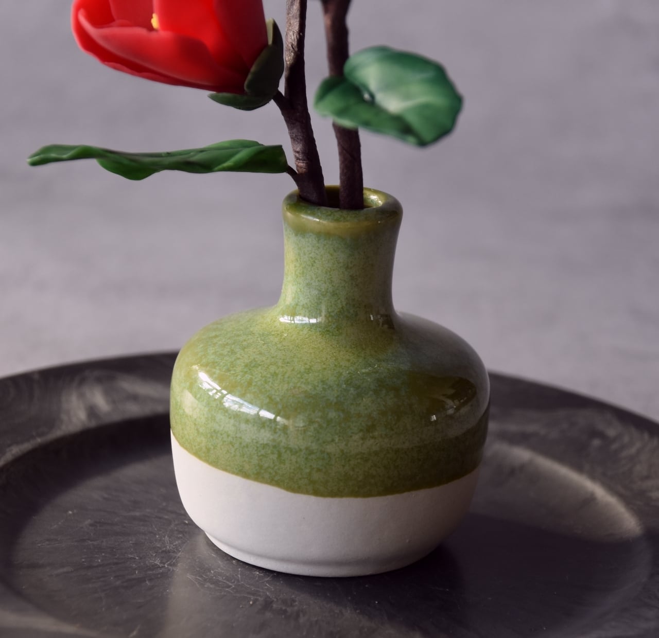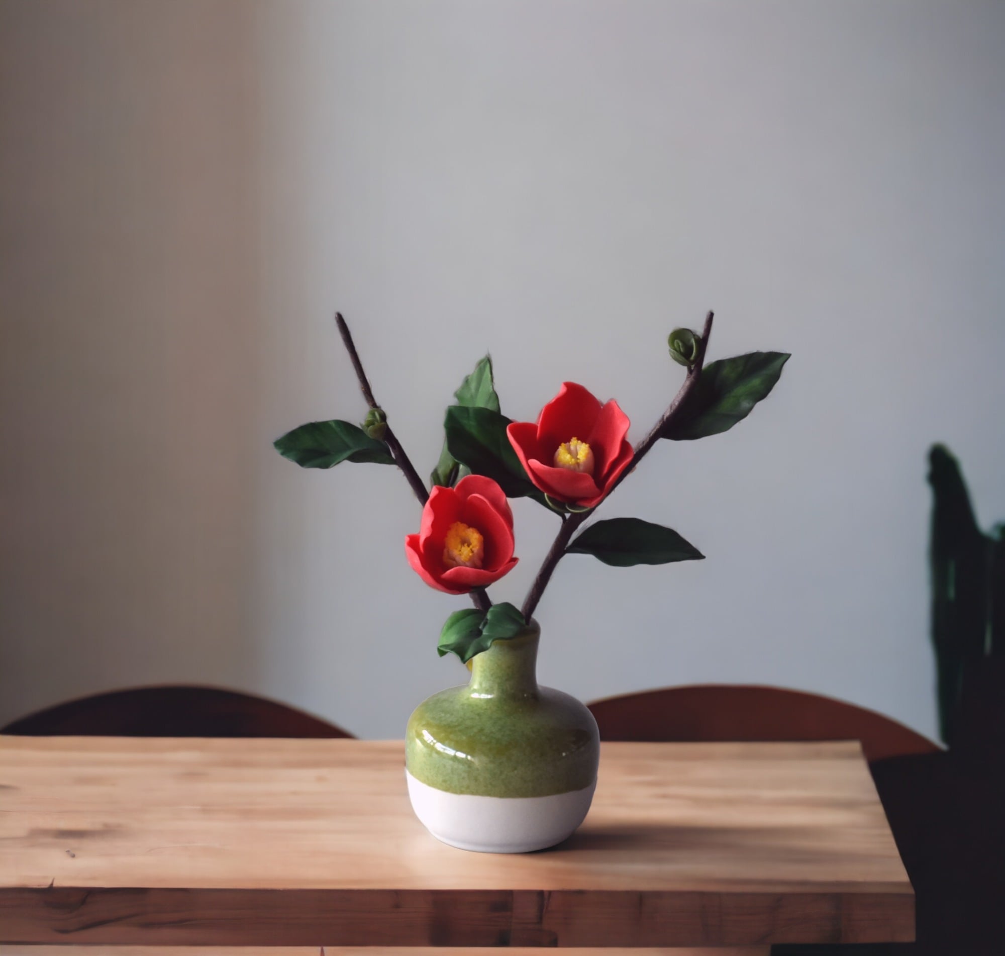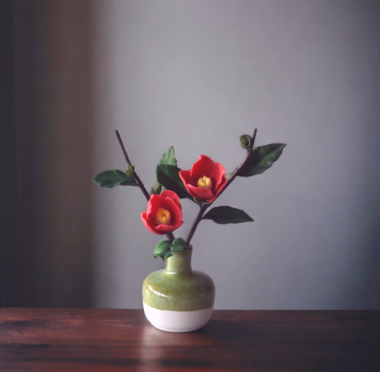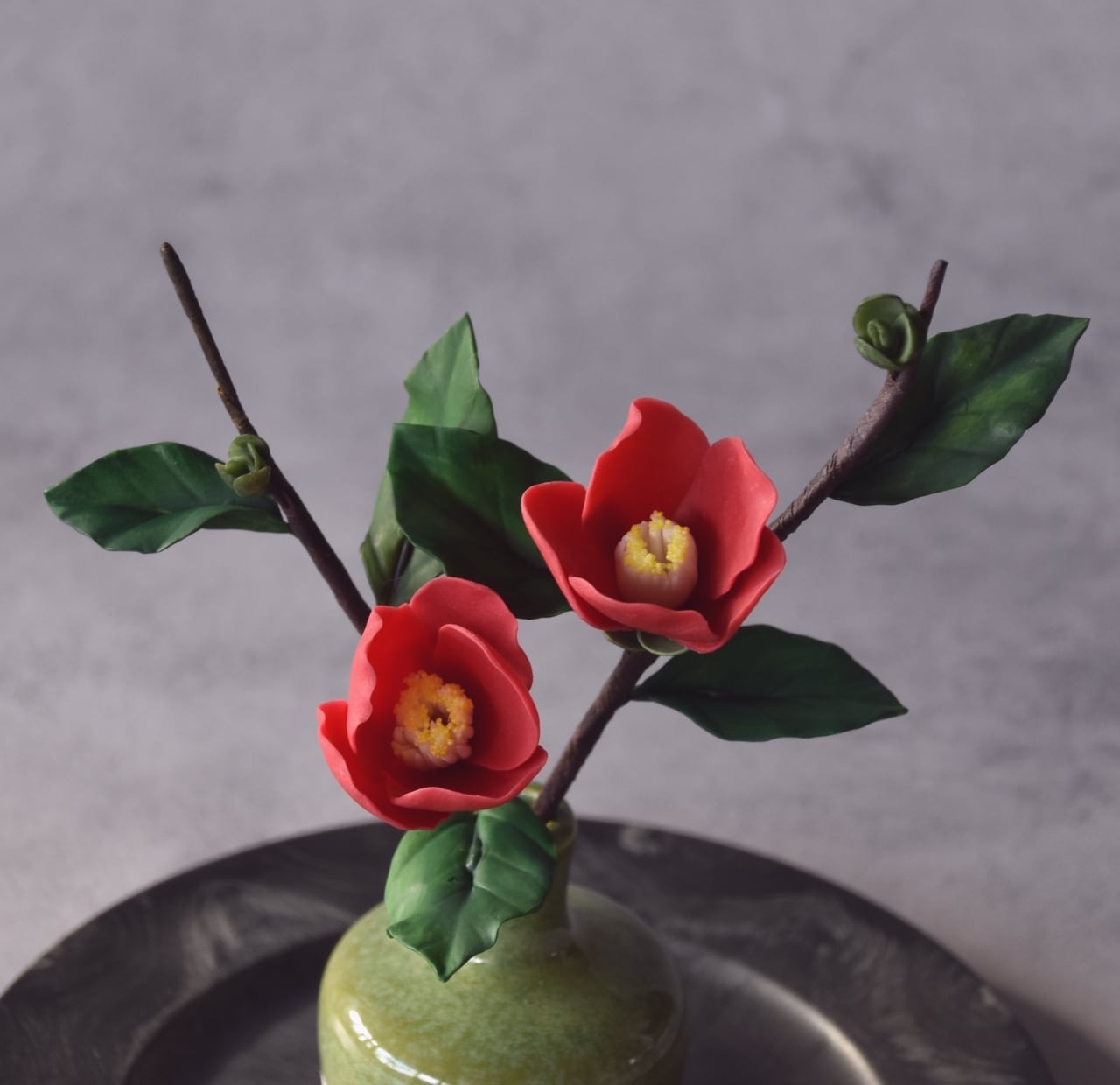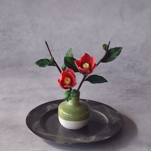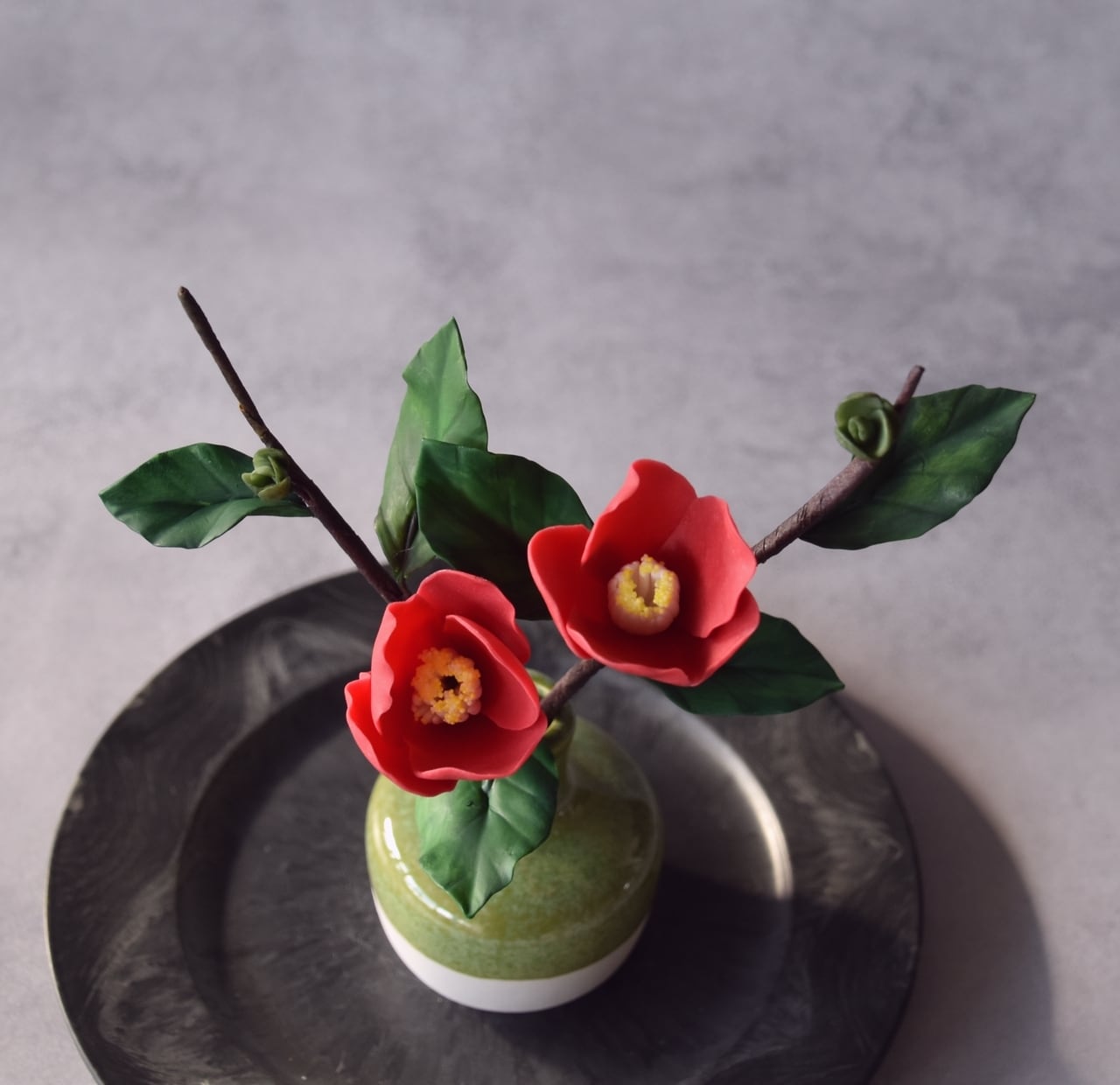 粘土で椿をつくり、小さなフラワーベースにアレンジしました。