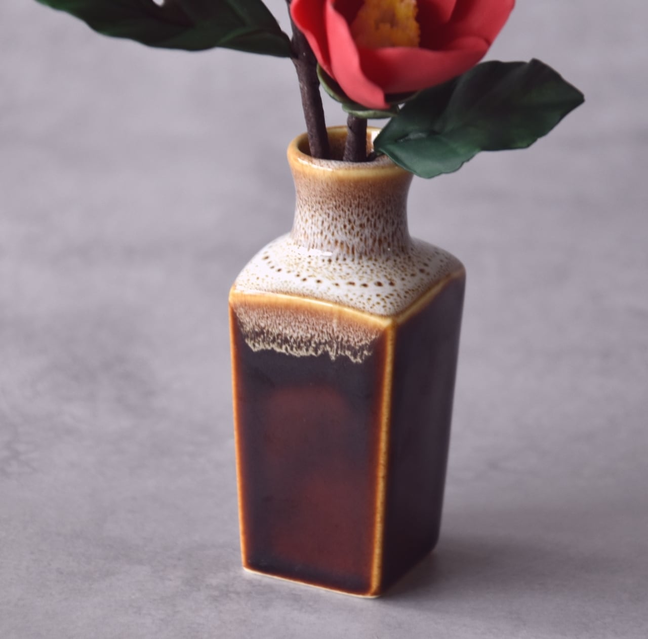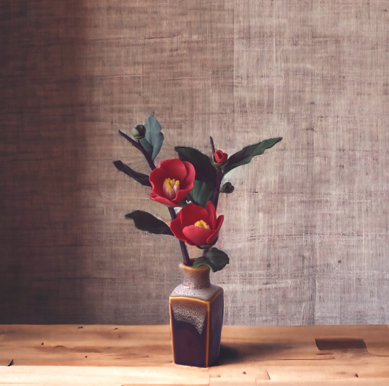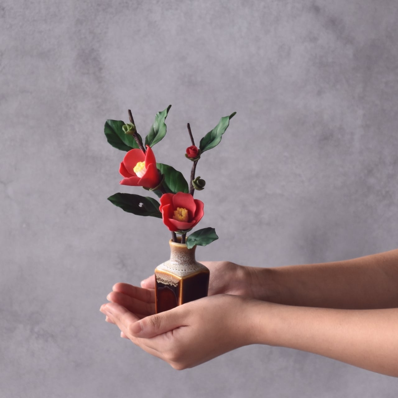 粘土で椿をつくり、小さなフラワーベースにアレンジしました。