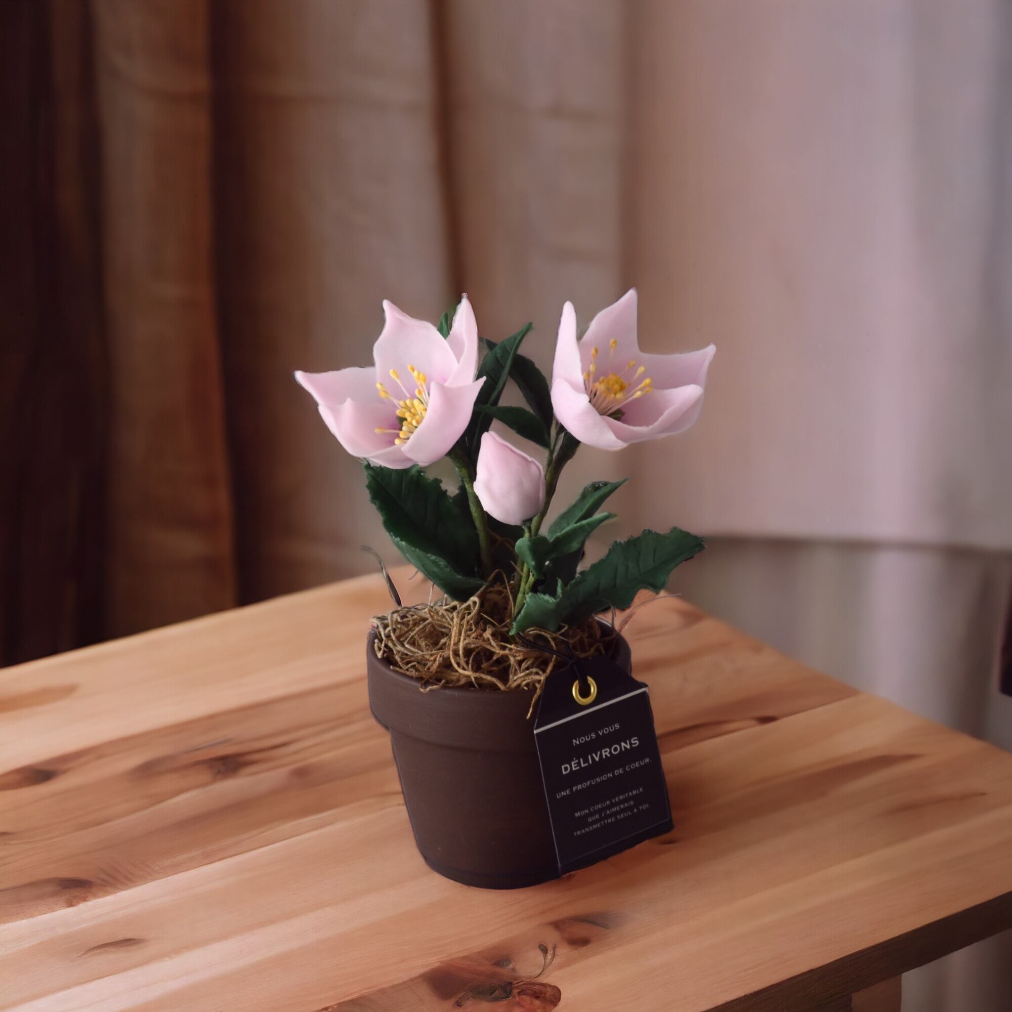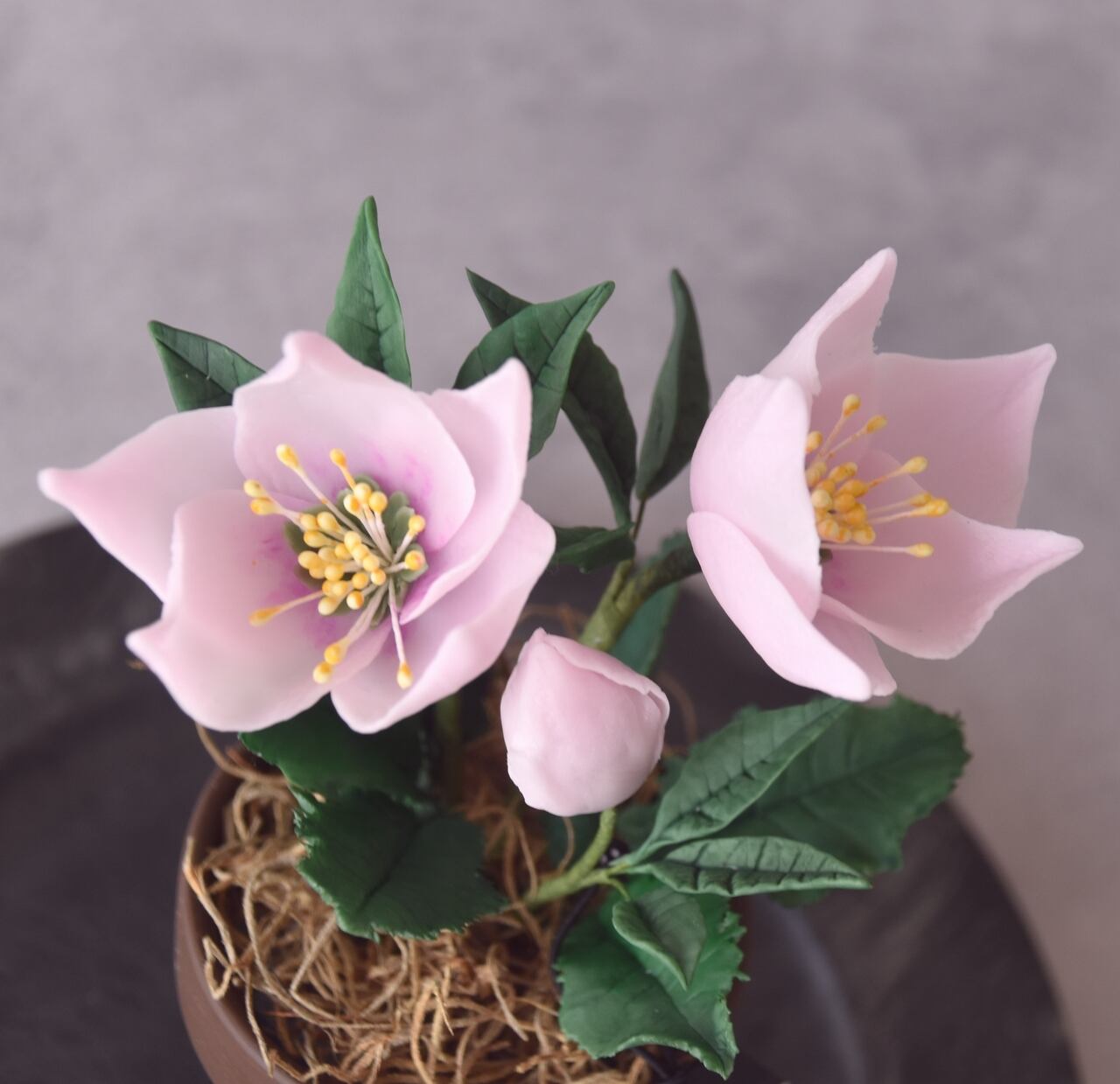 粘土でクリスマスローズを作り、小さなブランドポットに植え込みました。